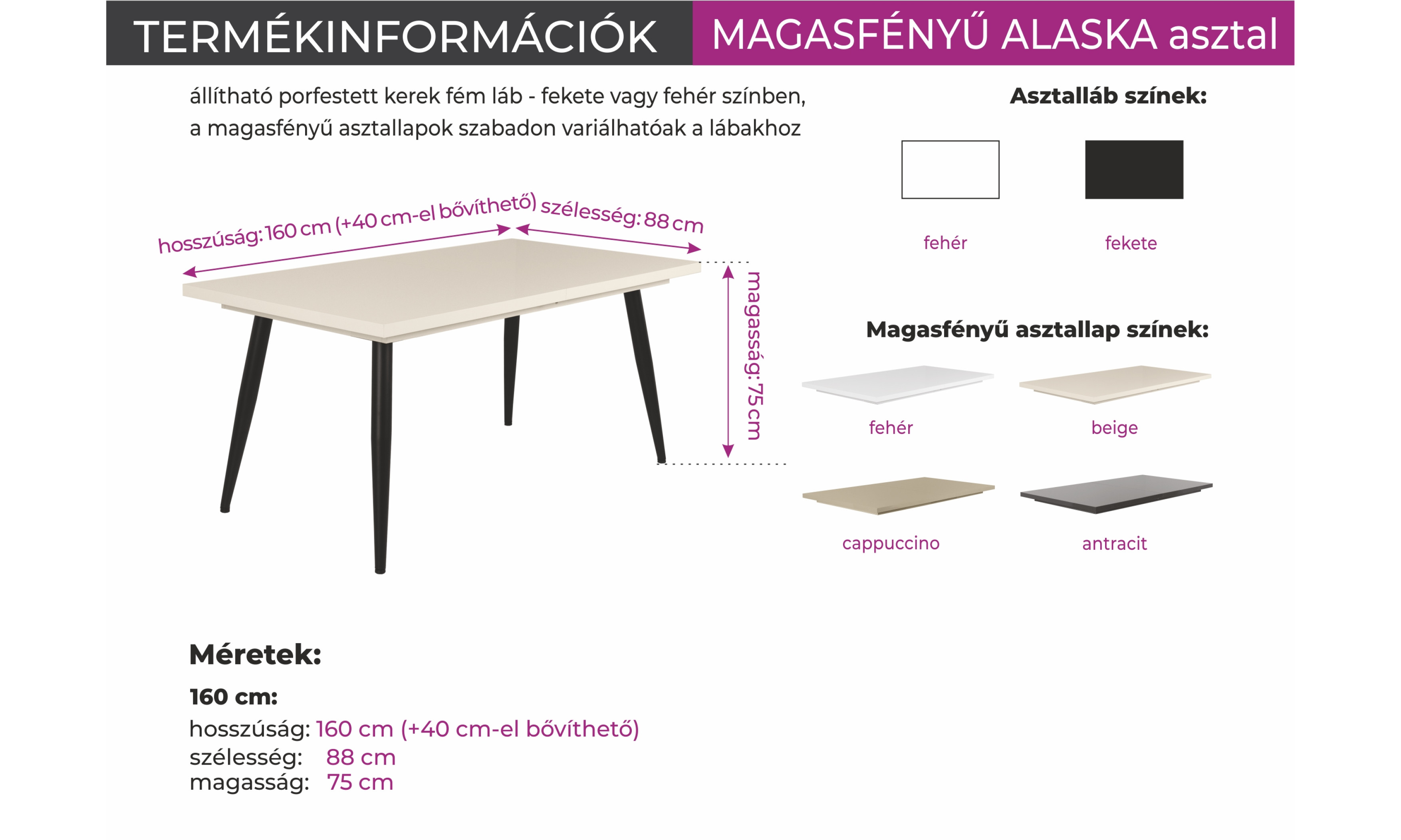 Állítható kerek porfestett fém láb. Kérhető fekete vagy fehér lábbal. A duplungolt, magasfényű asztallapok is szabadon variálhatóak a lábakhoz.