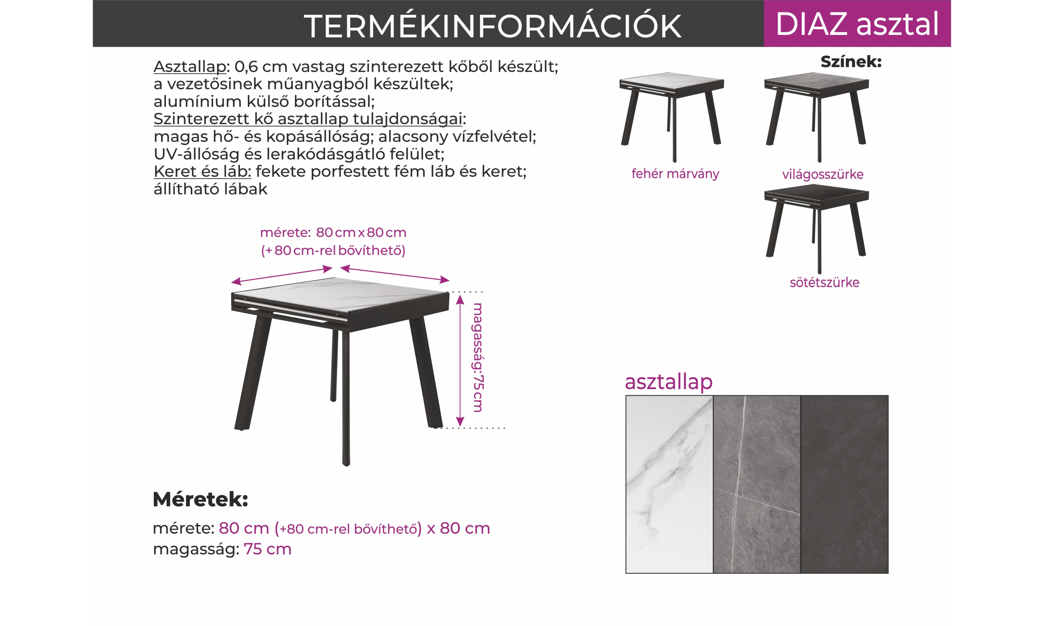 A Diaz egy húzó-toló, emelőszerkezetű étkezőasztal. Asztallapja 0,6 cm vastag szinterezett kőből készült, minden szinterezett kőlap mérete 80*80 cm.A vezetősínek műanyagból készültek, alumínium külső borítással. Fekete porfestett fém láb. Az asztallap hátulján 2 fém biztonsági retesz található. Az asztallábak alján állítható lábak vannak – ezek szöge a padlótól függően változtatható, hogy az asztal stabil maradjon. Szinterezett kő asztallap tulajdonságai: magas hő- és kopásállóság, alacsony vízfelvétel, UV-állóság és lerakódásgátló felület.