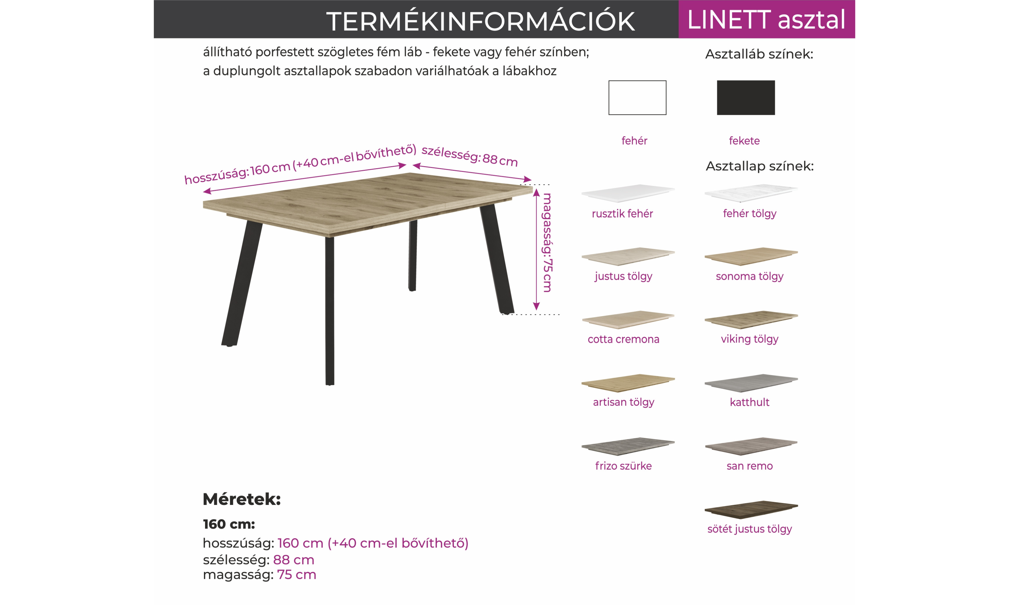 11-féle asztallap színhez szabadon választható fehér vagy fekete láb. A sokféle lehetőségnek köszönhetően könnyű megtalálni a színben otthonukba legjobban beilleszthető darabot. Asztallapja duplungolt, a porfestett szögletes fém láb állítható.