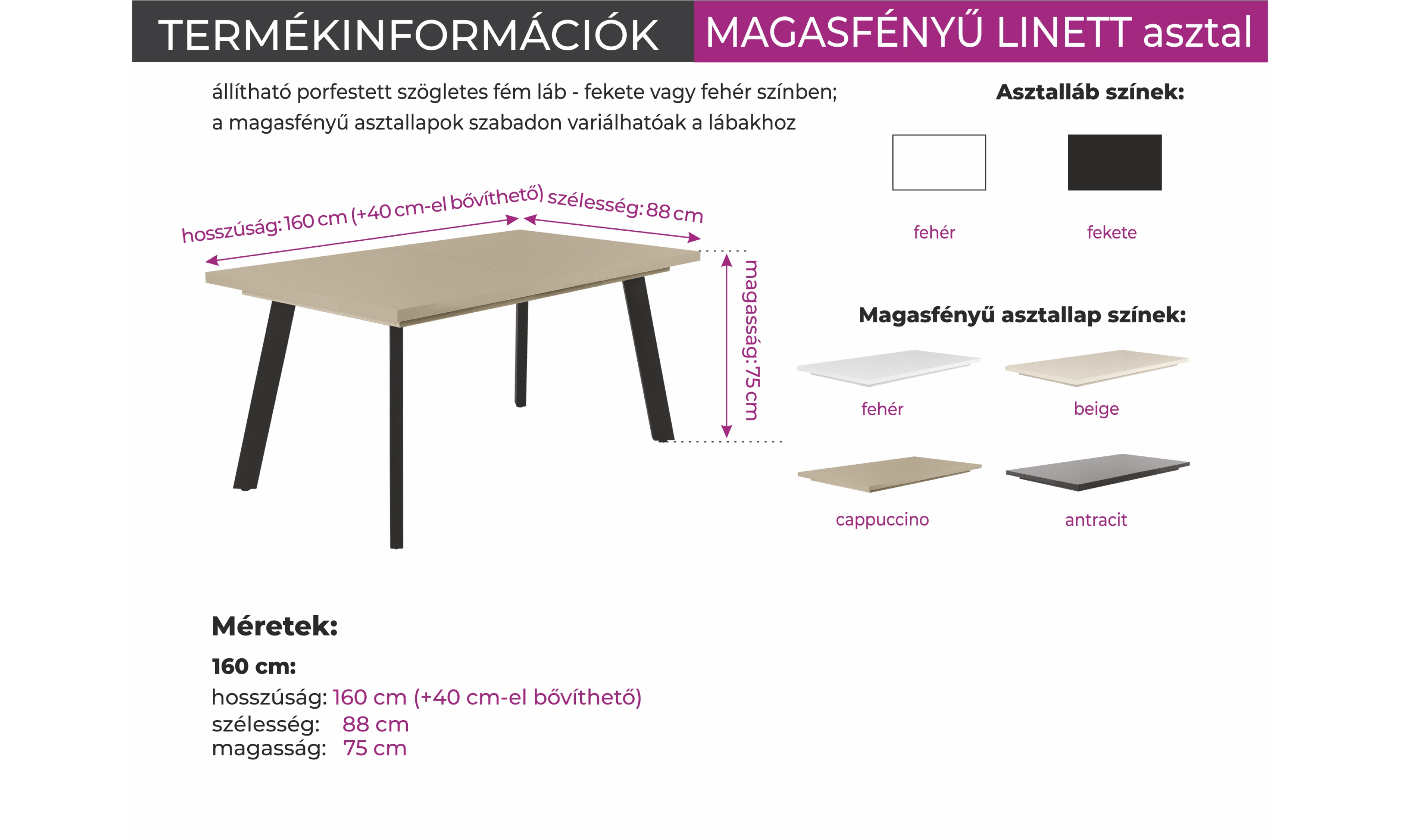4-féle asztallap színhez szabadon választható fehér vagy fekete láb. A sokféle lehetőségnek köszönhetően könnyű megtalálni a színben otthonukba legjobban beilleszthető darabot. Asztallapja duplungolt, a porfestett szögletes fém láb állítható.