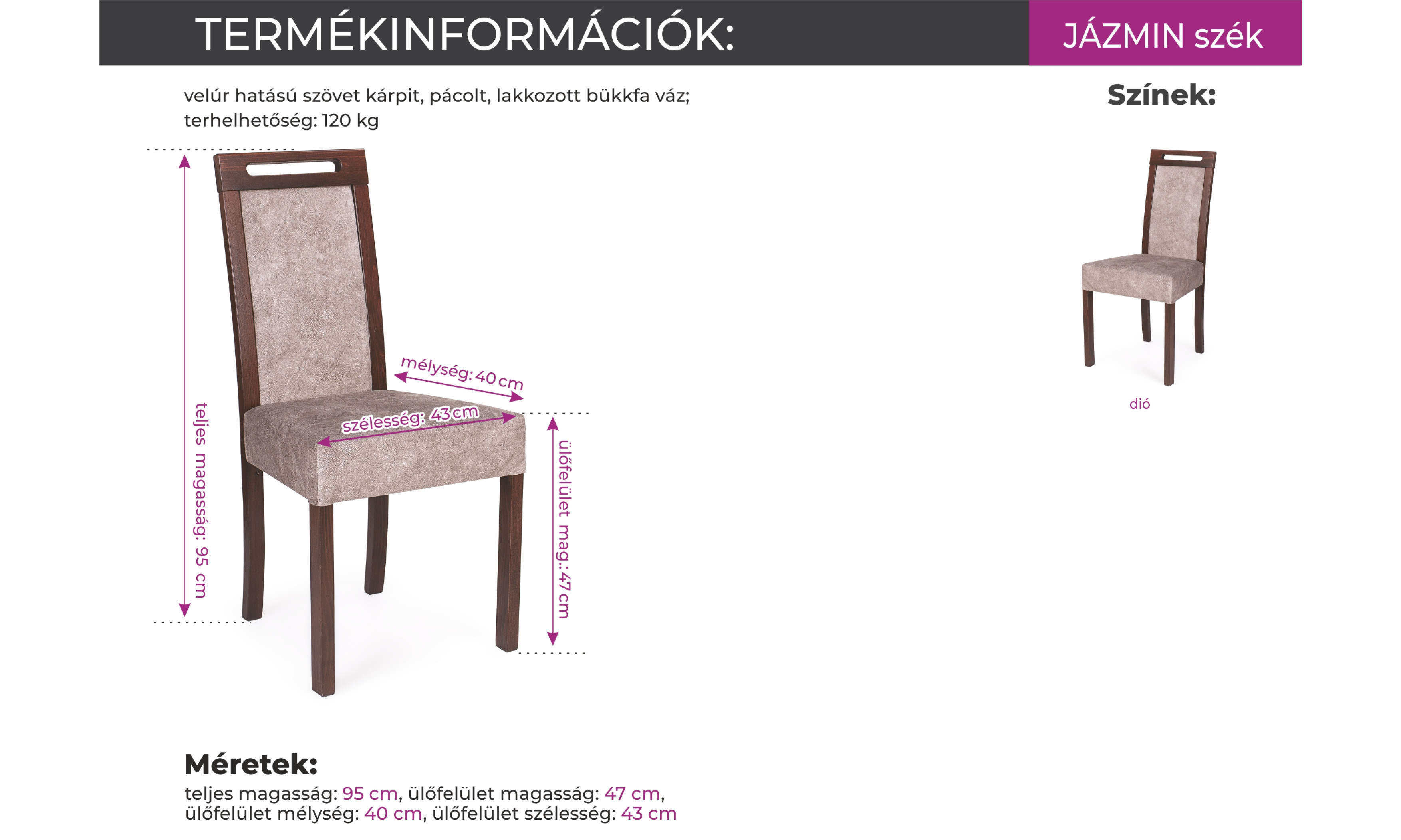 A Jázmin szék pácolt lakkozott bükkfa vázzal és puha velúr hatású kárpittal egy nagyon különleges szék. Ívelt háttámlája és vastagon szivacsozott ülőlapja tökéletes kényelmet biztosít, hosszú használat közben is. Remek választás étkezőkbe, ebédlőkbe.