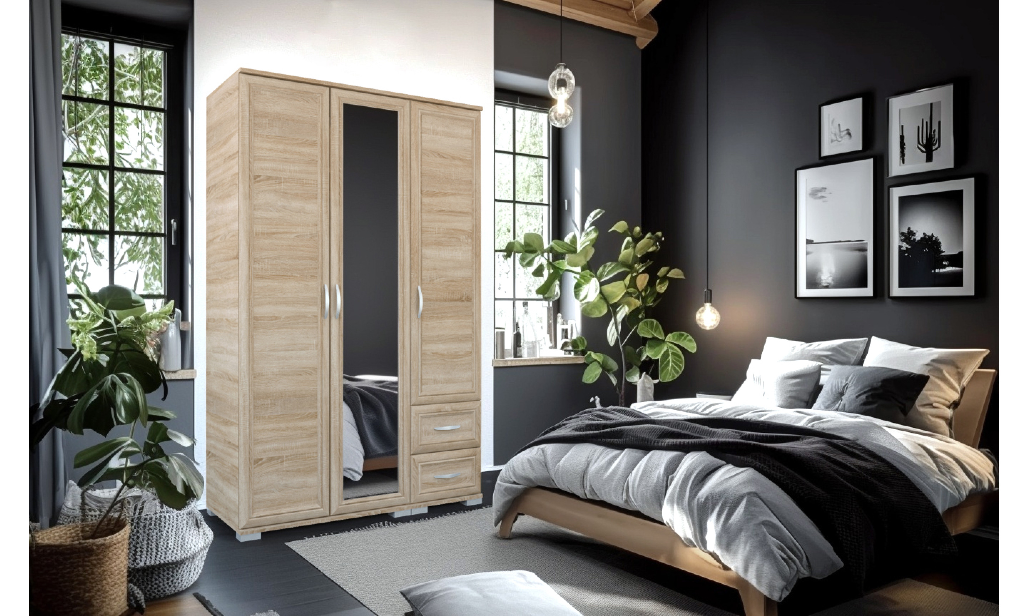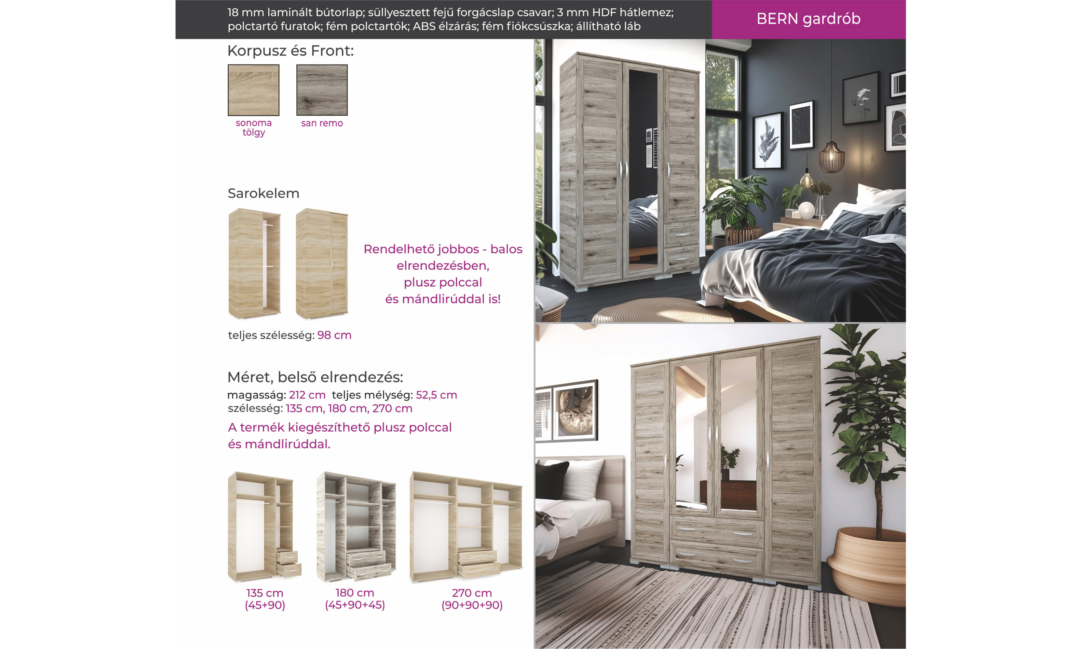 Elegáns, keretléces tükrös Bern gardróbunk sonoma tölgy és san remo színekben kapható. 135 cm, 180 cm és 270 cm-es méretben érhető el, melyekhez plusz sarokelem is rendelhető, ezzel jobban kihasználva a rendelkezésre álló teret.