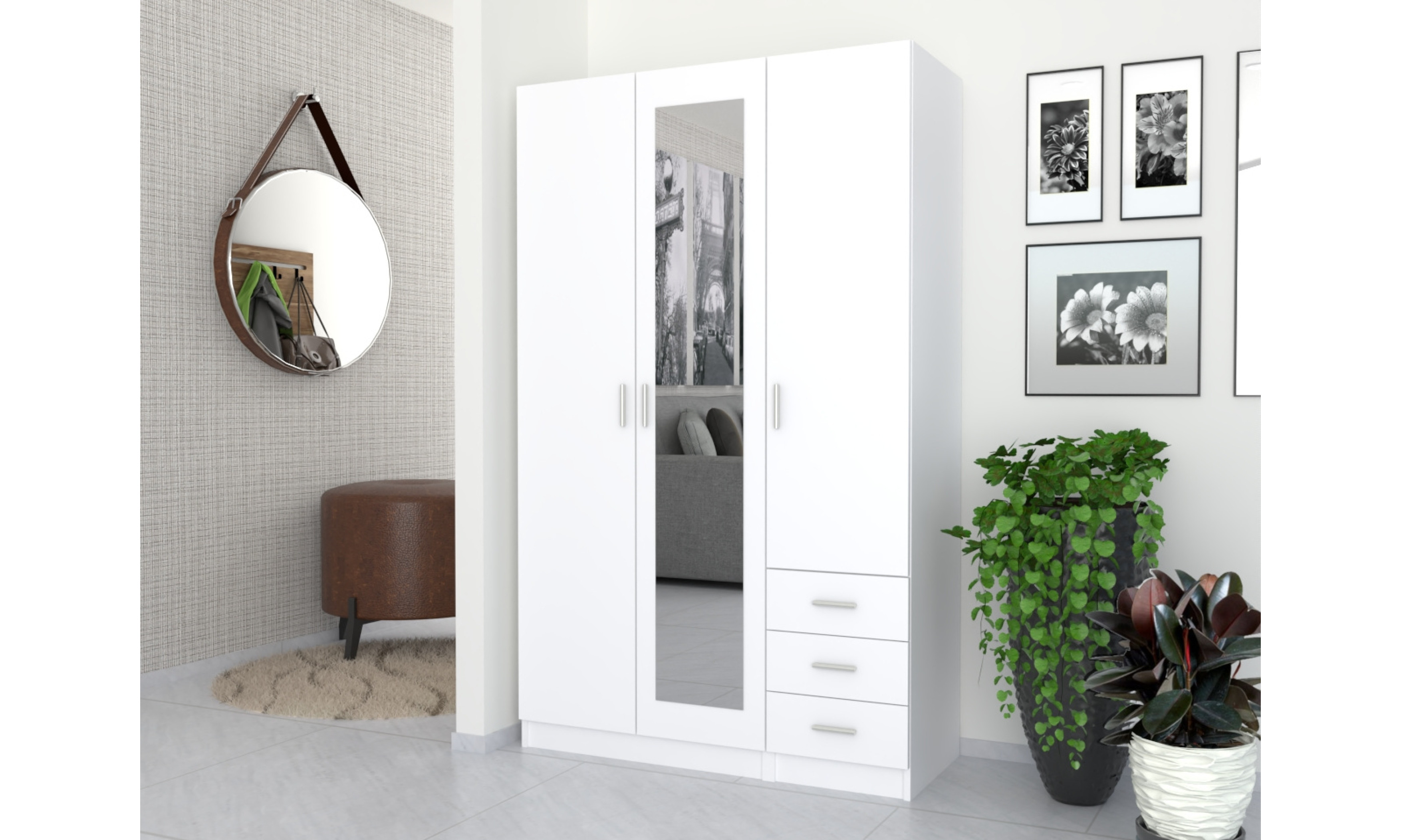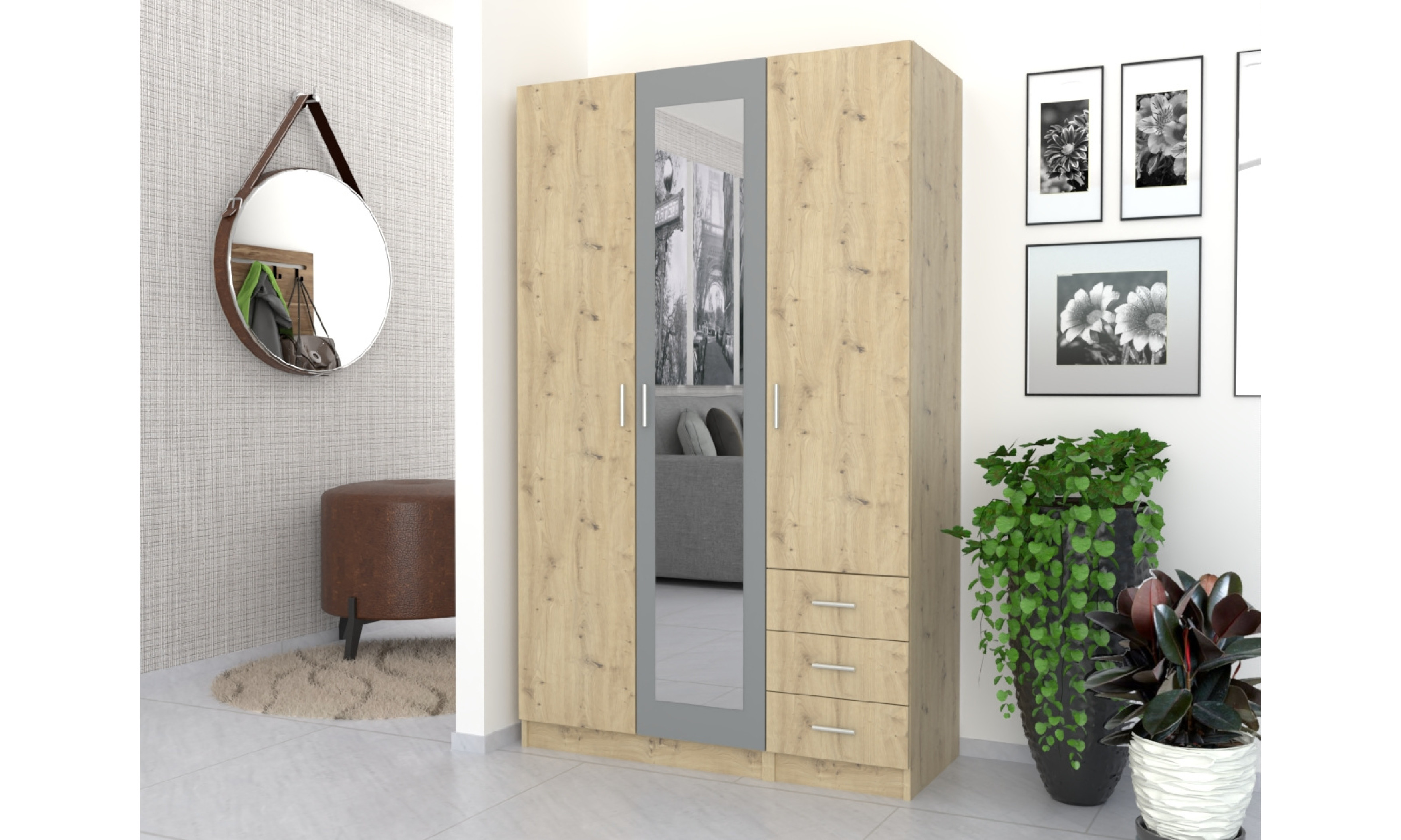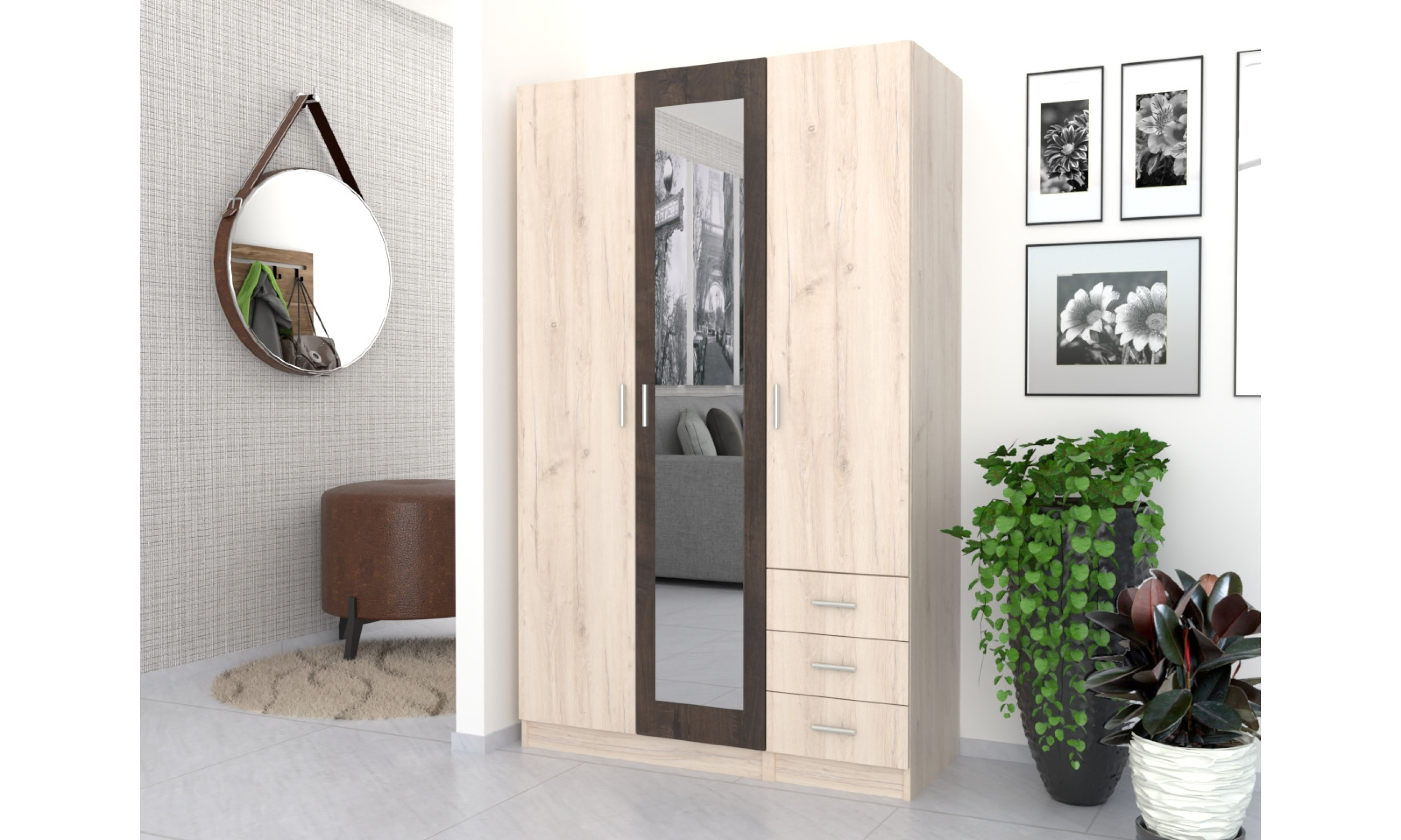 A két ajtós ruhás szekrényben egy darab polc és egy darab akasztórúd található. A fióksor feletti egyajtós zárt szekrényben 3 db polc található.