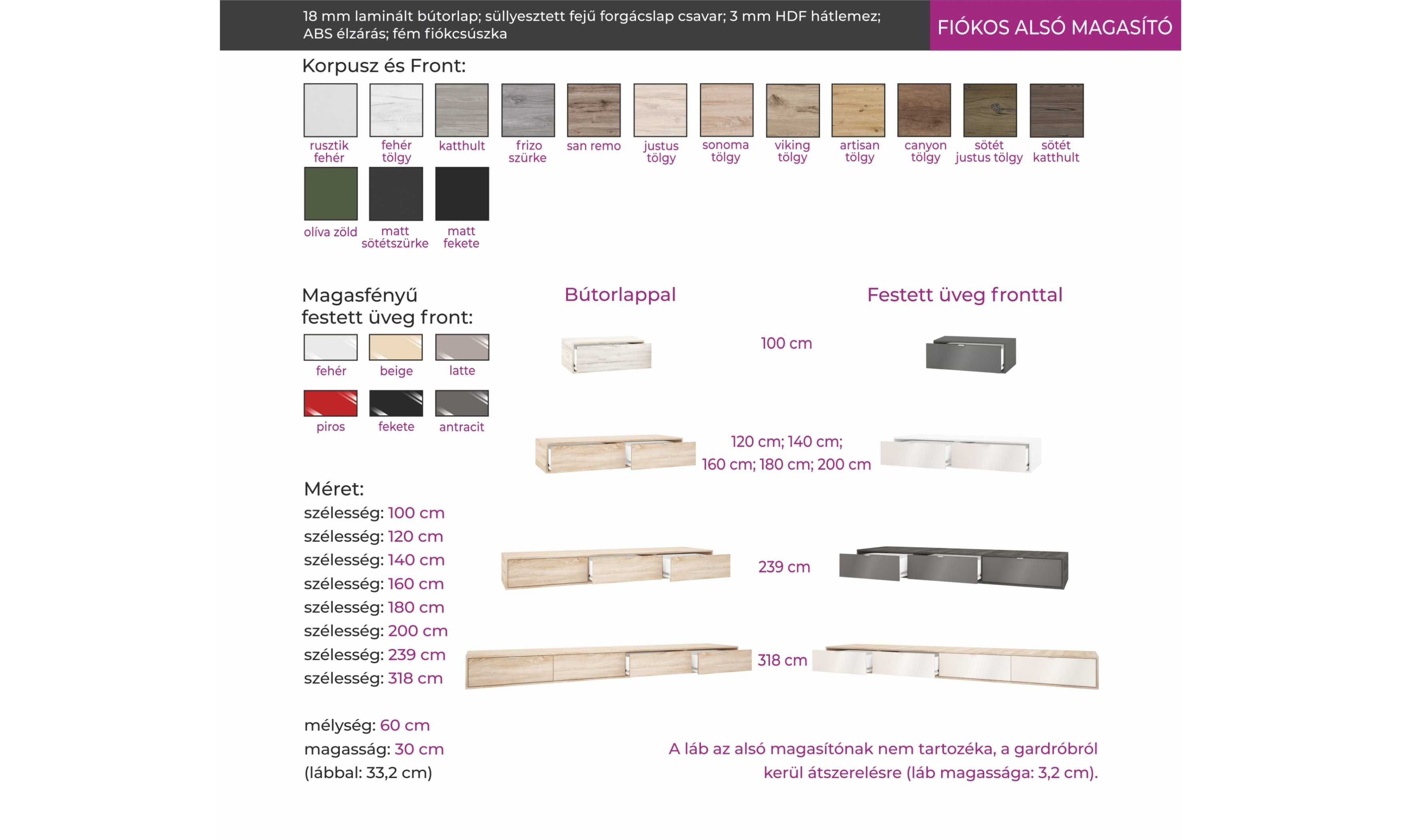 Opcionálisan rendelhető: alsó magasító, 100-318 cm-es méretű gardróbokhoz illetve a tolóajtós sarokelemhez. Opcionálisan rendelhető: magasfényű alsó magasító, 100-318 cm-es méretű gardróbokhoz illetve a tolóajtós sarokelemhez. A fiókos magasítónak nem tartozéka a láb. Ha önálló termékként szeretné megvásárolni, külön meg kell rendelni hozzá a lábakat. Ha gardróbbal együtt vásárolja meg, a gardrób lábát át lehet szerelni a magasítóra.