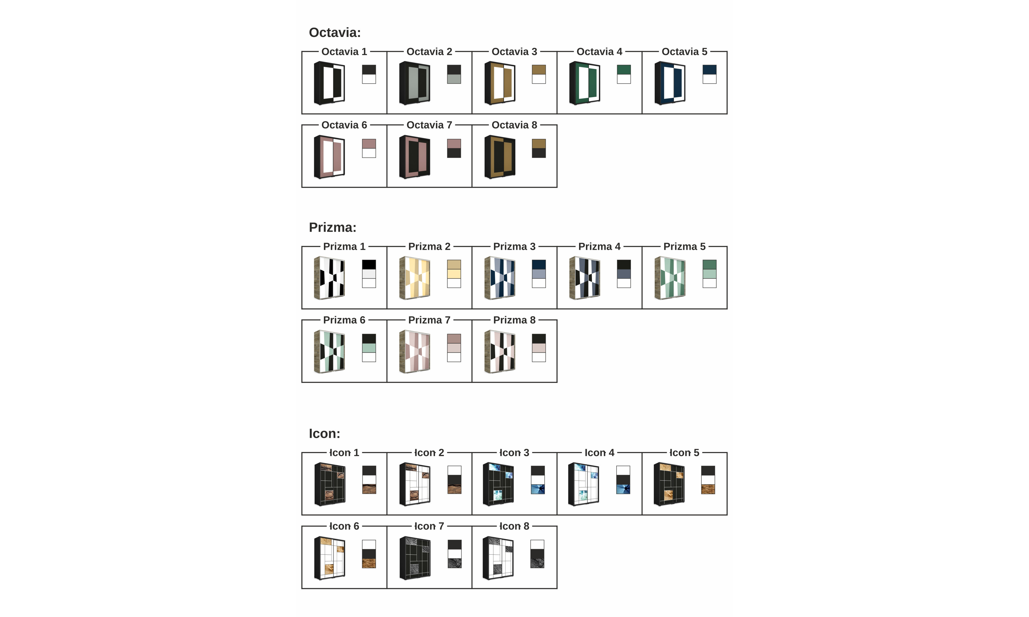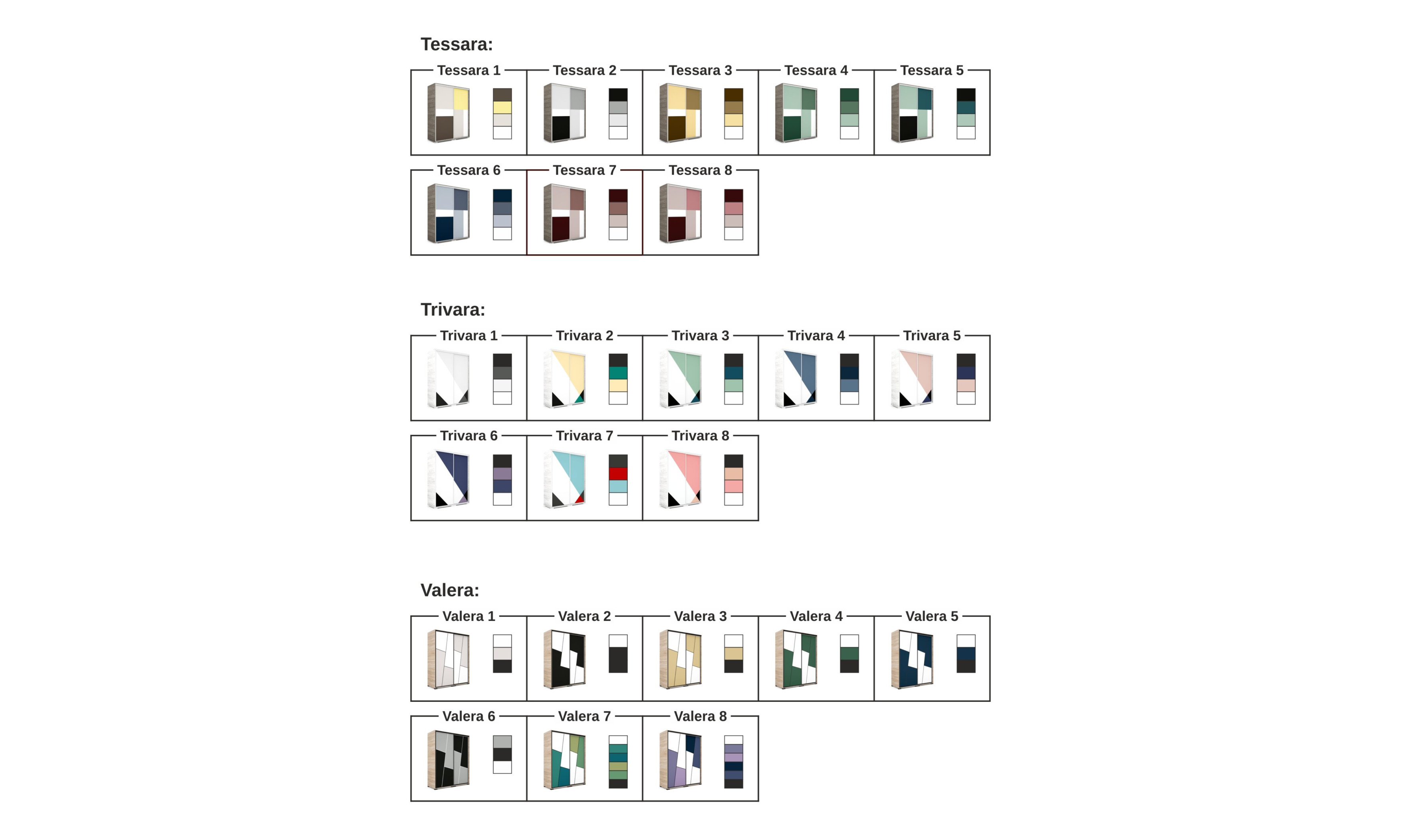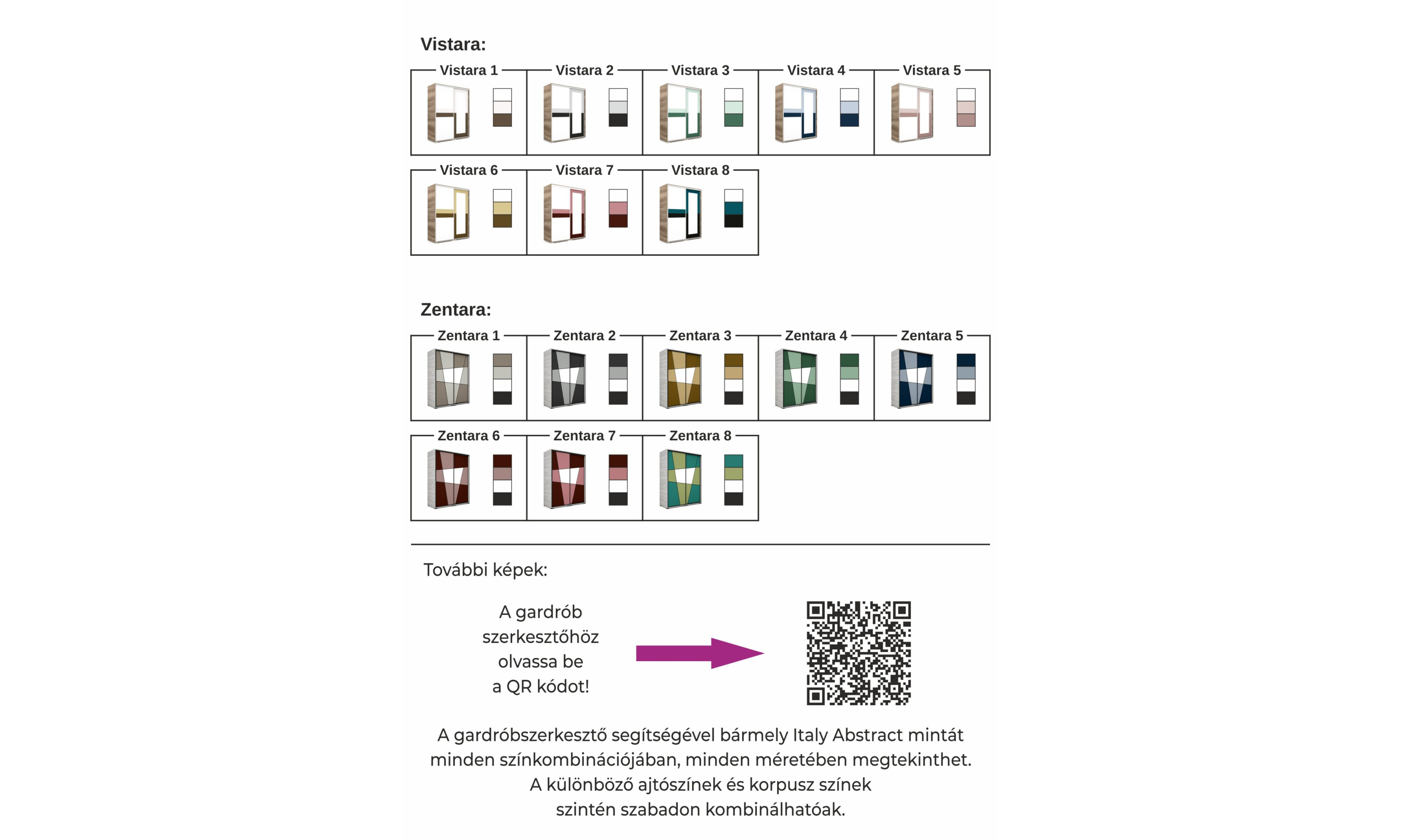 Minden minta 8 különféle színváltozatban érhető el, így összesen 88 egyedi kombináció közül lehet válogatni. Ezeken felül még korpusz színt, és profil színt és méretet is számos lehetőség közül választhat.