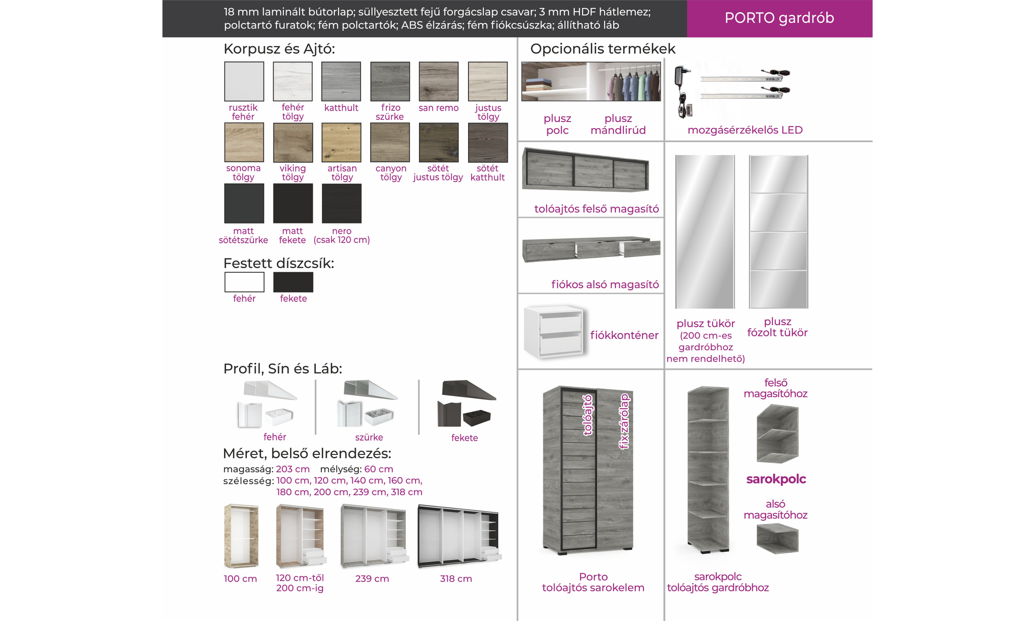 A Porto gardrób 8 féle méretben kapható, és 16 féle bútorlapszín közül lehet választani. A gardrób egyedi, elegáns megjelenését a festett csíkozásnak köszönheti. A vízszintes vonalak harmóniája nyugalmat és eleganciát sugároz. A variálhatóságának köszönhetően bárki a maga ízlésére tudja szabni a gardróbot. Belső elrendezése, a gardróbjainknál már megszokott praktikusságot tükrözi. Opcionálisan választható termékek: – sarokpolc – tolóajtós sarokelem – fózolt tükör – tükör – fiókos alsó magasító – tolóajtós felső magasító.