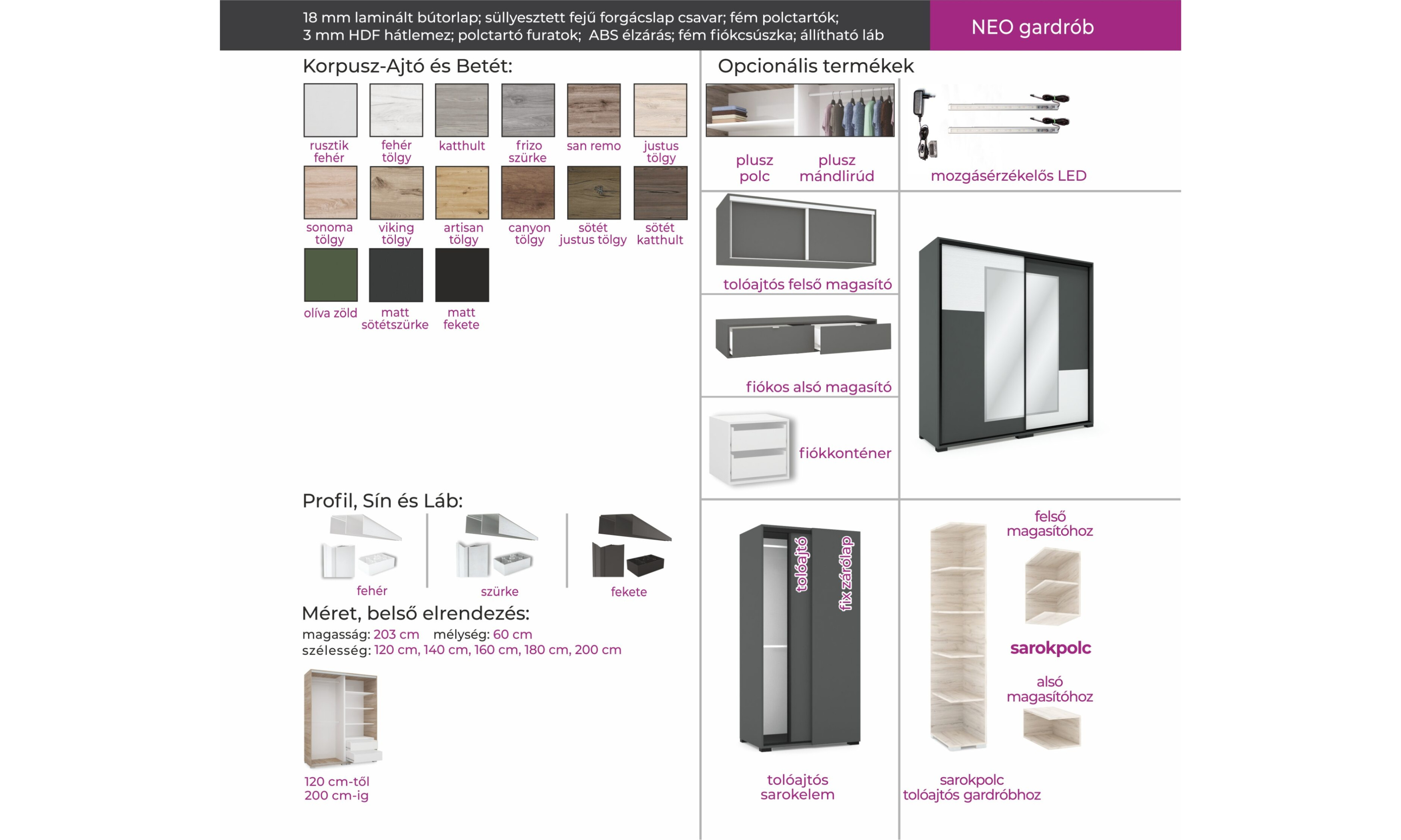 A Neo gardrób tolóajtaja különleges betétet kapott, ami az ajtó színével szabadon variálható. A gardrób 5 méretben kapható. Kiegészíthető magasítókkal, sarokelemmel vagy akár sarokpolccal is. A gardróbhoz rendelhető még plusz fiókkonténer és polc is.