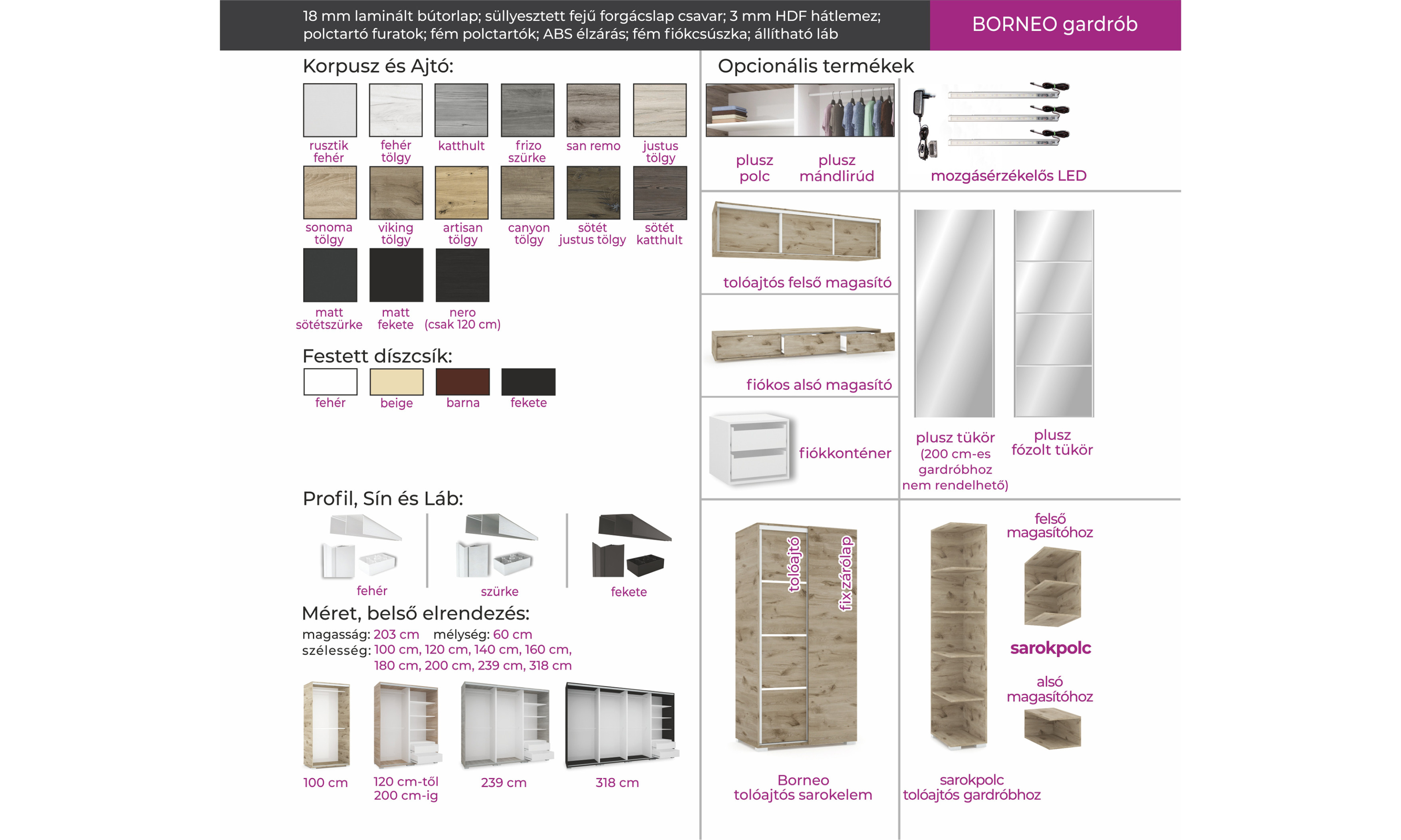 Különleges, díszcsíkkal ellátott Borneo gardróbunk széles szín- és méretválasztékának köszönhetően mindenki megtalálhatja a számára legideálisabb darabot otthonába. Többféle szín közül választhatunk. Kisebb hálókba ajánljuk a 2 ajtós kiviteleket, amelyek 100, 120, 140, 160, 180 és 200 cm-es méretben kaphatóak, míg akinek nagyobb tér áll rendelkezésre a 239 vagy 318 cm-es méret is rendelkezésre áll. Opcionálisan választható termékek: – sarokpolc – tolóajtós sarokelem – fózolt tükör – tükör – fiókos alsó magasító – tolóajtós felső magasító.