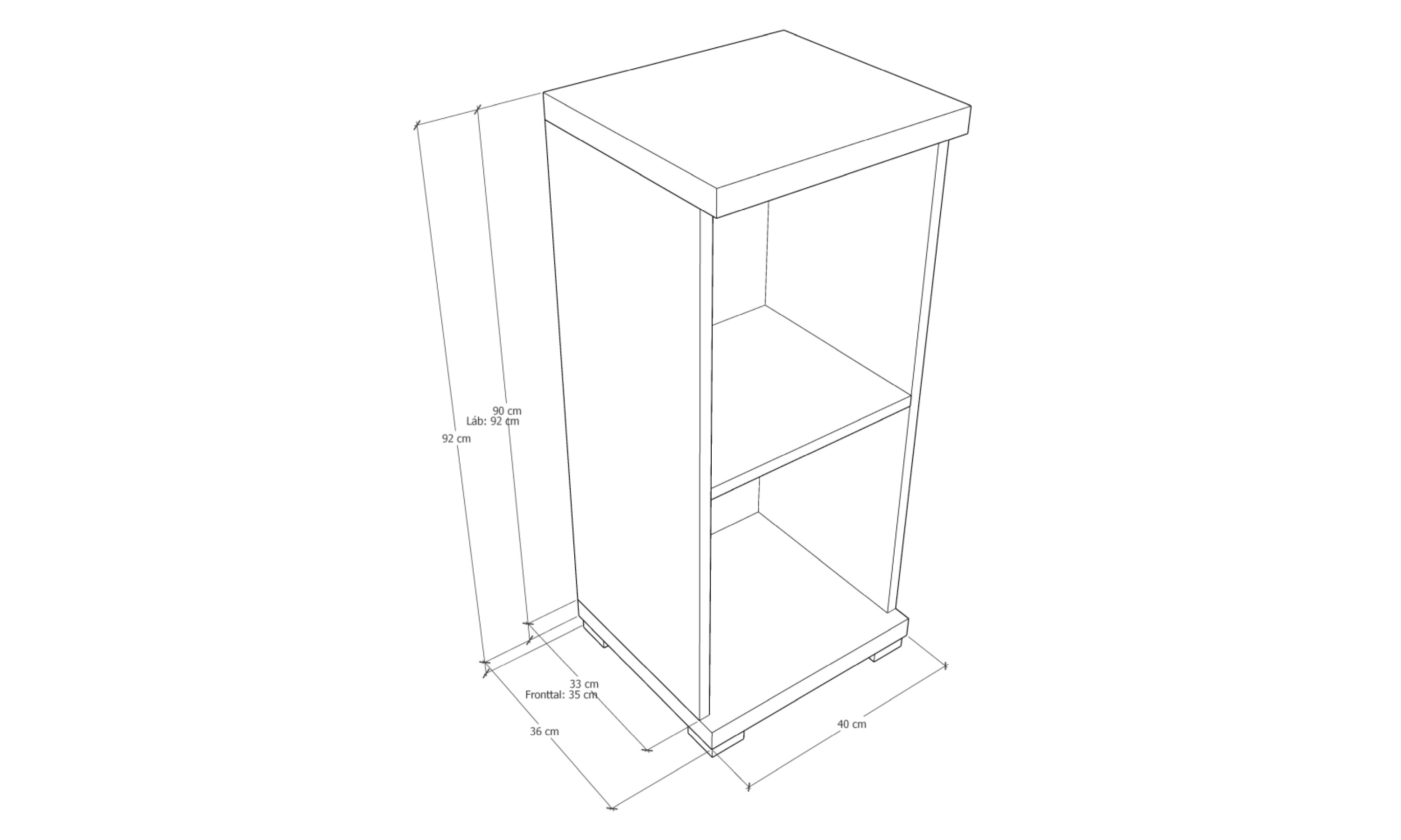 Az iroda elem 18 mm-es laminált bútorlapból ABS élzárással és köldökcsapozással készül. A hátfal fehér színű 2,5 mm-es HDF lemez, mely tűzőkapoccsal van rögzítve.
