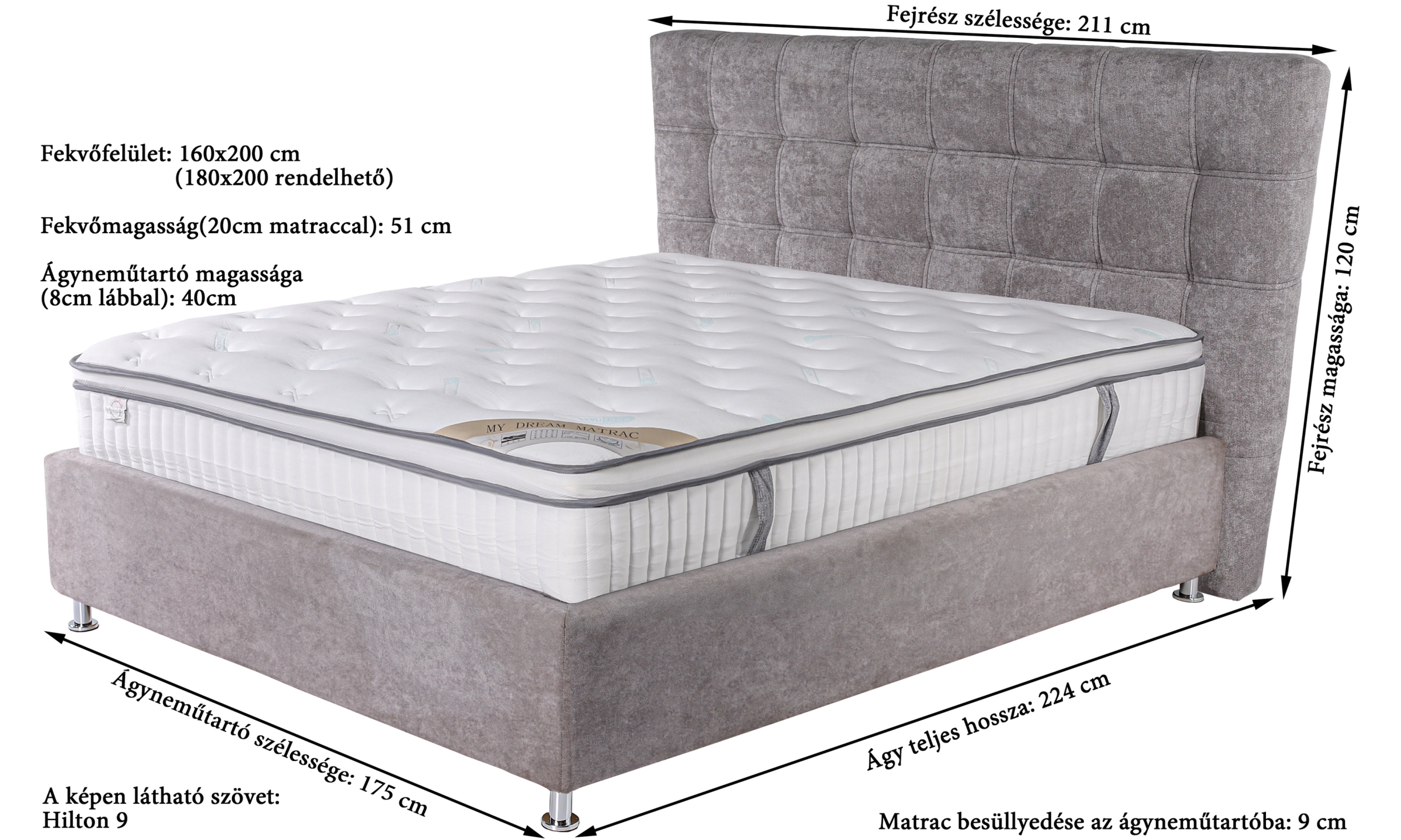 Fekvőfelület: 160 cm x 200 cm