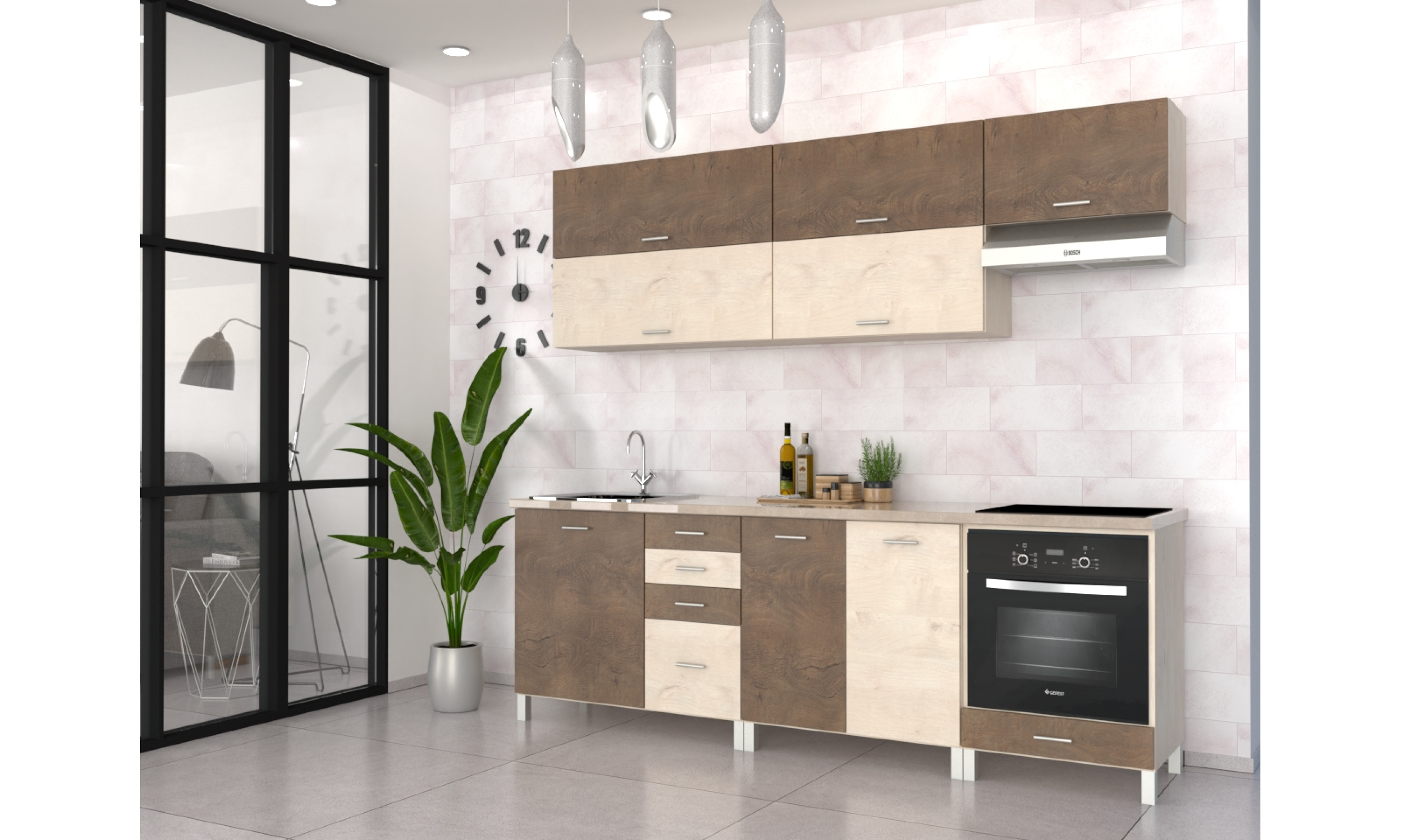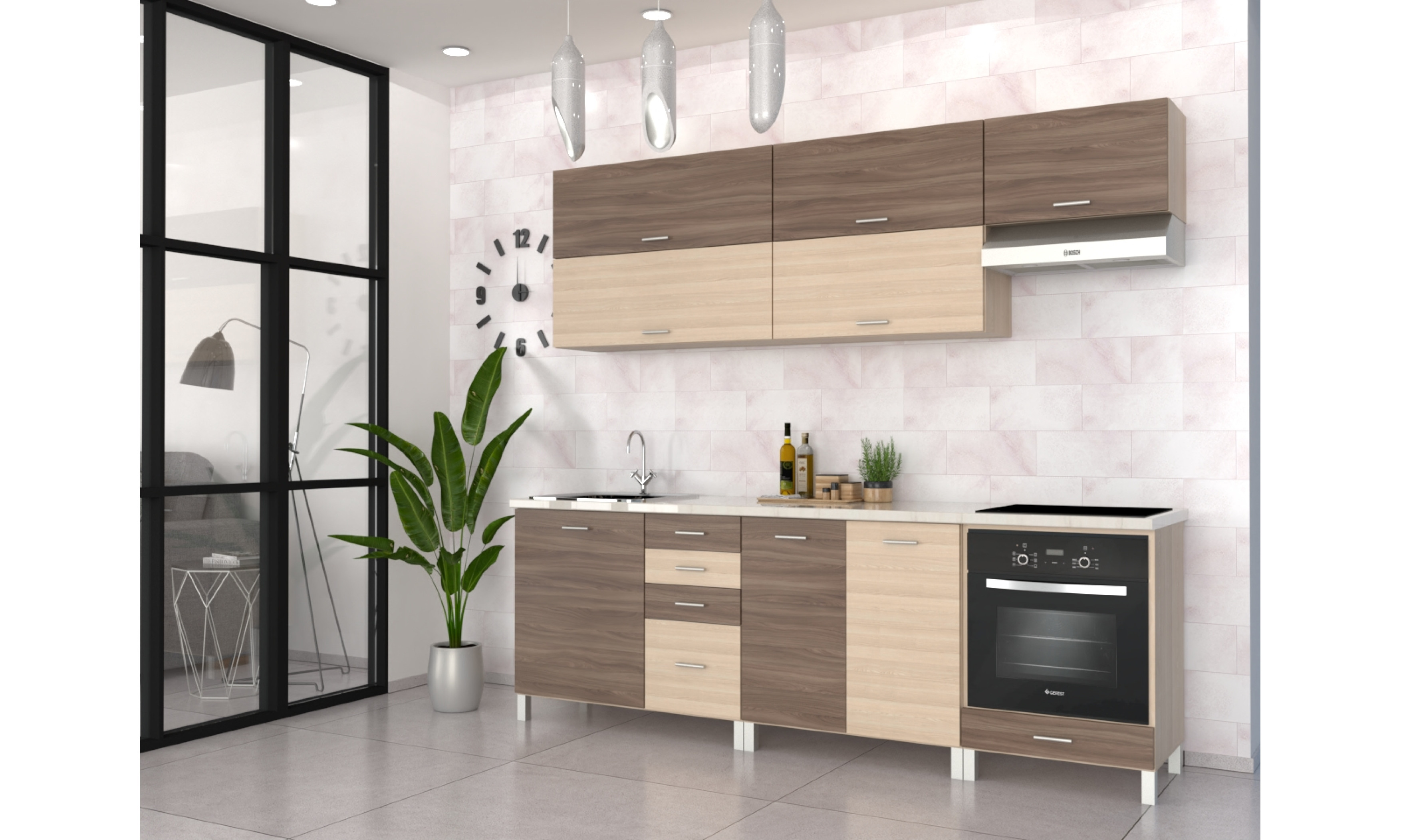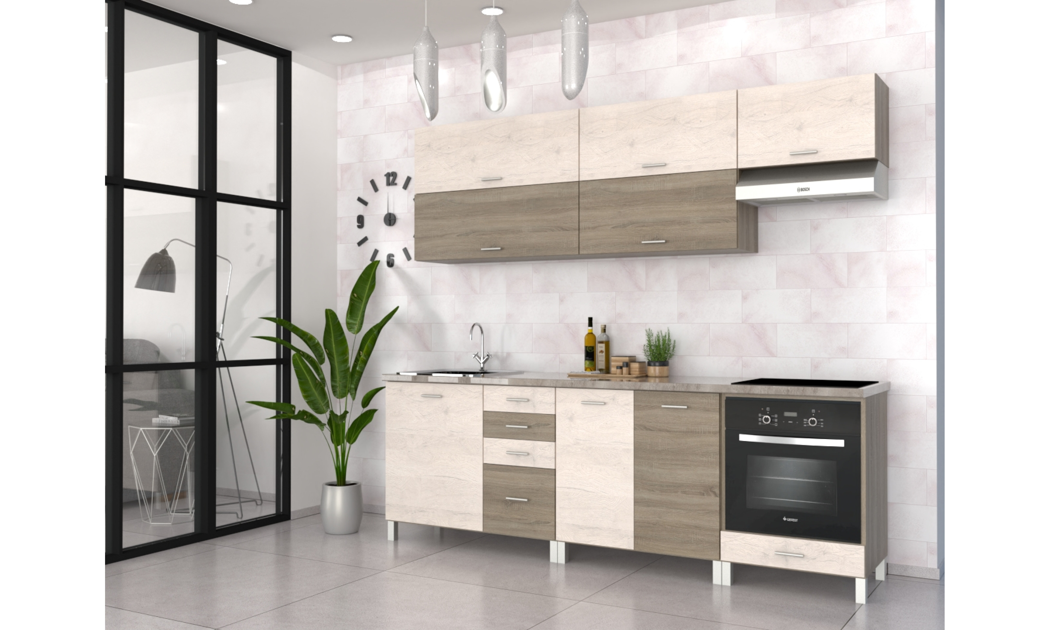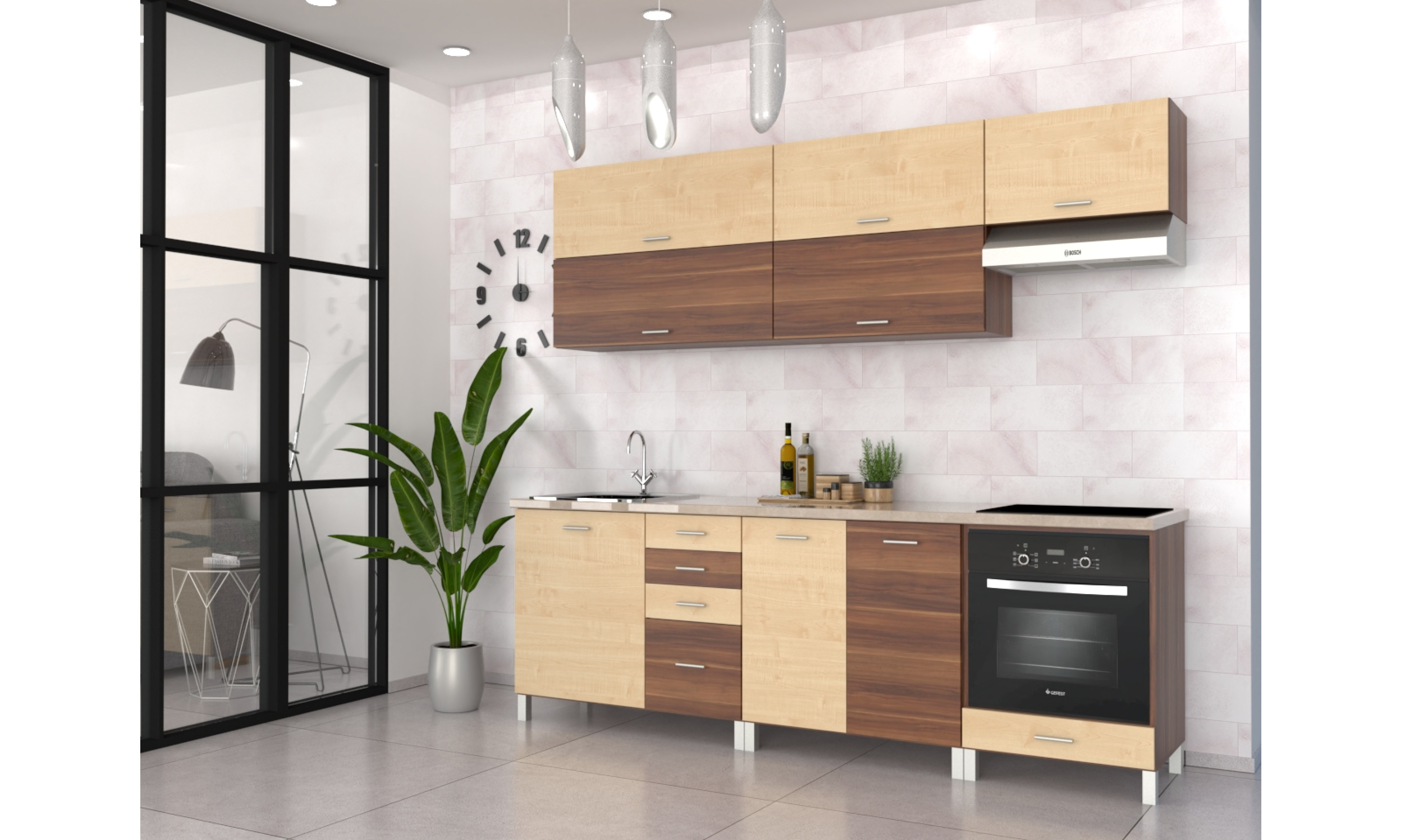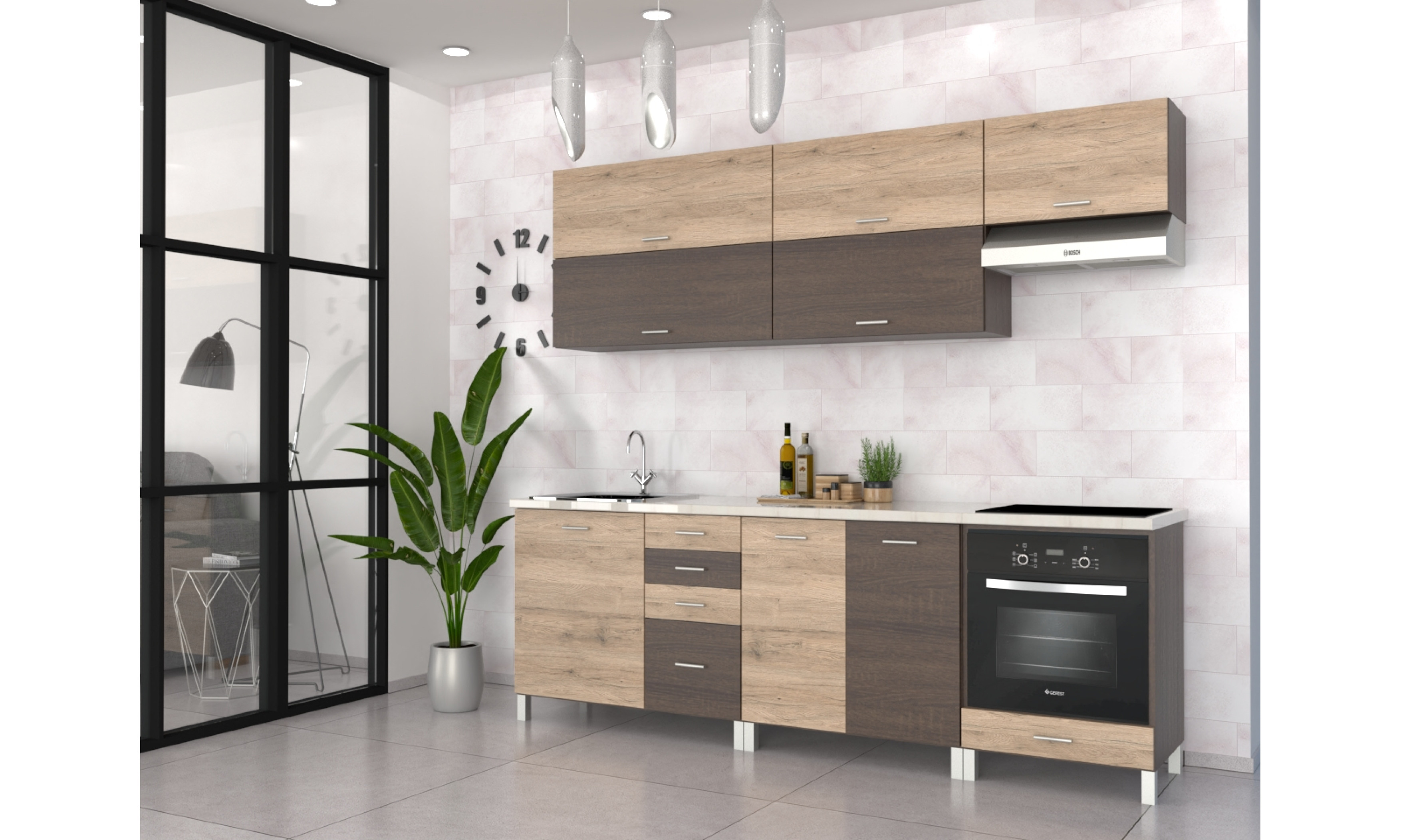 A konyhaszekrény teljes szélessége 240 cm, az alsó szekrények mélysége 48 cm + front (2 cm), a munkalap mélysége 60 cm. A felső szekrények magassága 72,5 cm, mélysége 30 cm + front (2 cm).