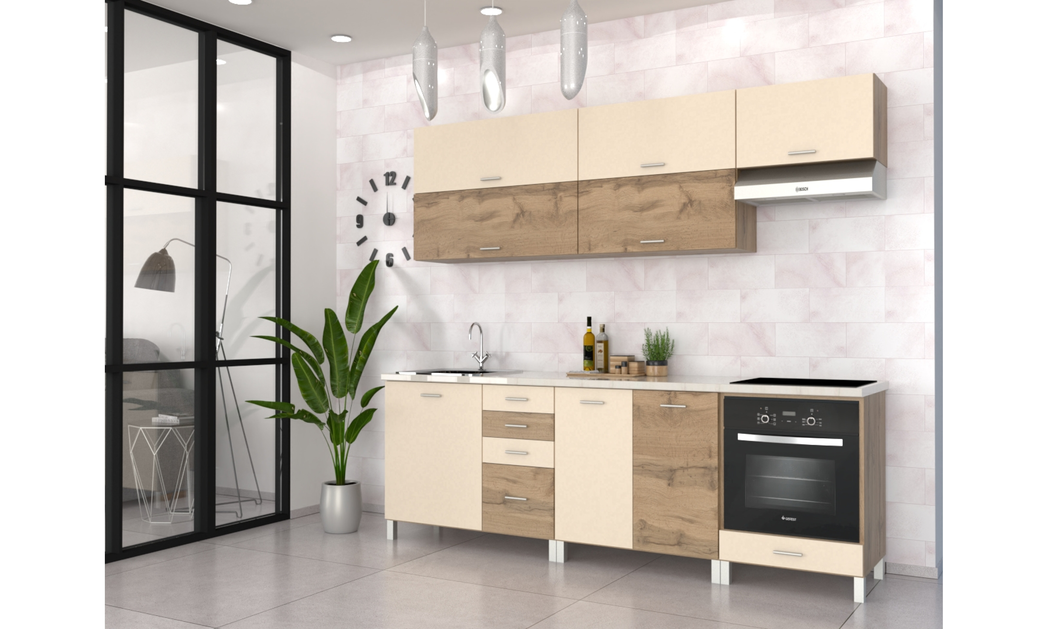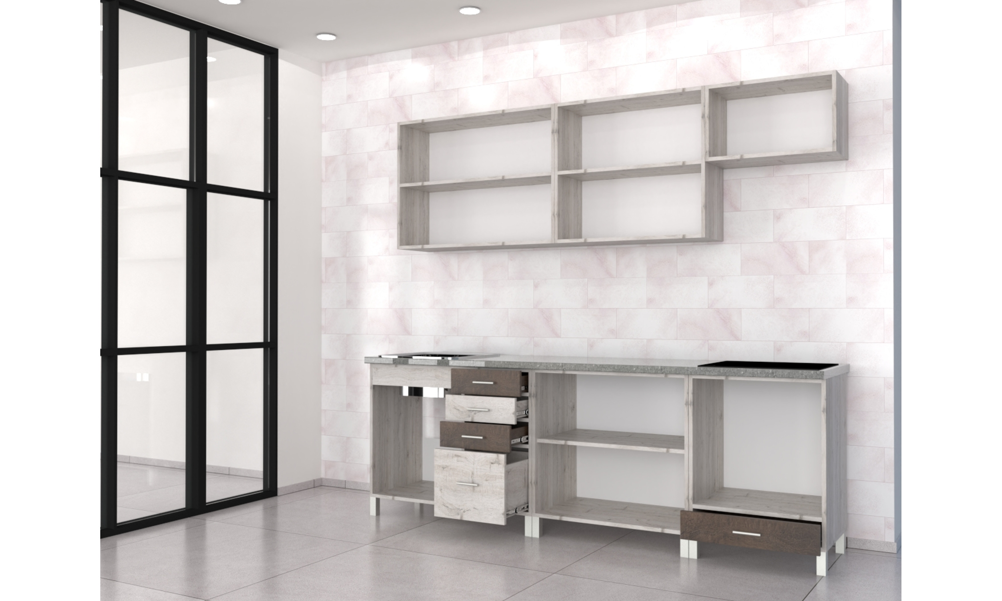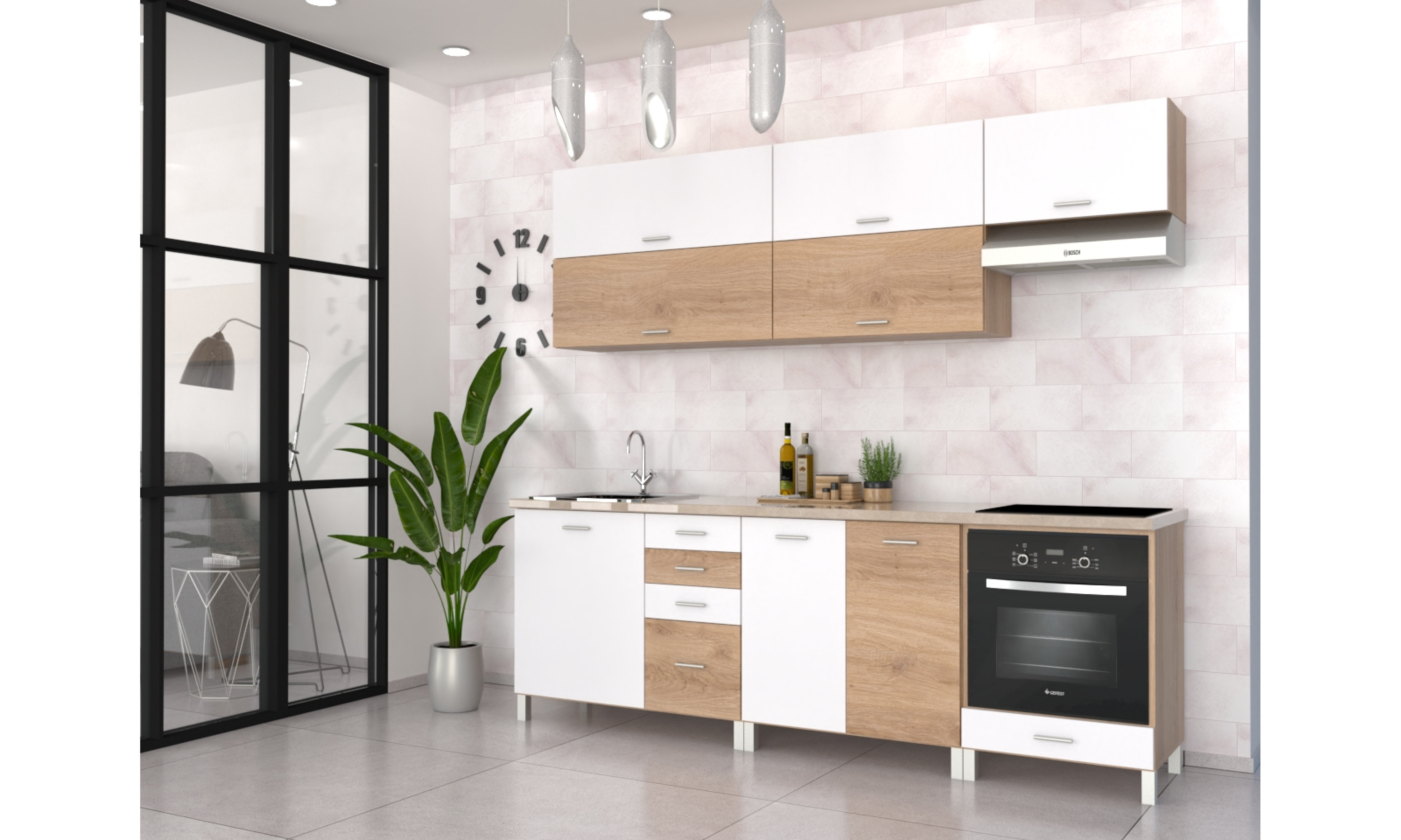 A konyhaszekrény 18 mm-es laminált bútorlapból ABS élzárással és köldökcsapozással készül. A hátfal a zárt részeken fehér 2,5 mm-es HDF lemez, mely tűzőkapoccsal van rögzítve. A fiók fém fiókcsúszóval készül. Az ajtó szintén 18 mm-es bútorlapból készül.