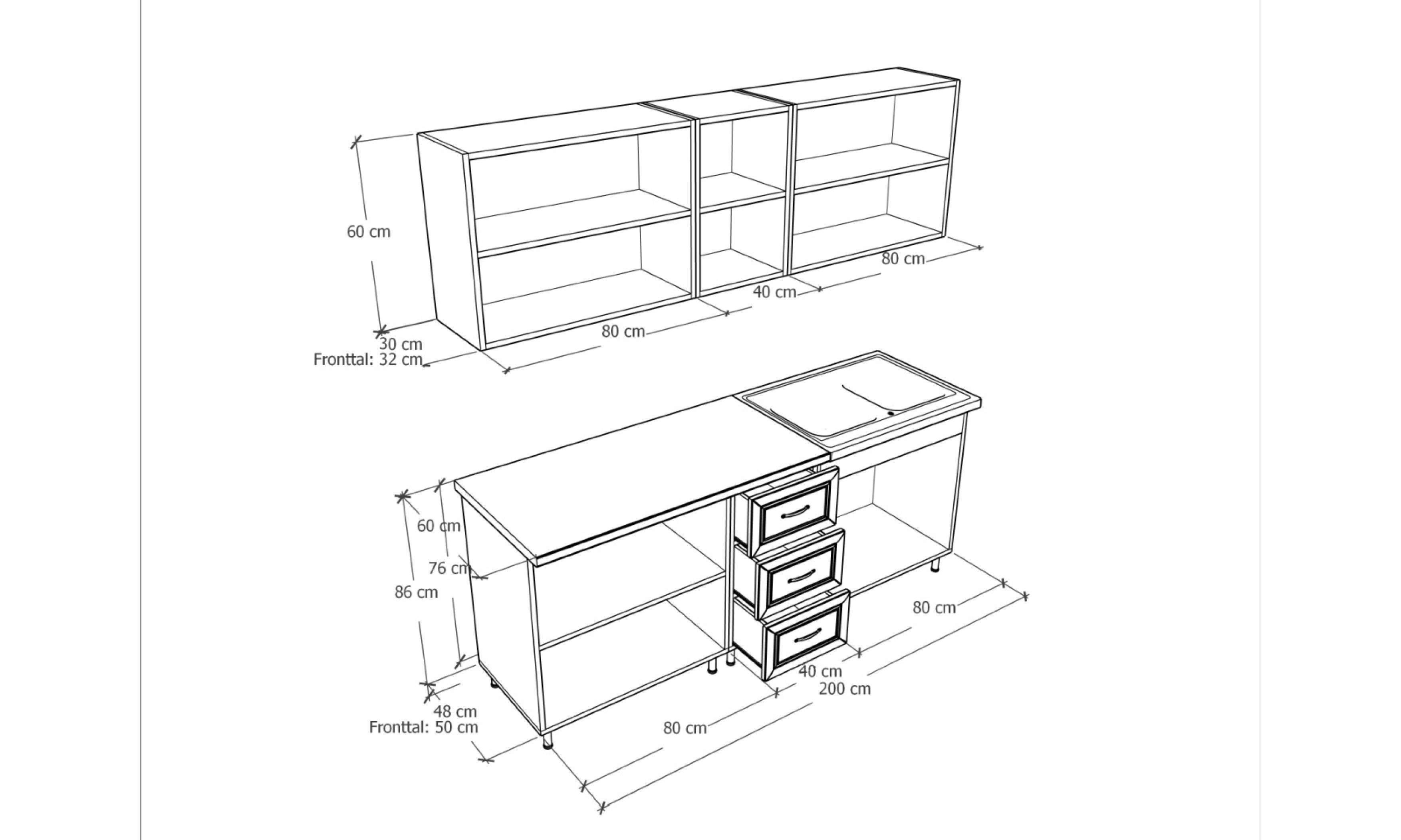 A konyhaszekrény teljes szélessége 200 cm, az alsó szekrények testmélysége 48 cm + front, a munkalap mélysége 60 cm. A felső szekrények magassága 60 cm (a felső szekrények magassága választható.), mélysége 30 cm + front.