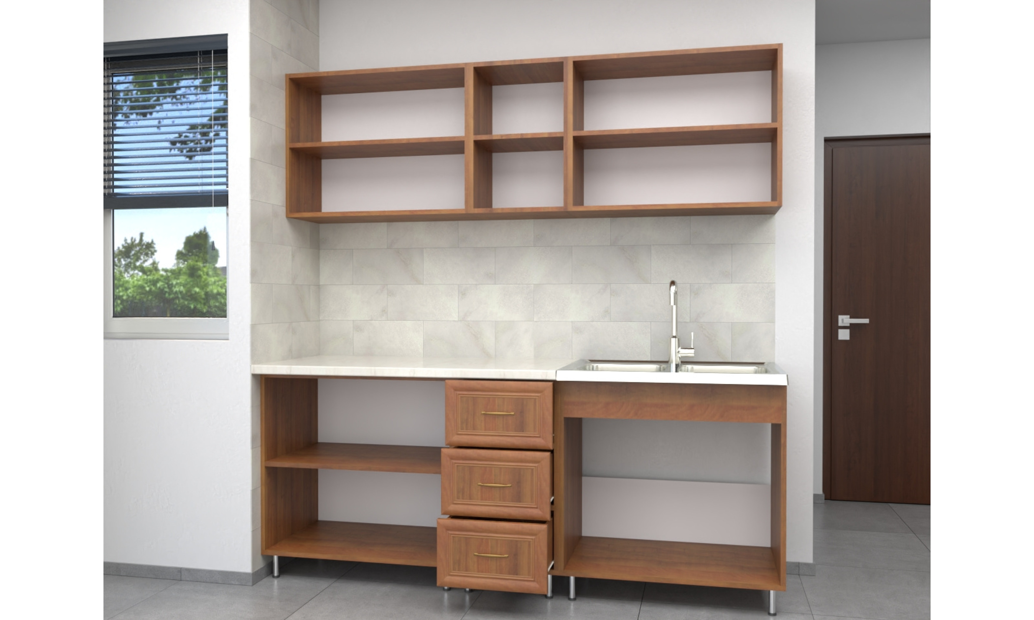 A konyhaszekrény 18 mm-es laminált bútorlapból ABS élzárással és köldökcsapozással készül. A hátfal a zárt részeken fehér 2,5 mm-es HDF lemez, mely tűzőkapoccsal van rögzítve. A fiók fém fiókcsúszóval készül. Az ajtó szintén 18 mm-es bútorlapból készül, amely keretléccel van díszítve. A keretléc rögzítése ragasztóval, illetve tűszeggel történik, melynek a helye minimálisan látható.