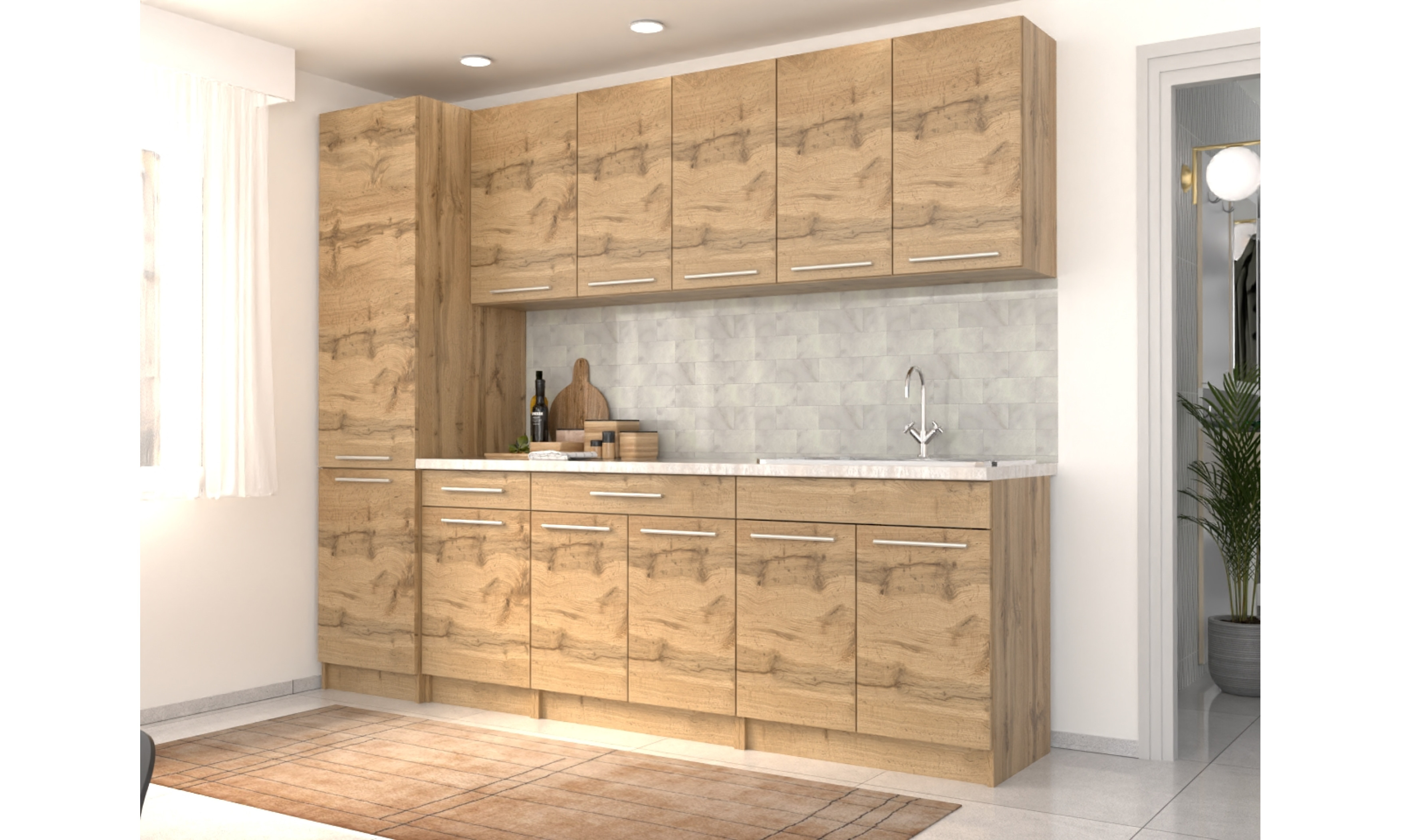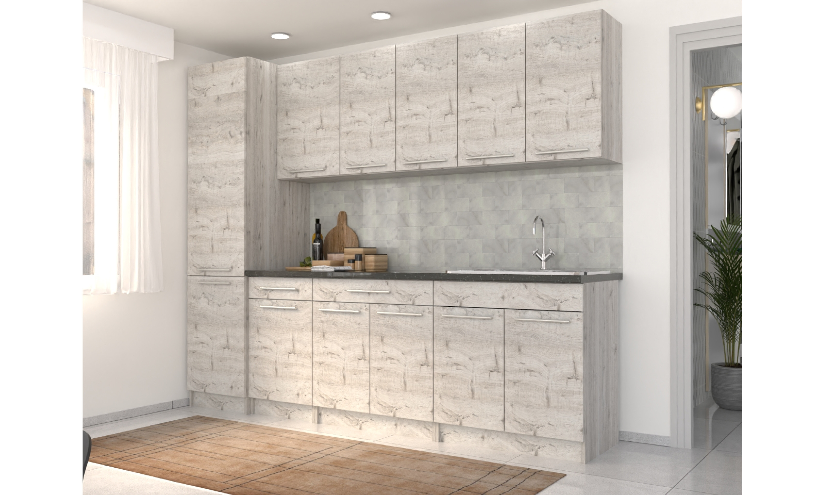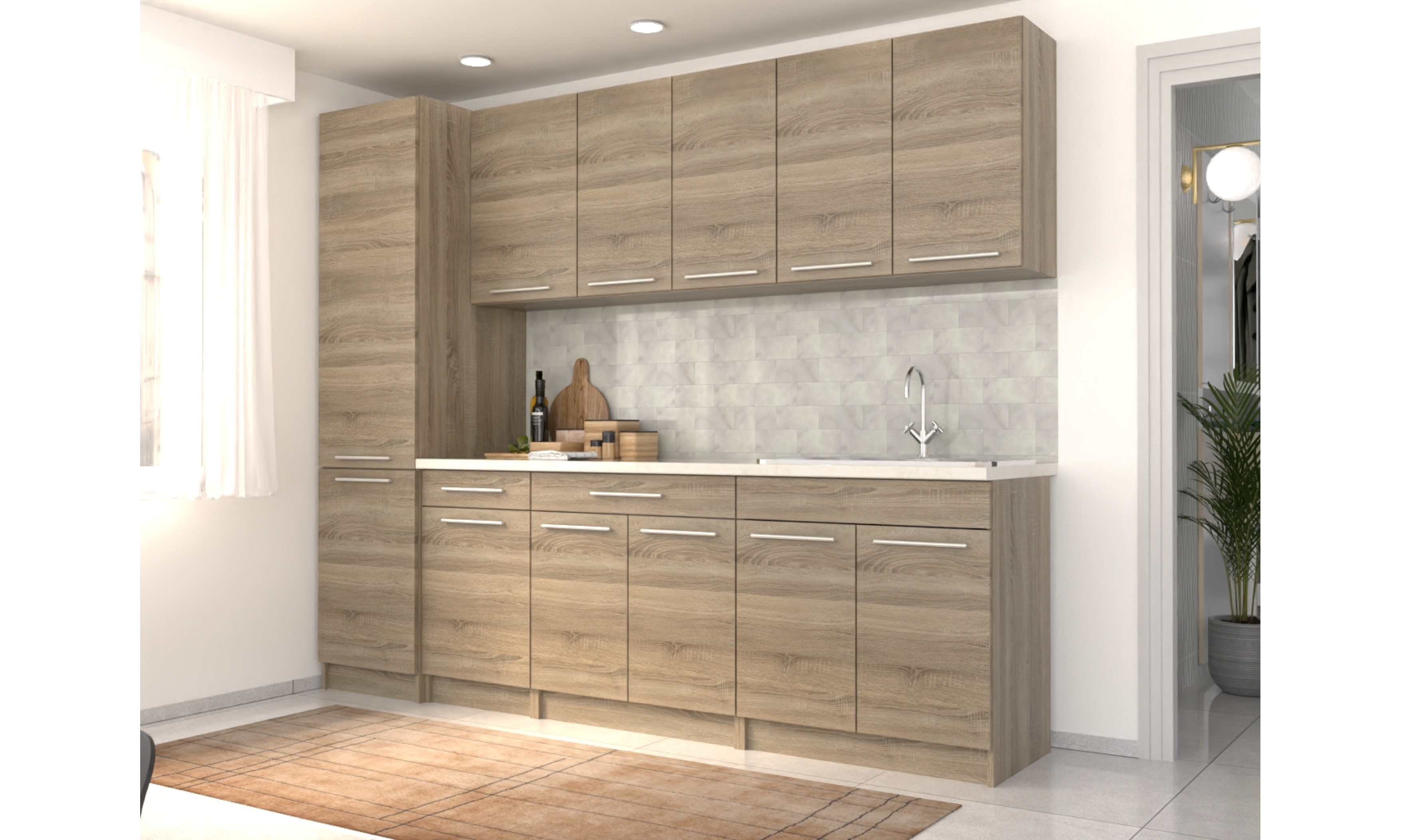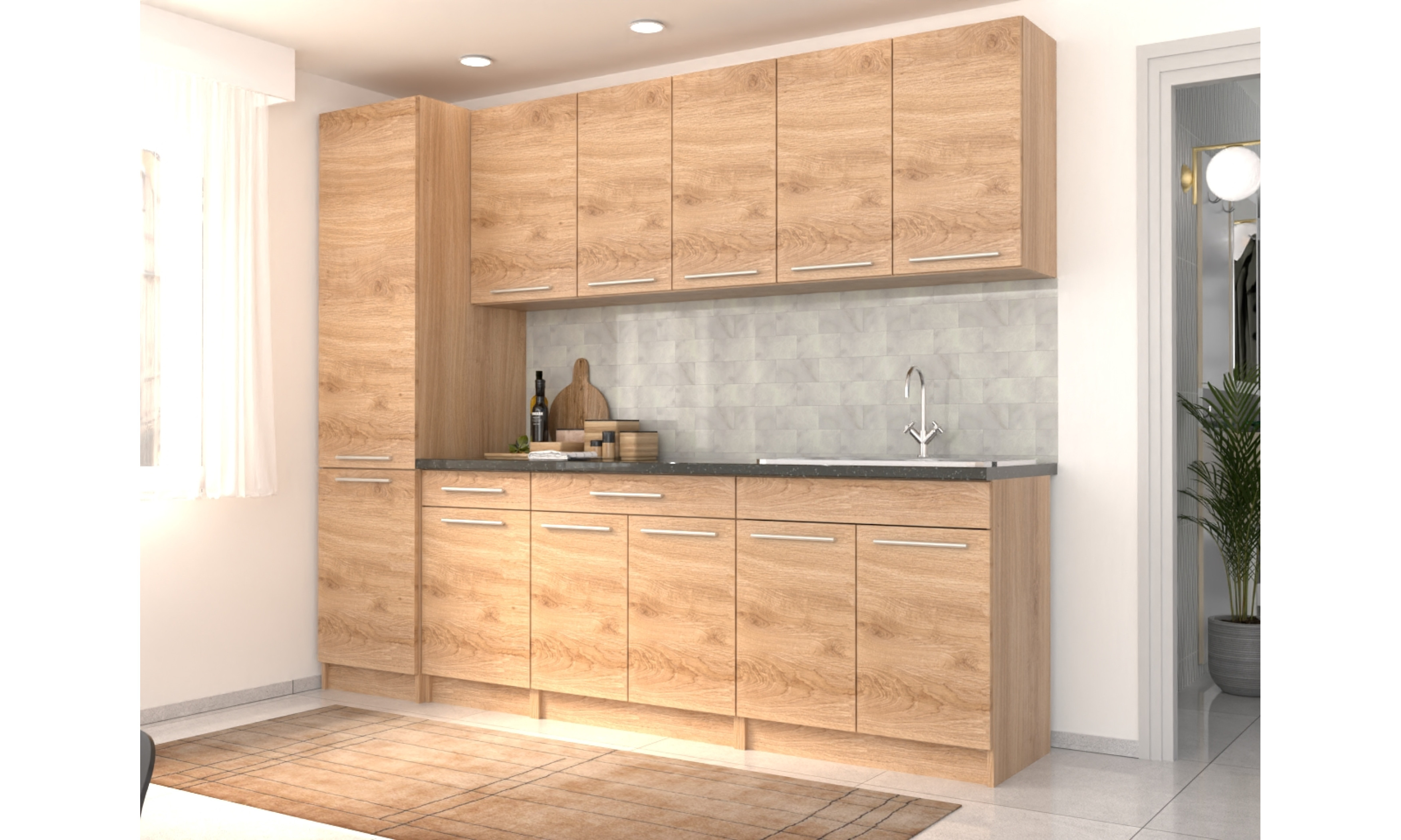 A konyhaszekrény tartalmazza az 1 mély + csepegtetős mosogatótálcát, a szifont, a munkalapot, fogantyúkat, de nem tartalmazza a falidekort.