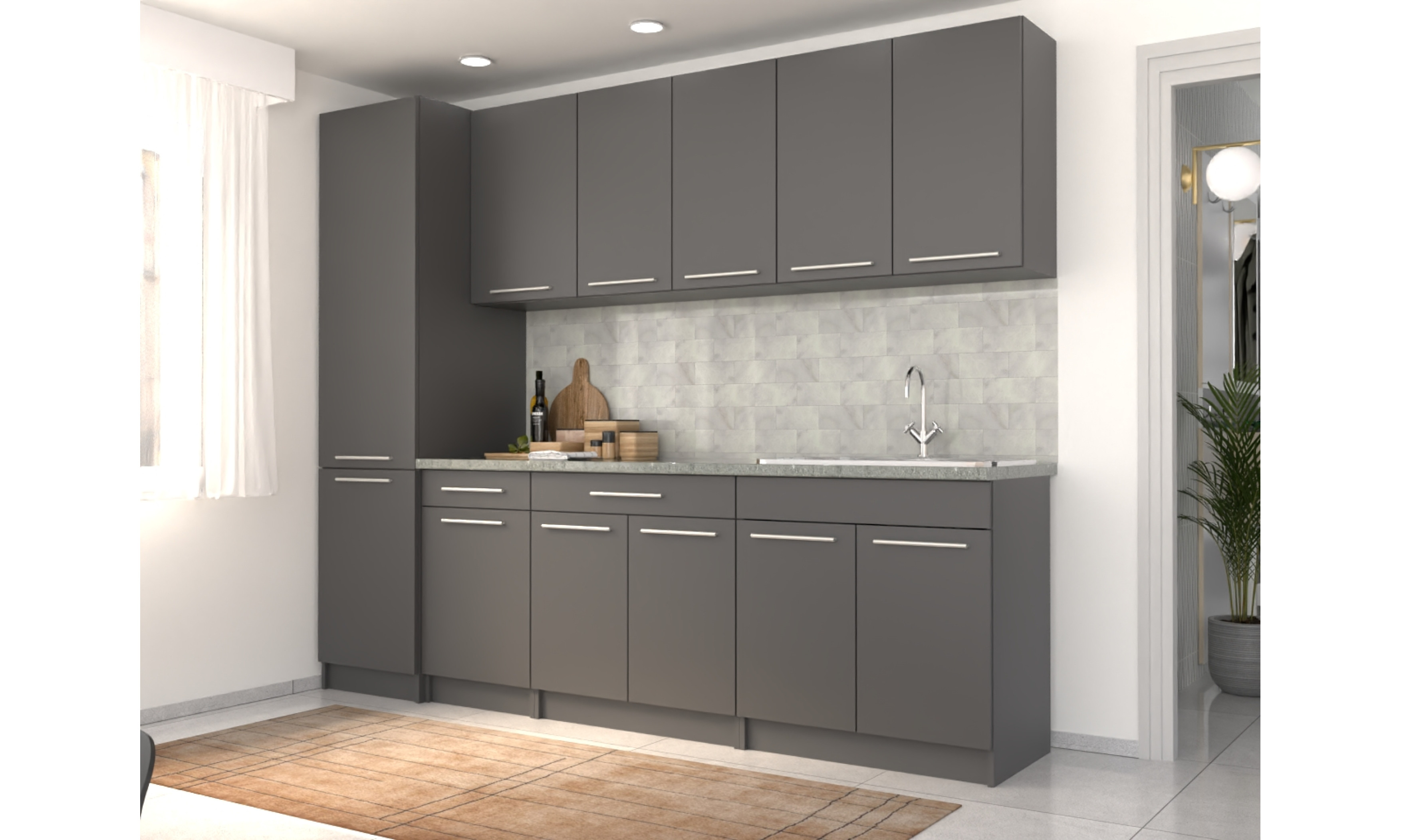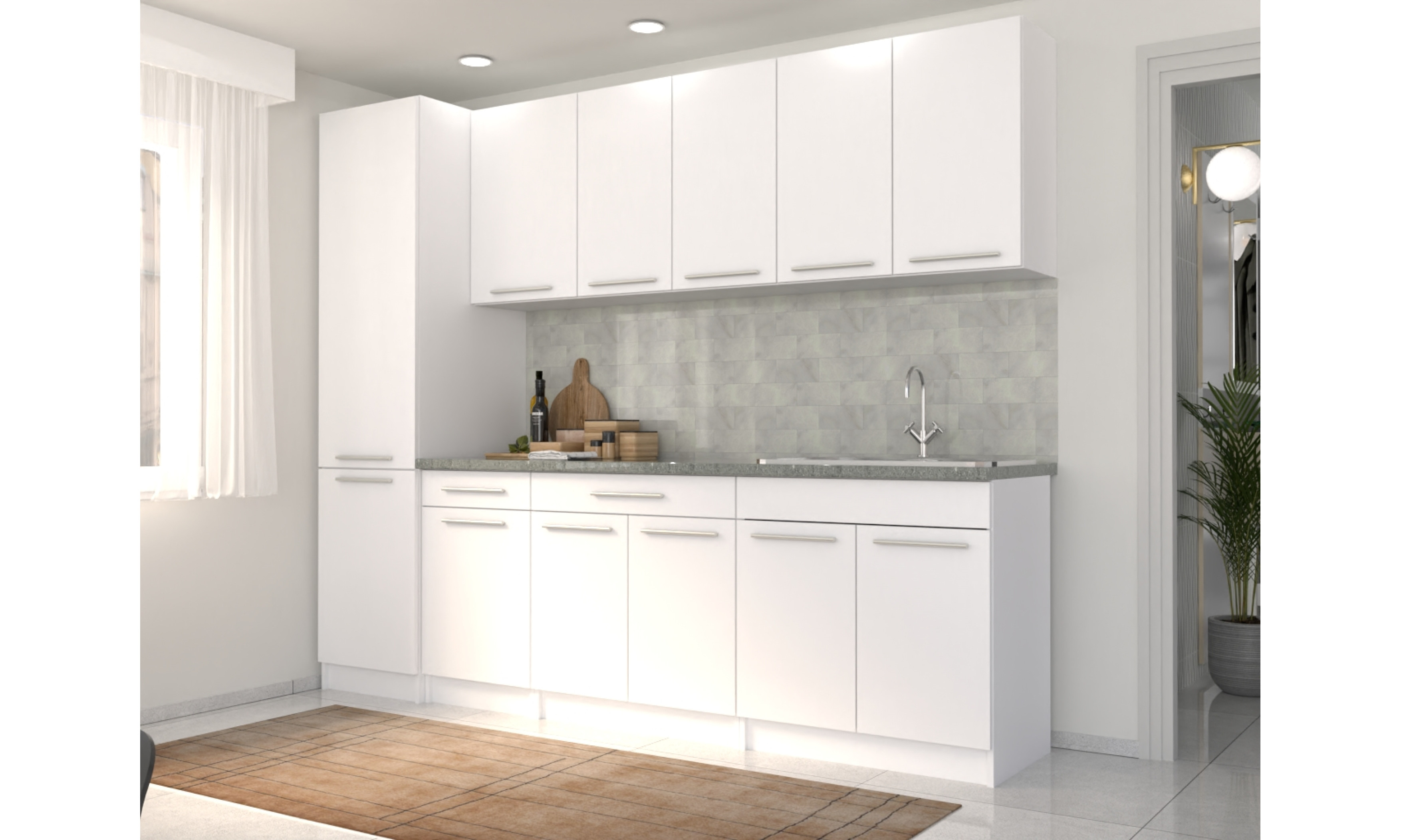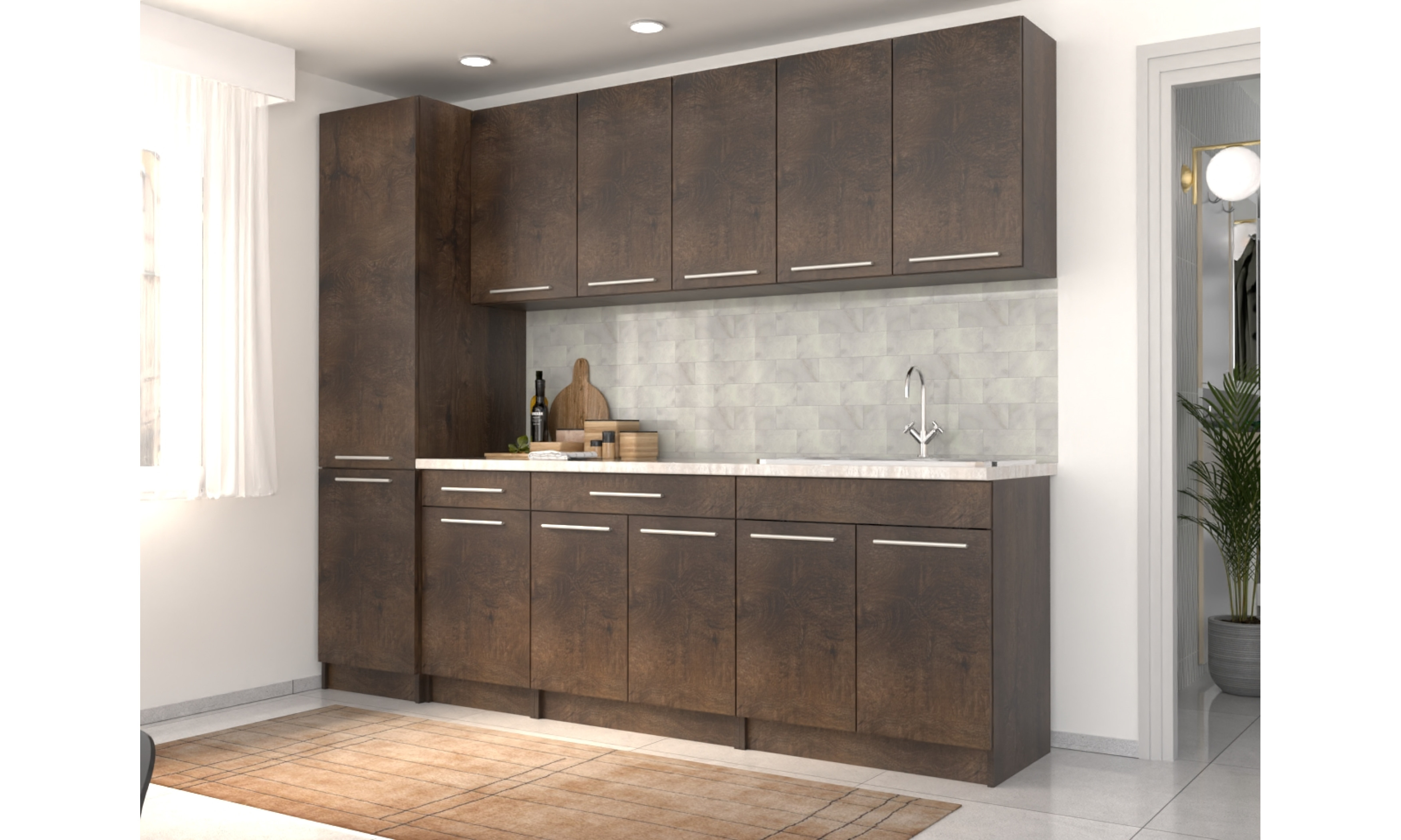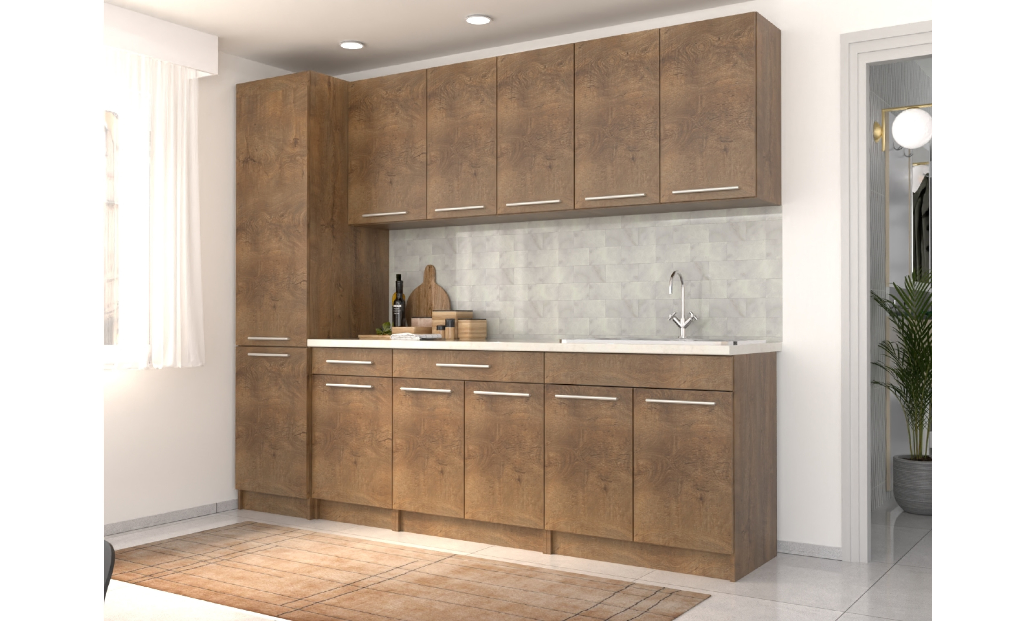 A konyhaszekrény tartalmazza az 1 mély + csepegtetős mosogatótálcát, a szifont, a munkalapot, fogantyúkat, de nem tartalmazza a falidekort.