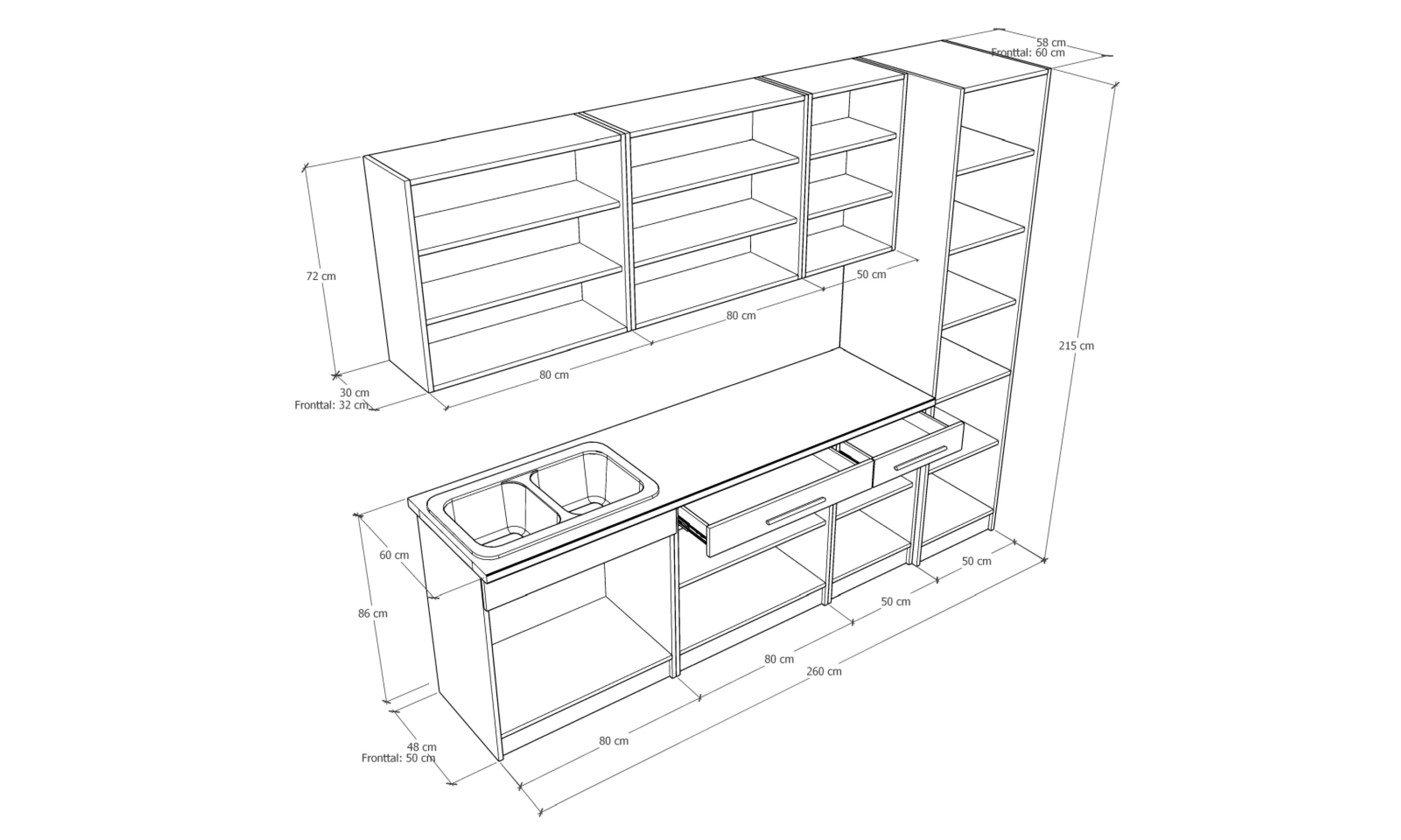 A konyhaszekrény teljes szélessége 260 cm, az alsó szekrény mélysége 48 cm + ajtó, a munkalap mélysége 60 cm. A felső szekrény magassága 72,5 cm, mélysége 30 cm + ajtó. A kamraszekrény mélysége 58 cm + ajtó.