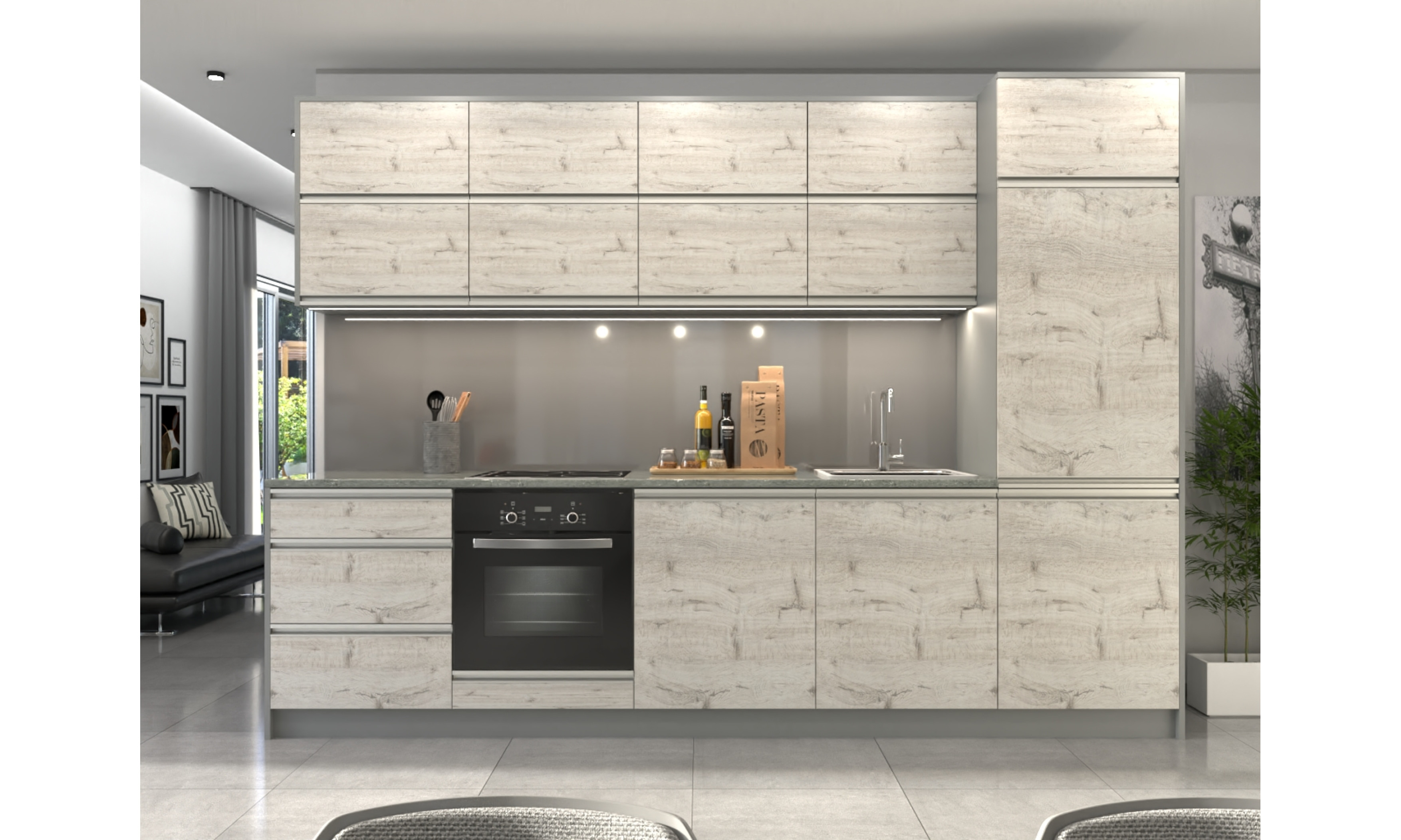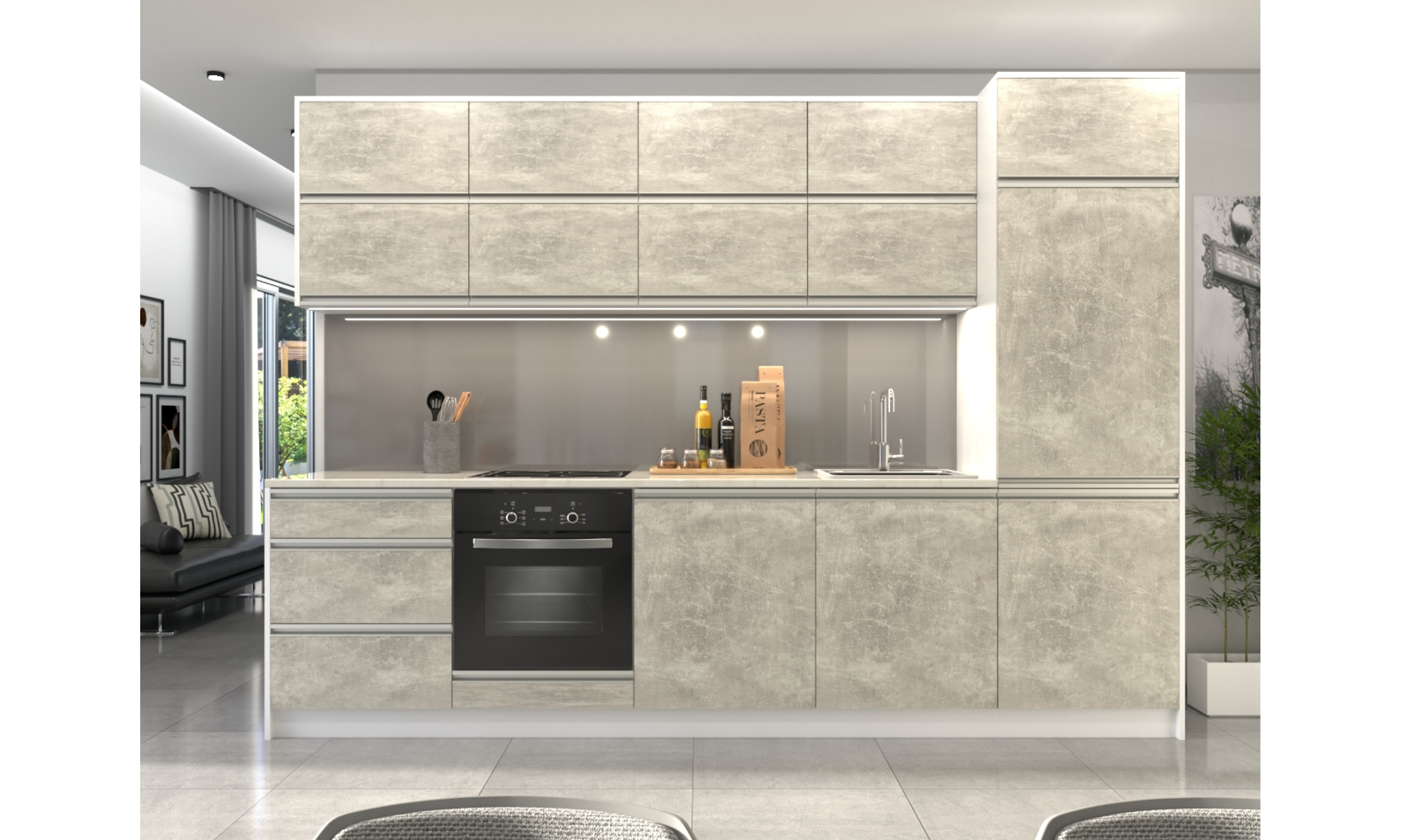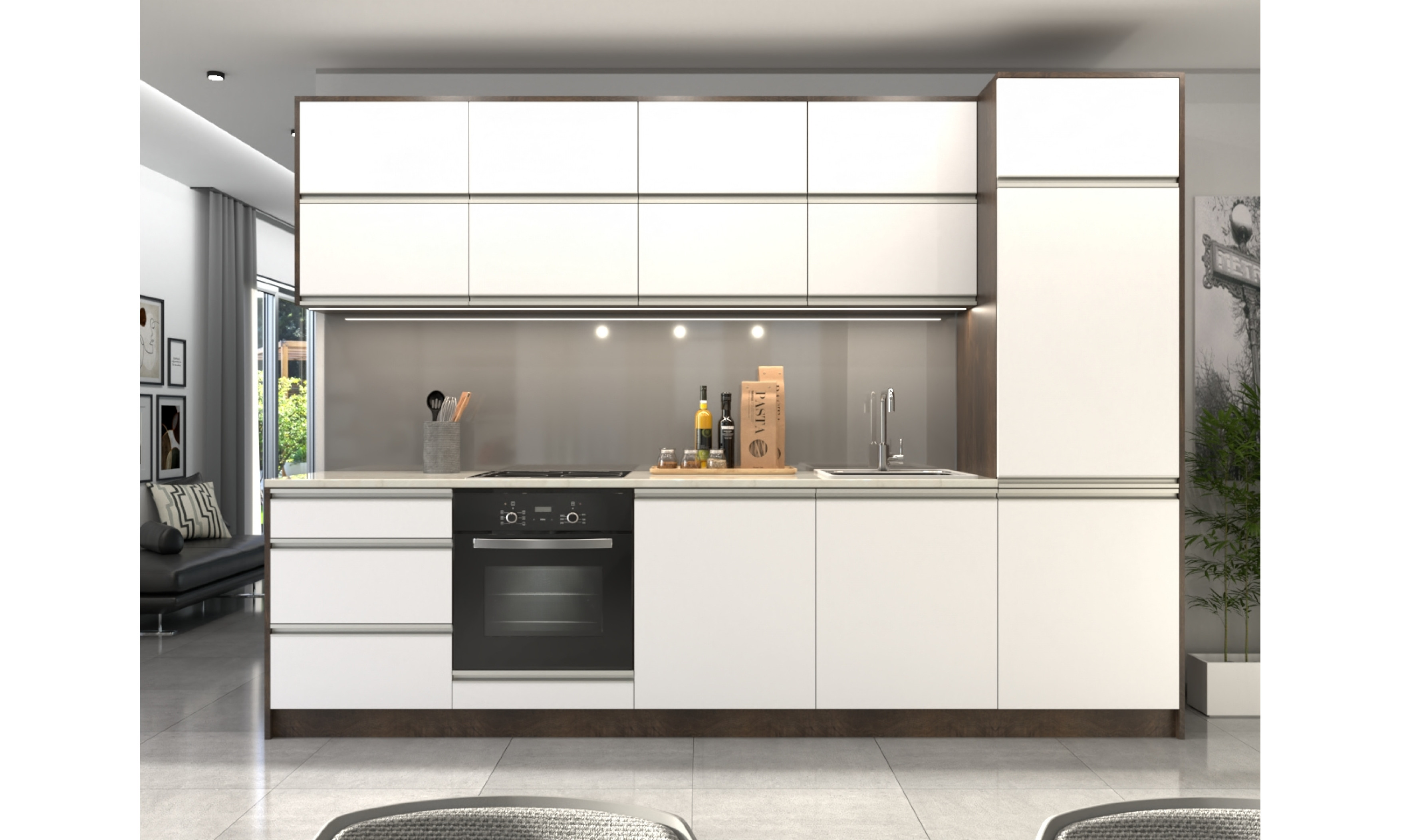 A konyhaszekrény 18 mm-es laminált bútorlapból ABS élzárással és köldökcsapozással készül. A hátfal fehér színű 2,5 mm-es HDF lemez, mely tűzőkapoccsal van rögzítve. Az ajtó szintén 18 mm-es bútorlapból készül. ABS élzárással és élbe mart fogóprofillal készülnek.