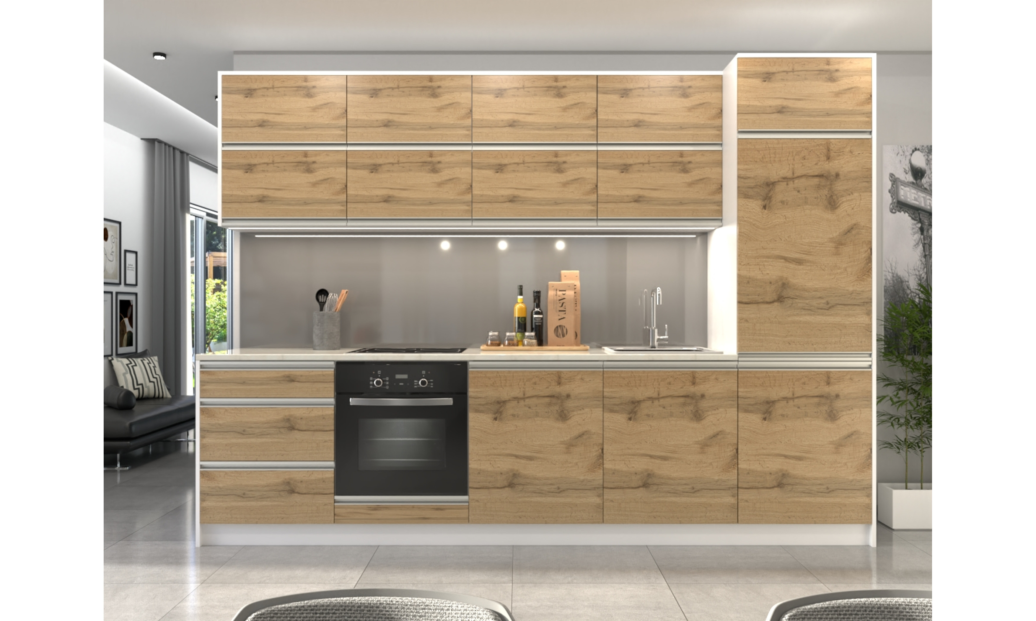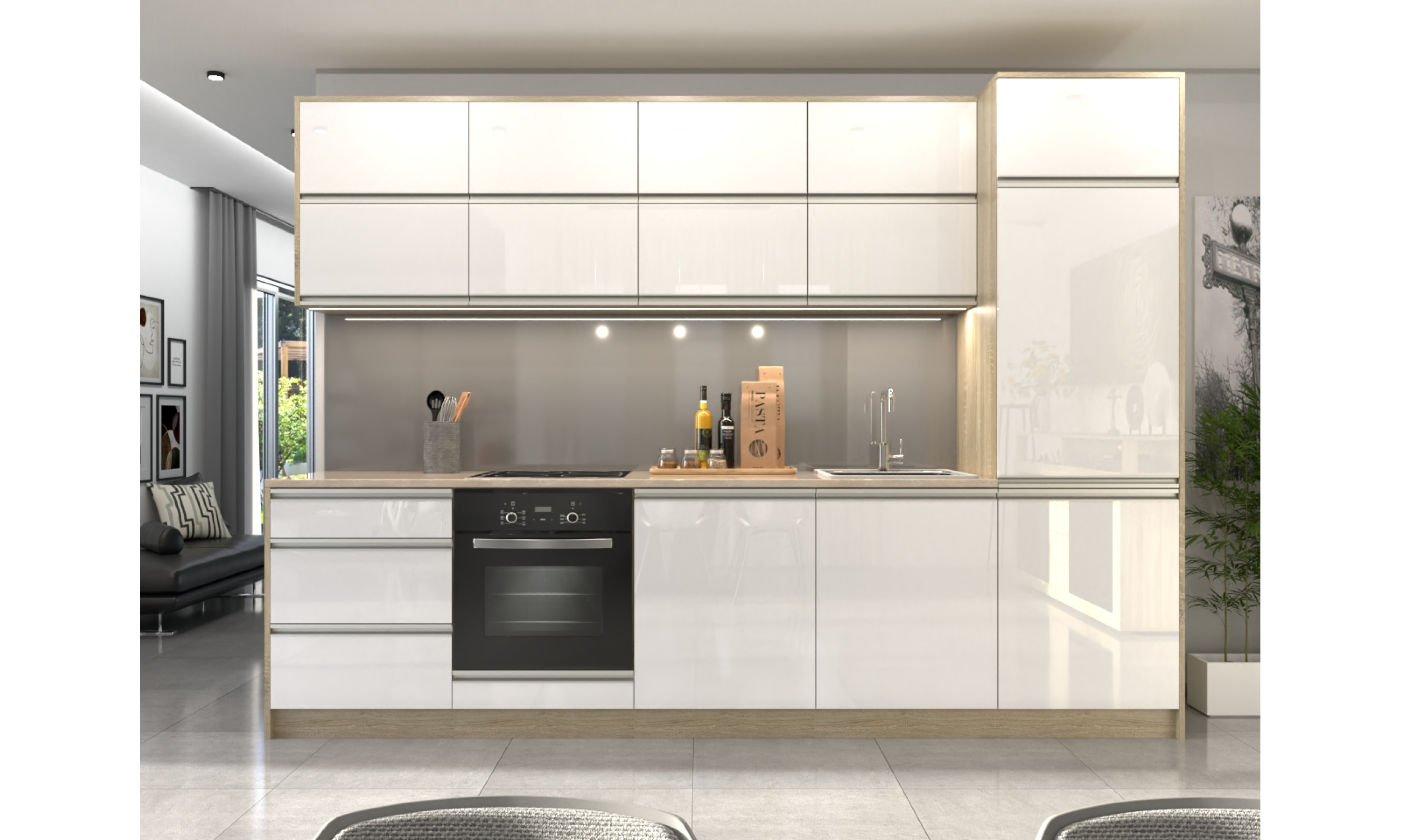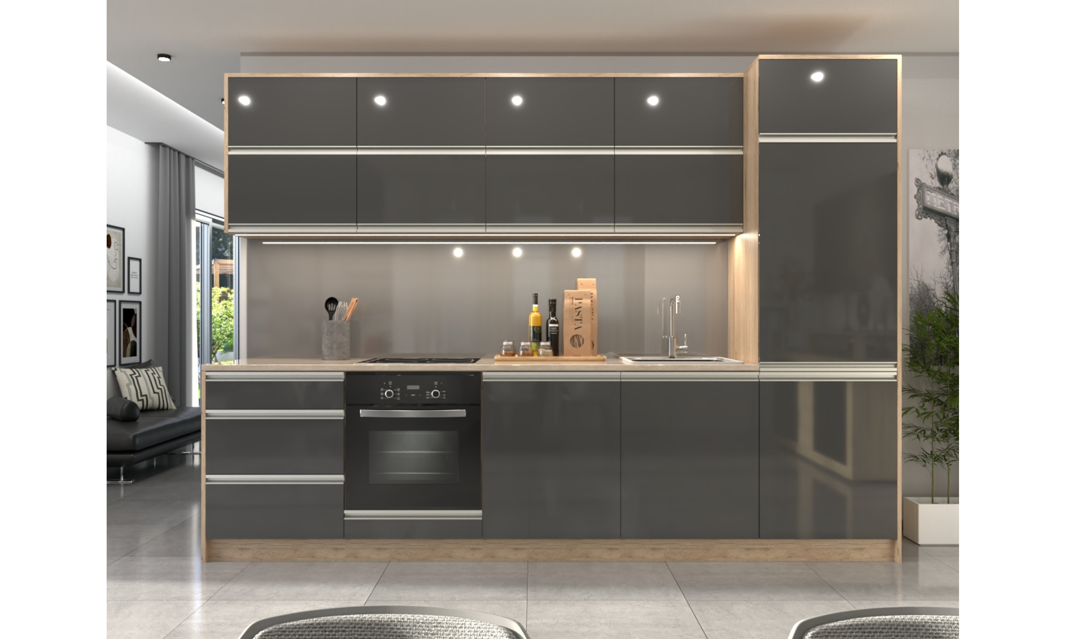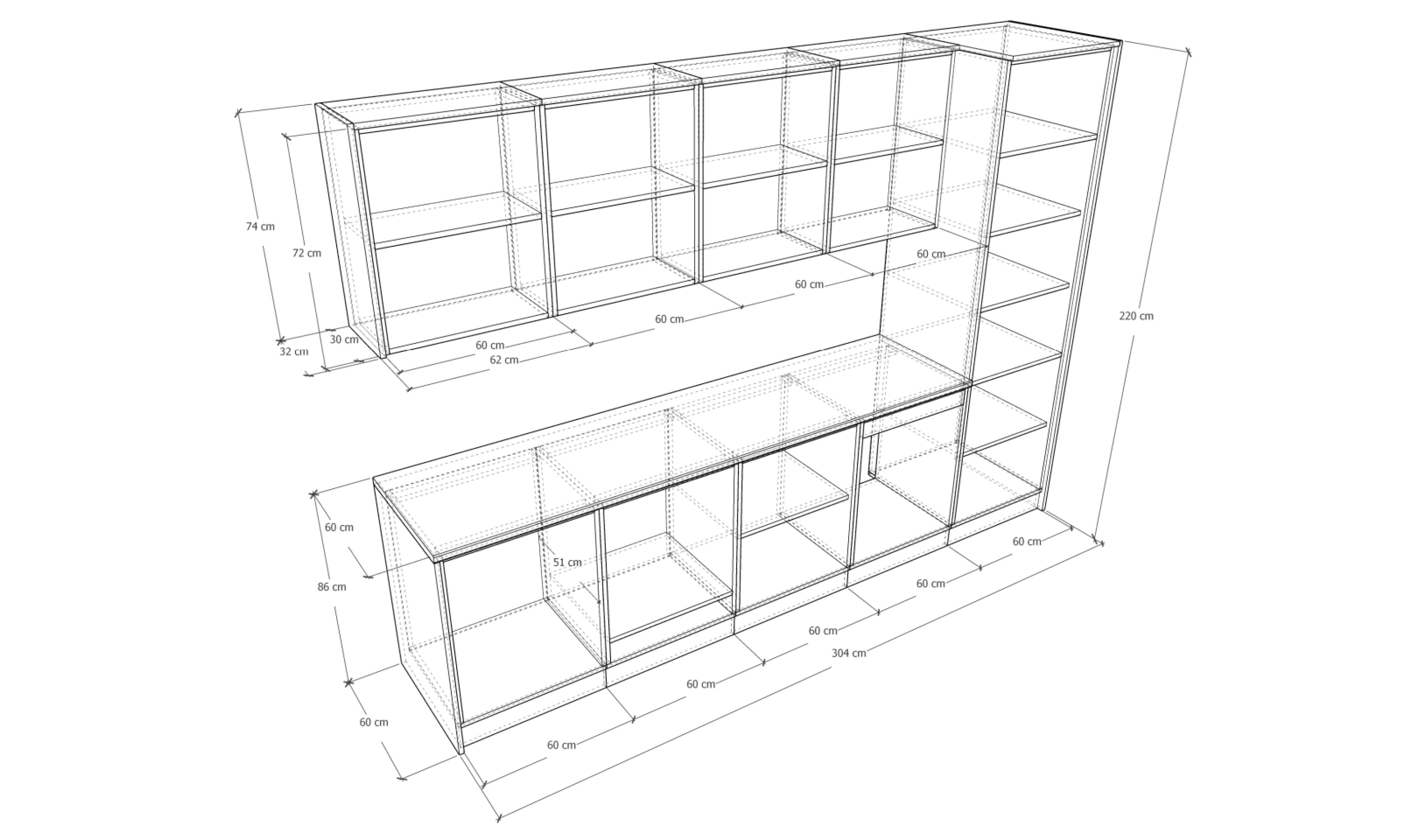 A konyhaszekrény teljes szélessége 304 cm, az alsó szekrény testmélysége 48 cm + ajtó (2 cm), a munkalap mélysége 60 cm. A felső szekrény magassága 72,5 cm (A felső szekrény magassága választható.), mélysége 30 cm + ajtó (2 cm).