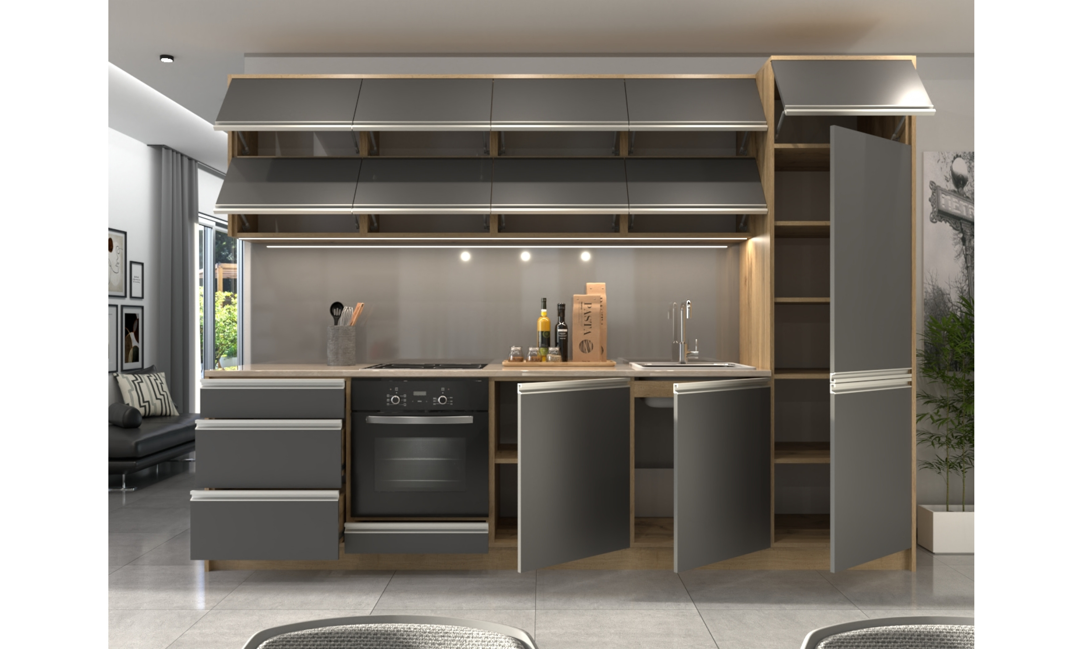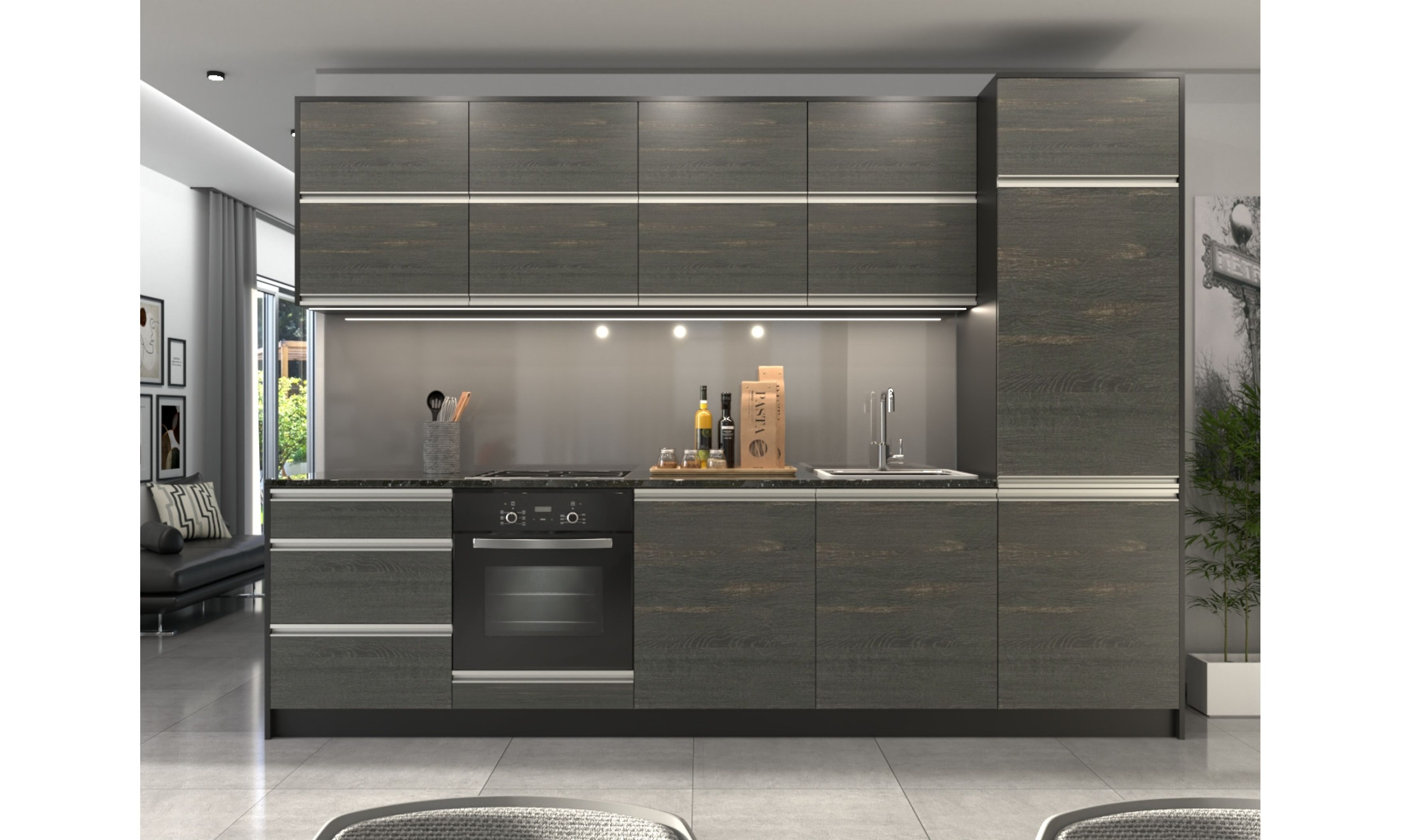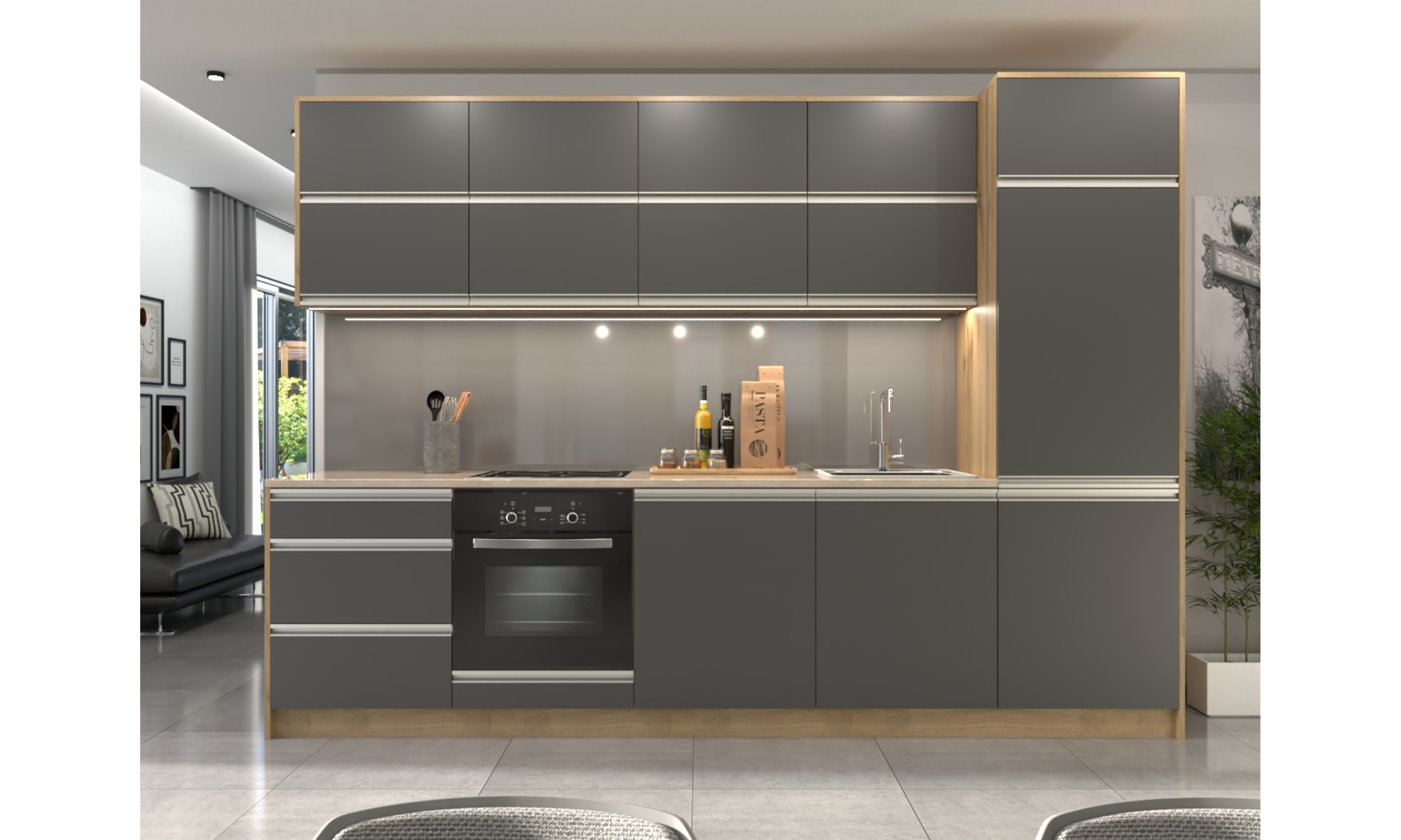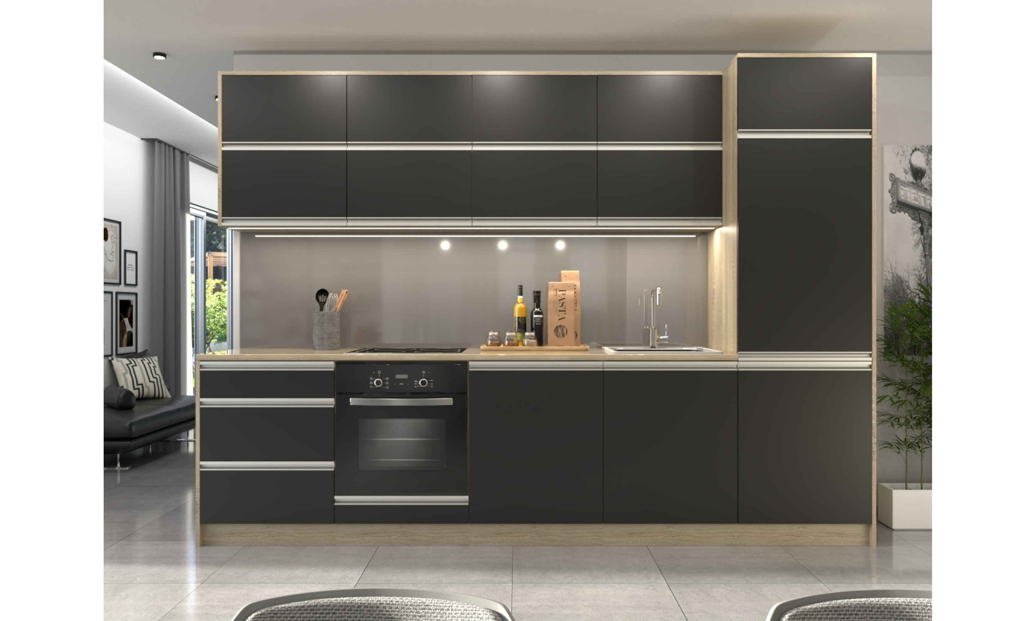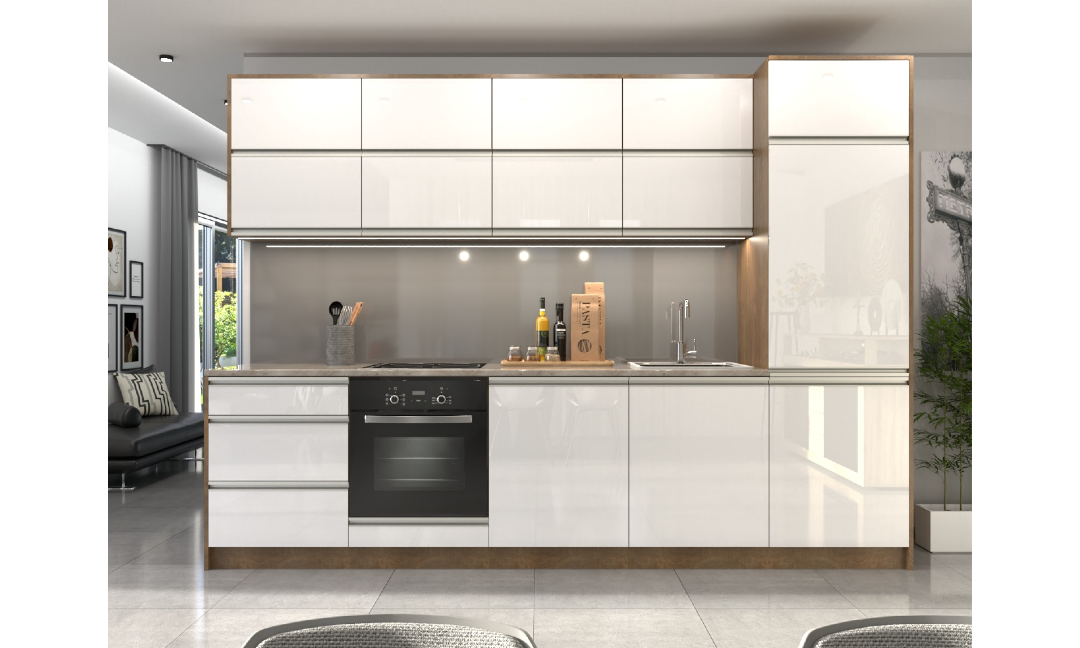 A konyhaszekrény teljes szélessége 304 cm, az alsó szekrény testmélysége 48 cm + ajtó (2 cm), a munkalap mélysége 60 cm. A felső szekrény magassága 72,5 cm (A felső szekrény magassága választható.), mélysége 30 cm + ajtó (2 cm).