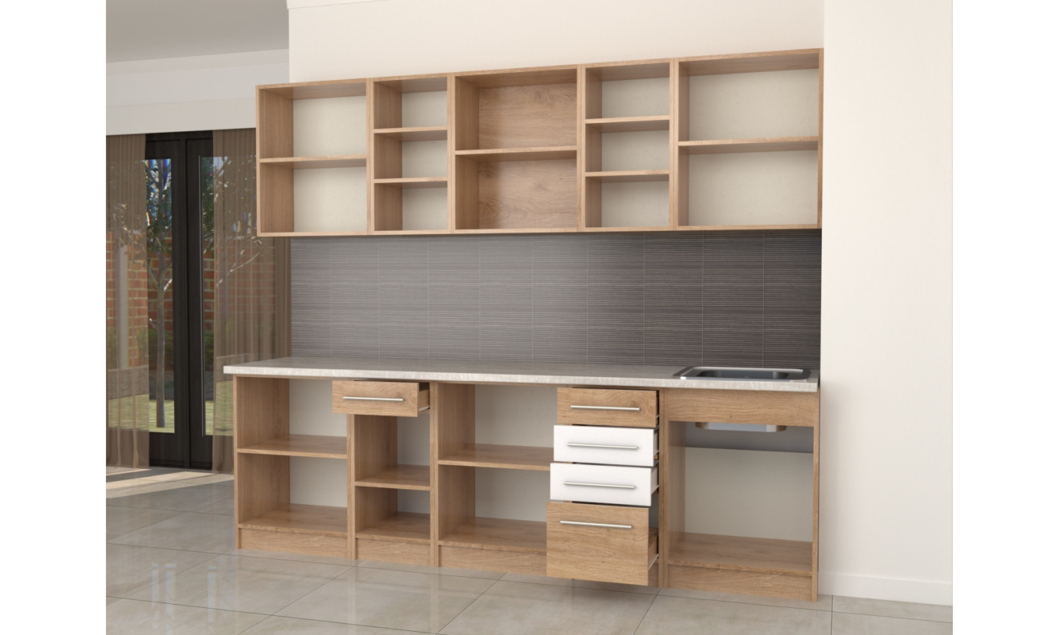 A konyhaszekrény 18 mm-es laminált bútorlapból ABS élzárással és köldökcsapozással készül. A hátfal a zárt részeken fehér, a nyitott részeken színes /de színben és árnyalatban eltérhet a korpusz színétől/ 2,5 mm-es HDF lemez, mely tűzőkapoccsal van rögzítve. A fiók sima görgős sínnel készül. Az ajtó szintén 18 mm-es bútorlapból készül.