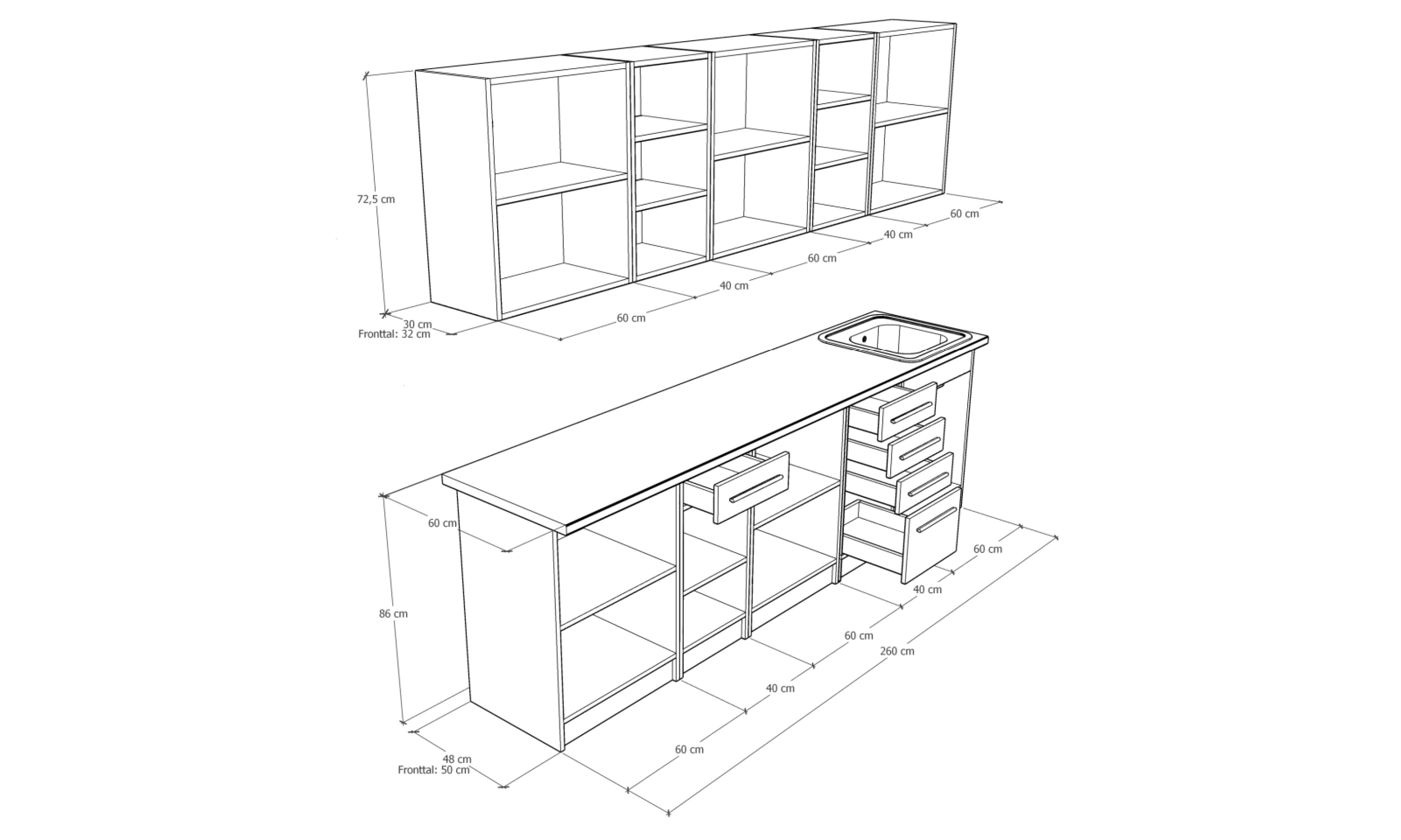 A konyhaszekrény teljes szélessége 260 cm, alsó szekrény testmélysége 48 cm + front (2 cm), a munkalap mélysége 60 cm. Felső szekrény magassága 72,5, mélysége 30 cm + front (2 cm).