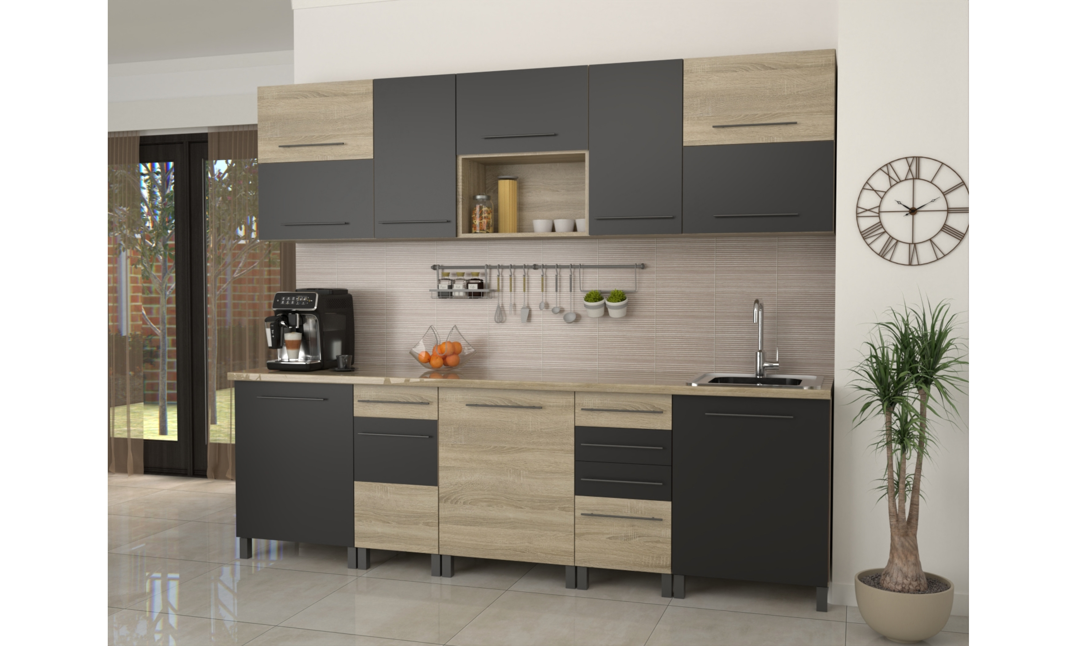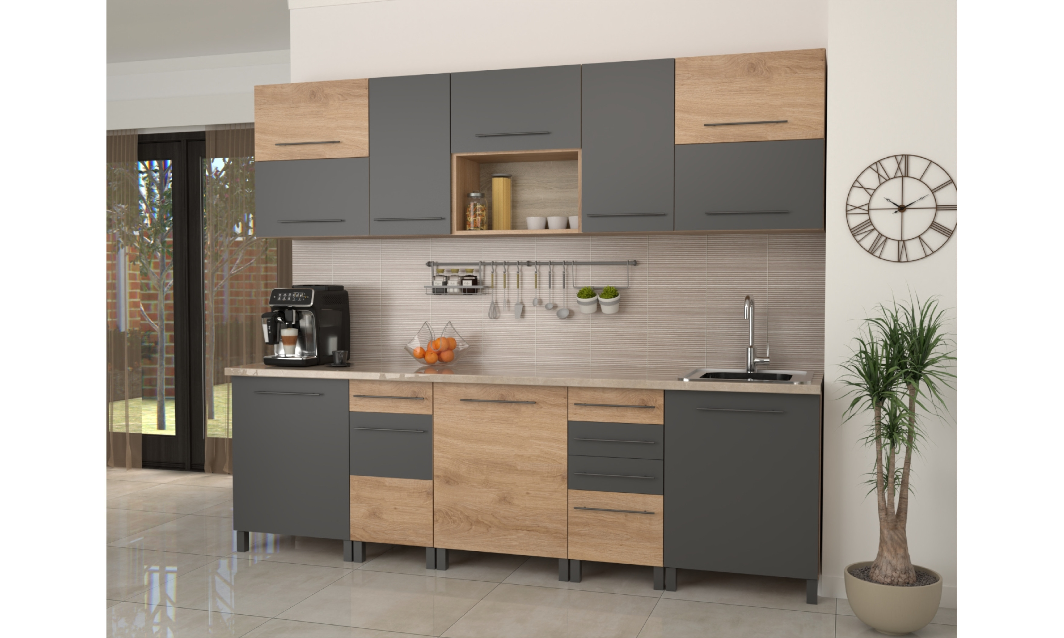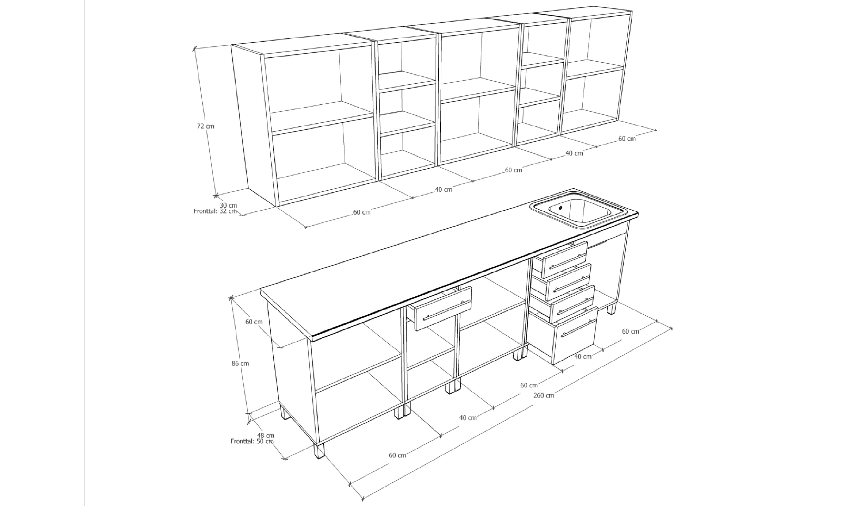 A konyhaszekrény teljes szélessége 260 cm, alsó szekrény testmélysége 48 cm + front (2 cm), a munkalap mélysége 60 cm. Felső szekrény magassága 72,5, mélysége 30 cm + front (2 cm).