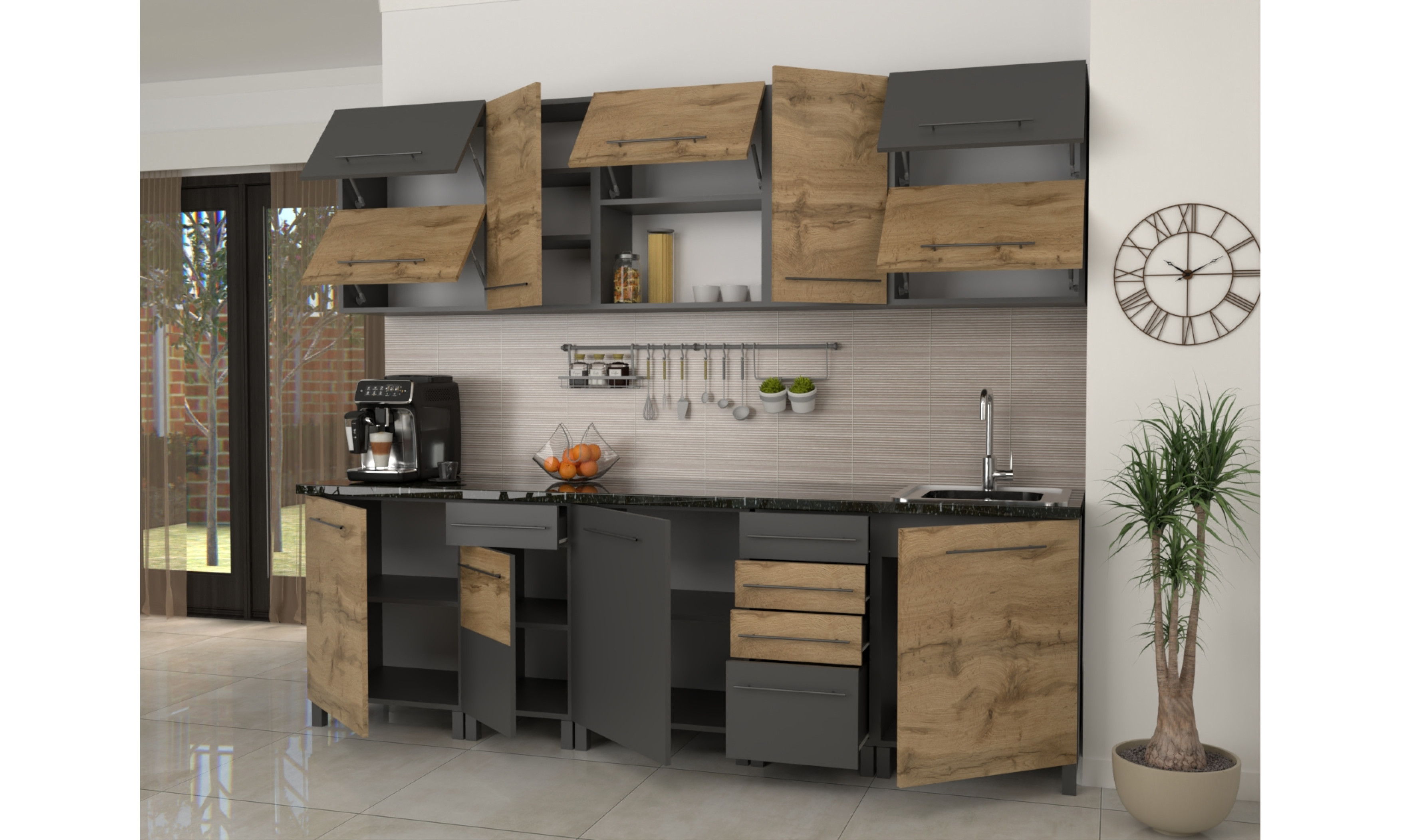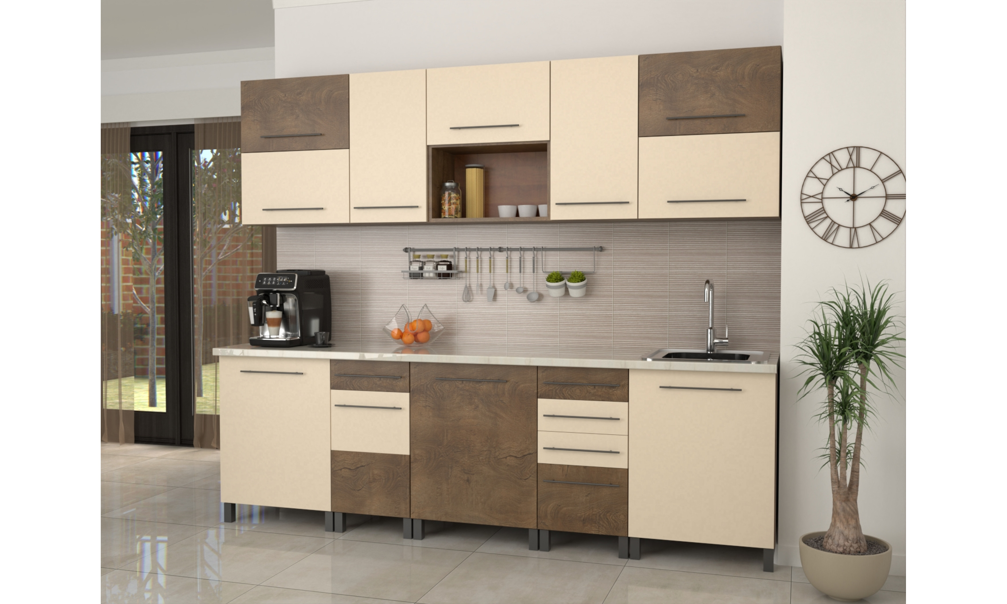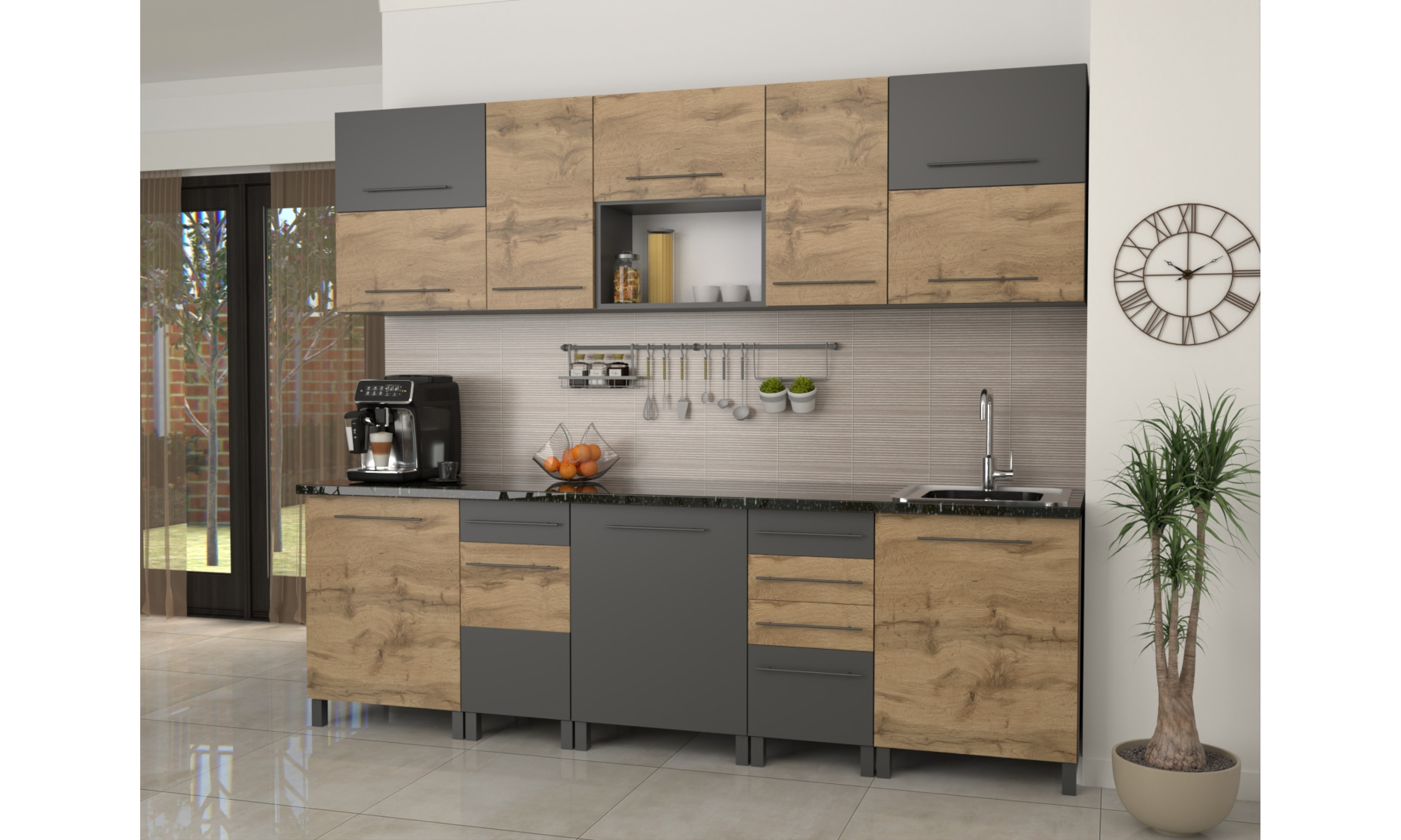 A konyhaszekrény teljes szélessége 260 cm, alsó szekrény testmélysége 48 cm + front (2 cm), a munkalap mélysége 60 cm. Felső szekrény magassága 72,5, mélysége 30 cm + front (2 cm).