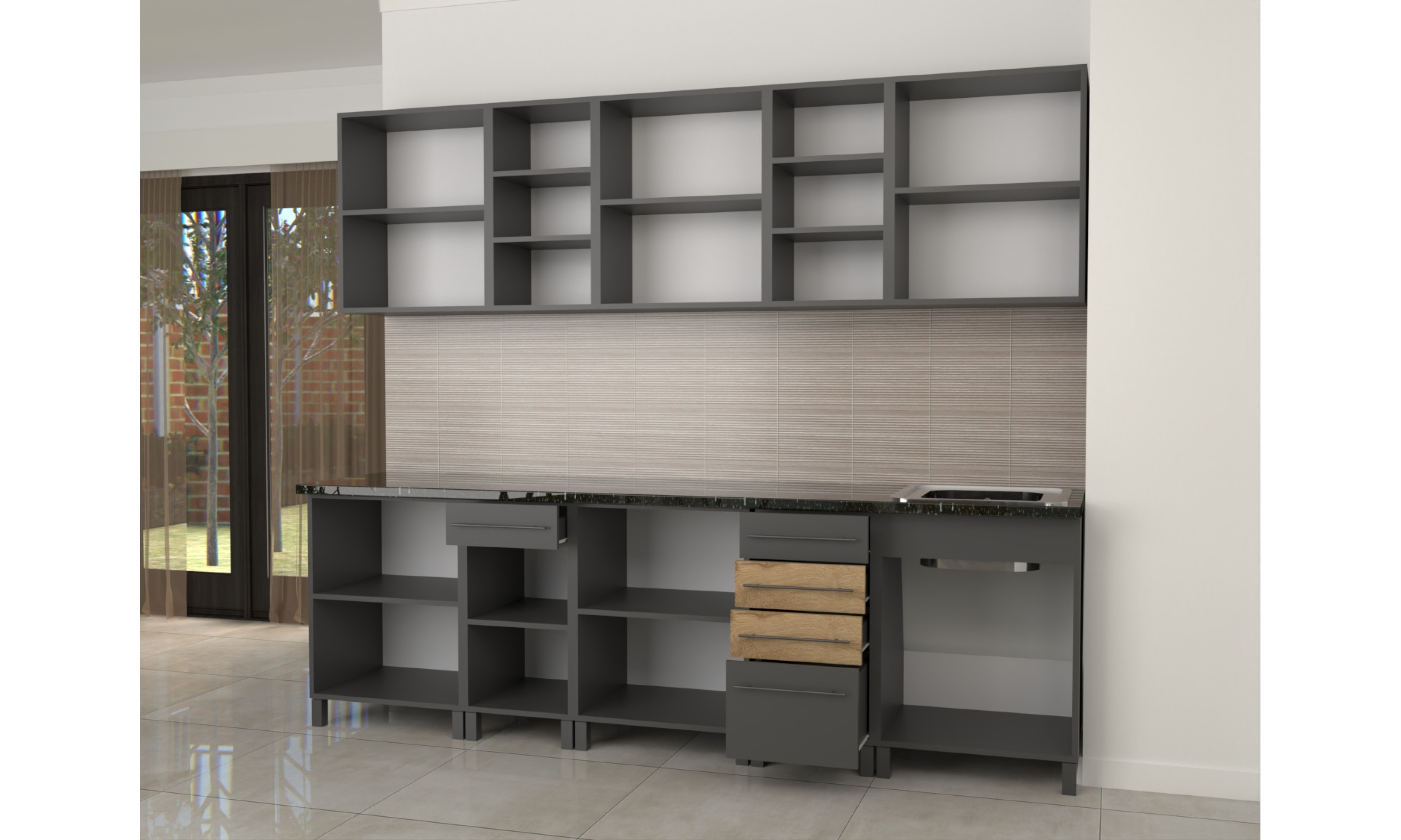A konyhaszekrény 18 mm-es laminált bútorlapból ABS élzárással és köldökcsapozással készül. A hátfal a zárt részeken fehér, a nyitott részeken színes /de színben és árnyalatban eltérhet a korpusz színétől/ 2,5 mm-es HDF lemez, mely tűzőkapoccsal van rögzítve. A fiók sima görgős sínnel készül. Az ajtó szintén 18 mm-es bútorlapból készül.