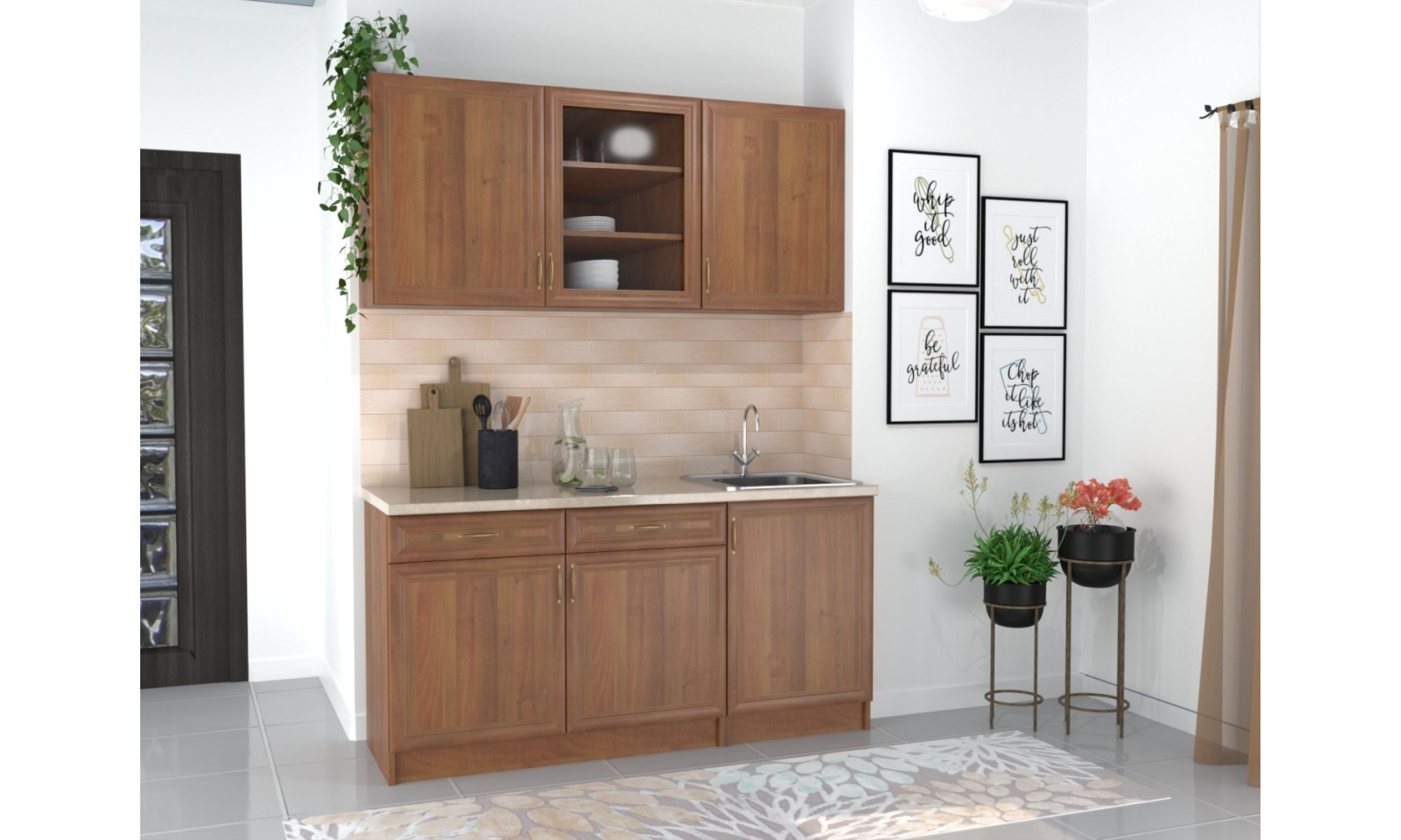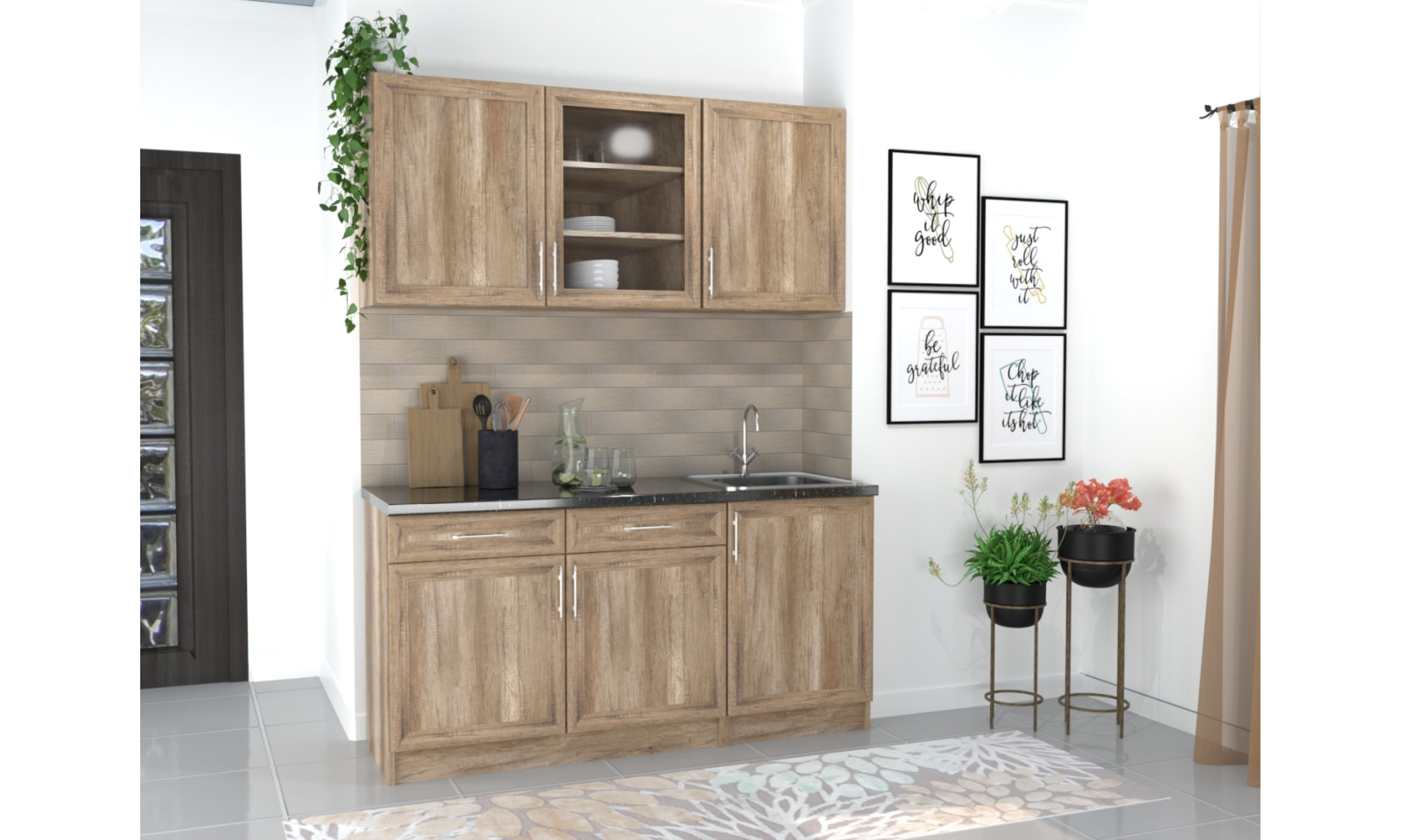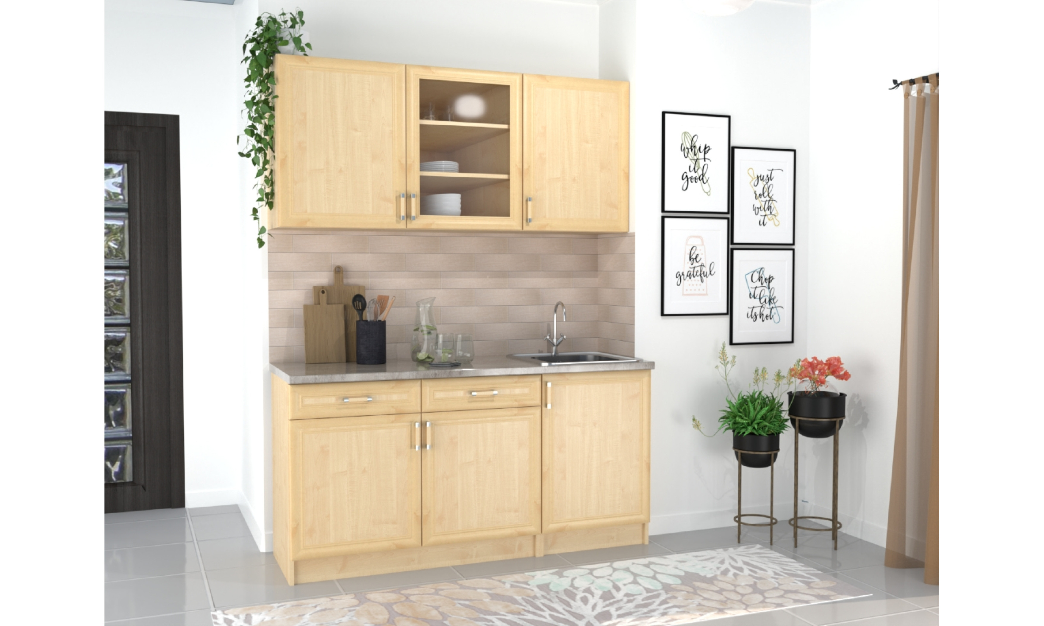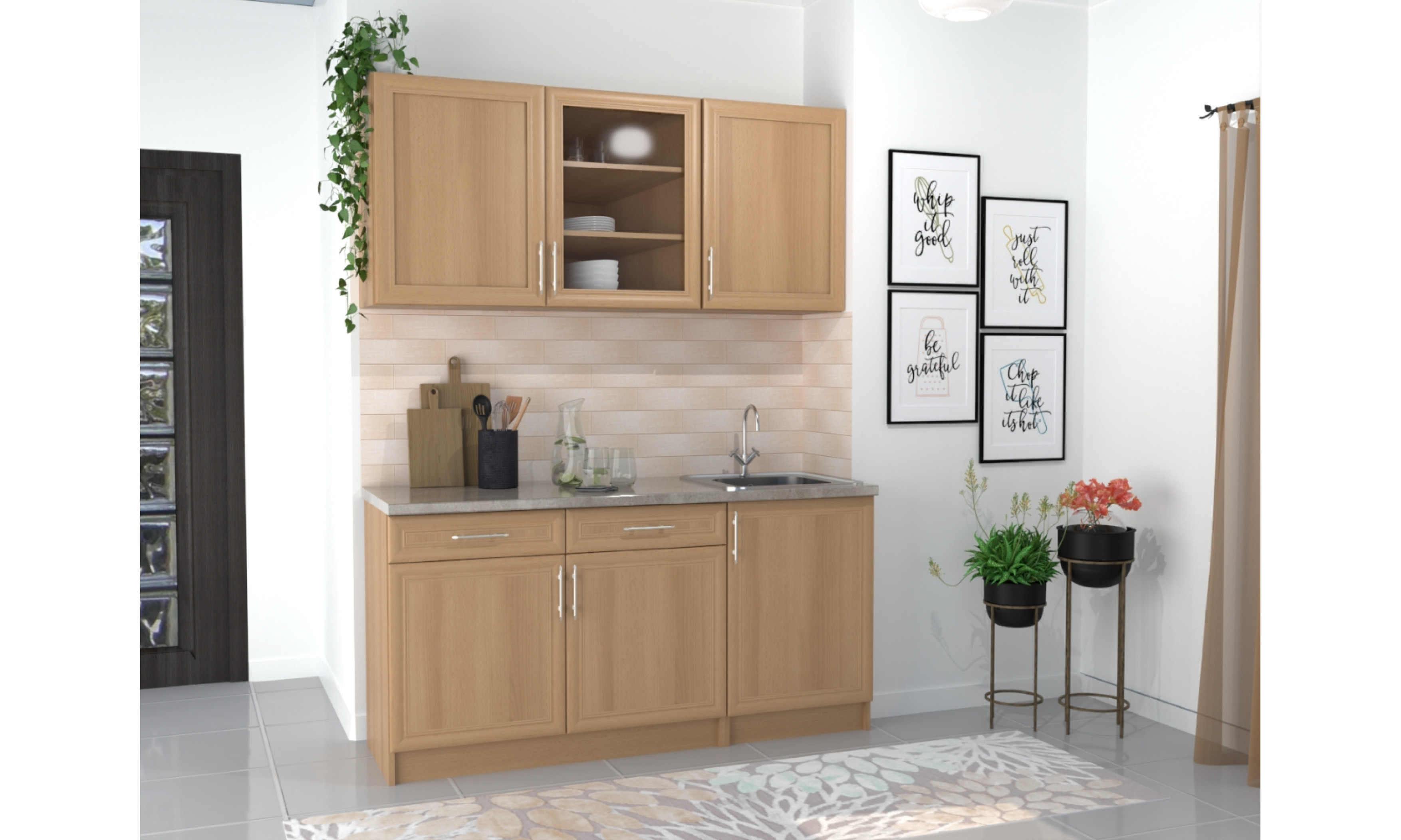 A konyhaszekrény 18 mm-es laminált bútorlapból ABS élzárással és köldökcsapozással készül. A hátfal a zárt részeken fehér 2,5 mm-es HDF lemez, mely tűzőkapoccsal van rögzítve. A fiók fém fiókcsúszóval készül. Az ajtó szintén 18 mm-es bútorlapból készül, amely keretléccel van díszítve. A keretléc rögzítése ragasztóval, illetve tűszeggel történik, melynek a helye minimálisan látható.