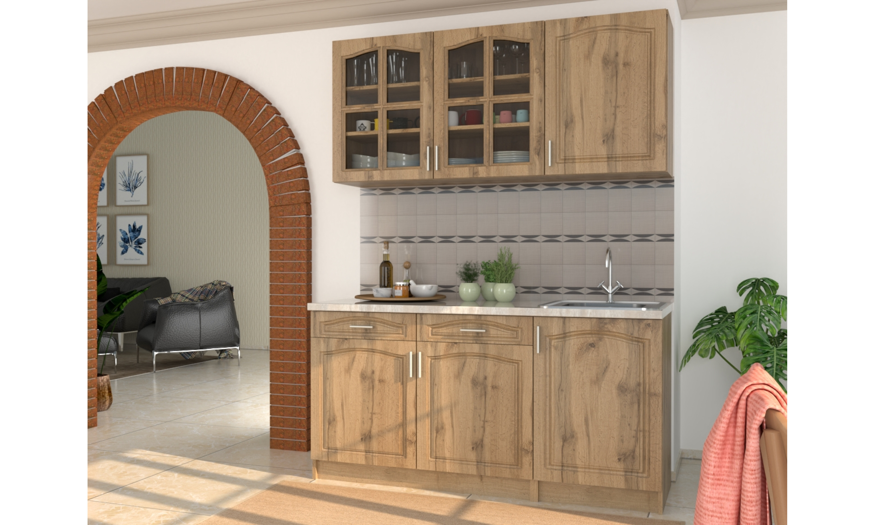 A konyhaszekrény 18 mm-es laminált bútorlapból ABS élzárással és köldökcsapozással készül. A hátfal a zárt részeken fehér 2,5 mm-es HDF lemez, mely tűzőkapoccsal van rögzítve. A fiók sima görgős fióksínnel készül. Az ajtók 16 mm-es, belső oldalt fehérrel laminált, frontoldalt 3D bemarással 0,4 mm vastag vákumfóliázott MDF-ből készül választható színekből.