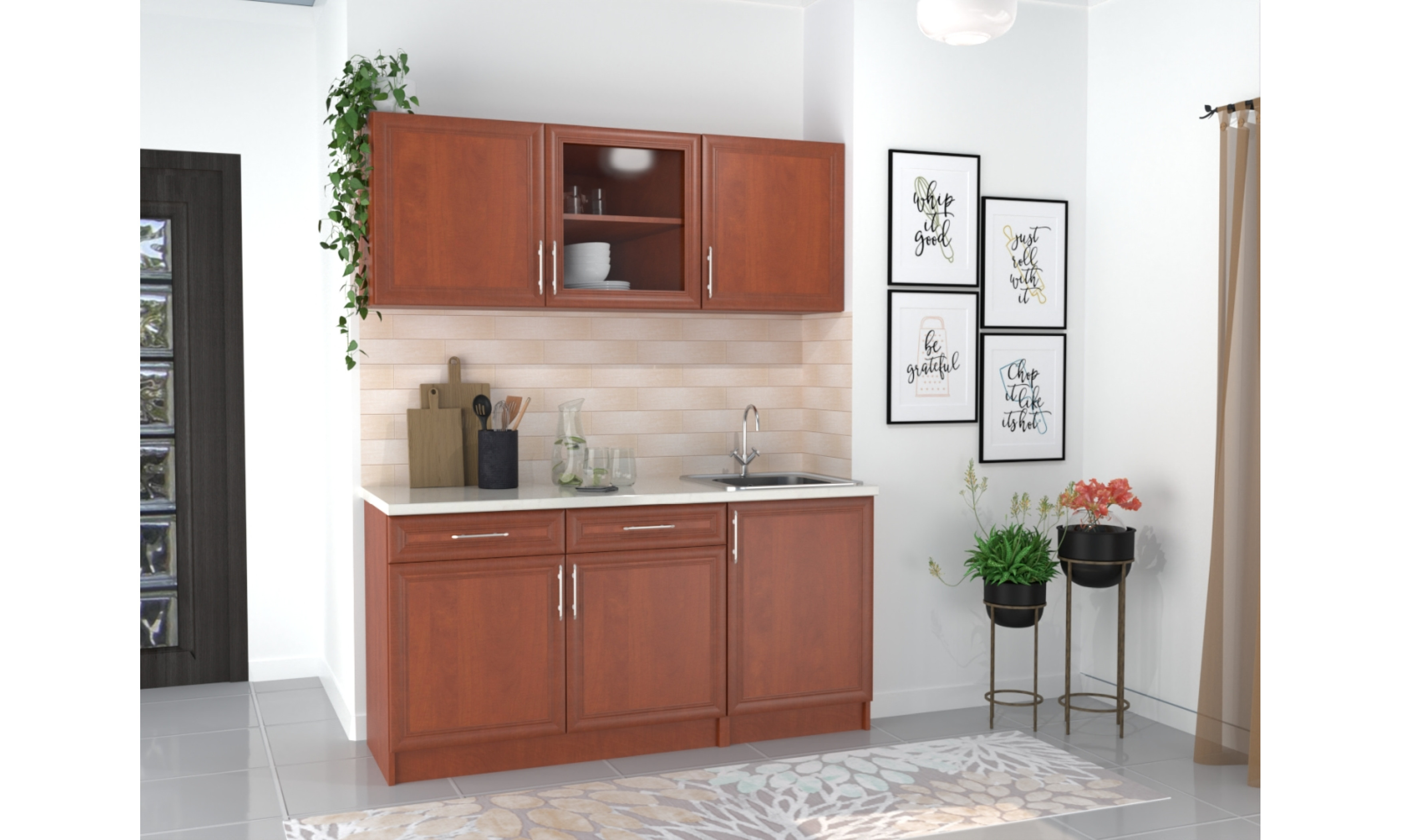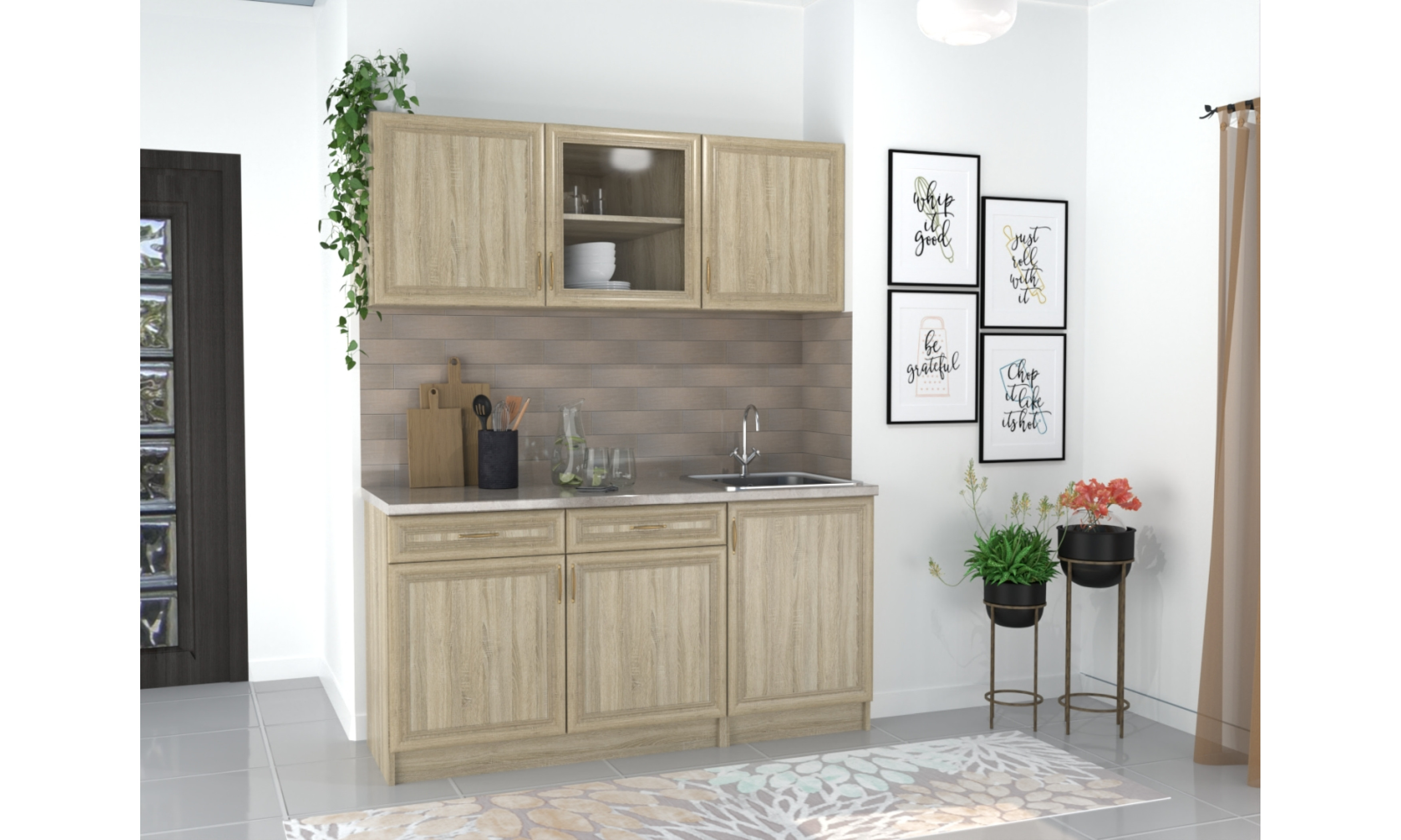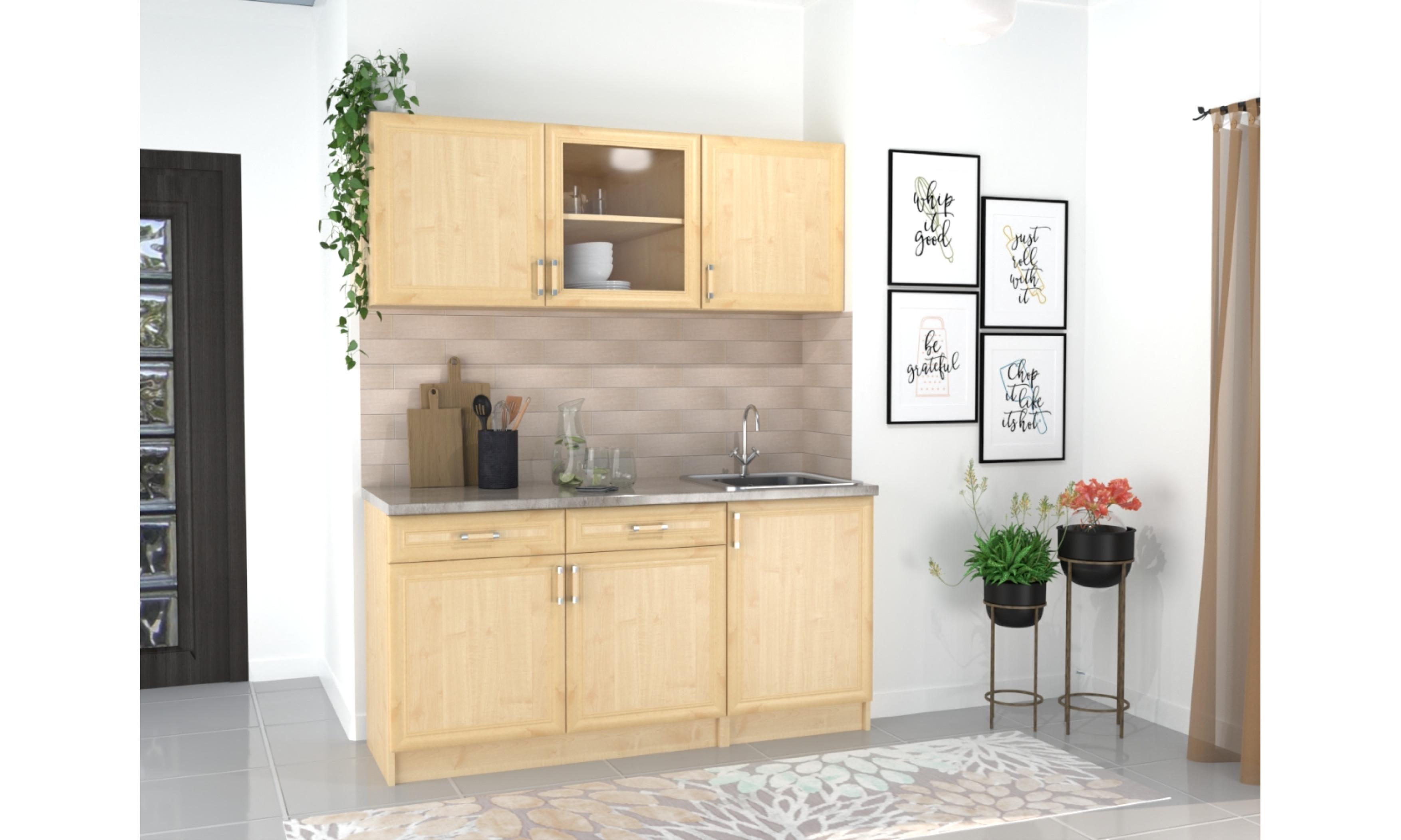 A konyhaszekrény tartalmazza az egy mély belevágós mosogatótálcát, a szifont, a munkalapot és a fogantyút.