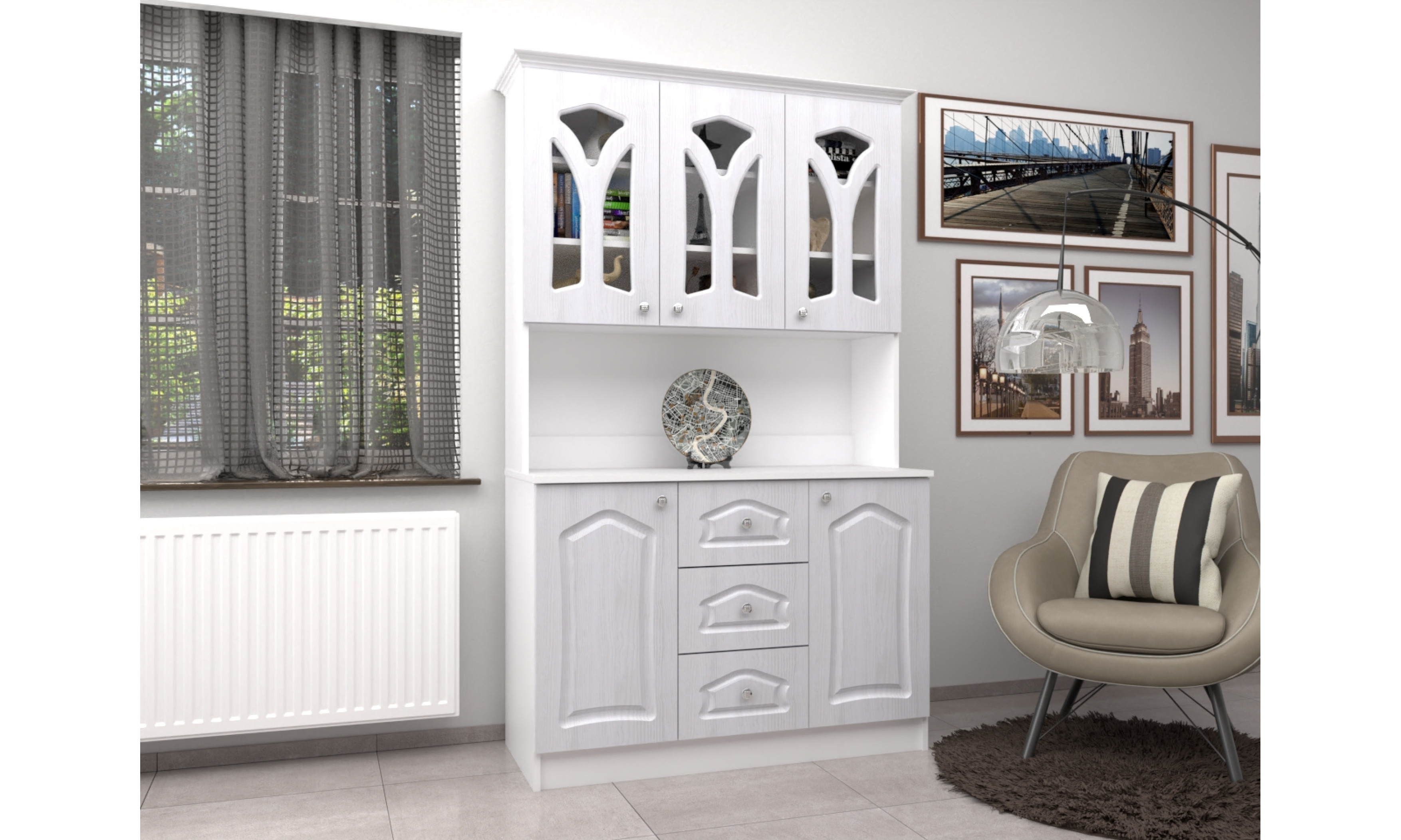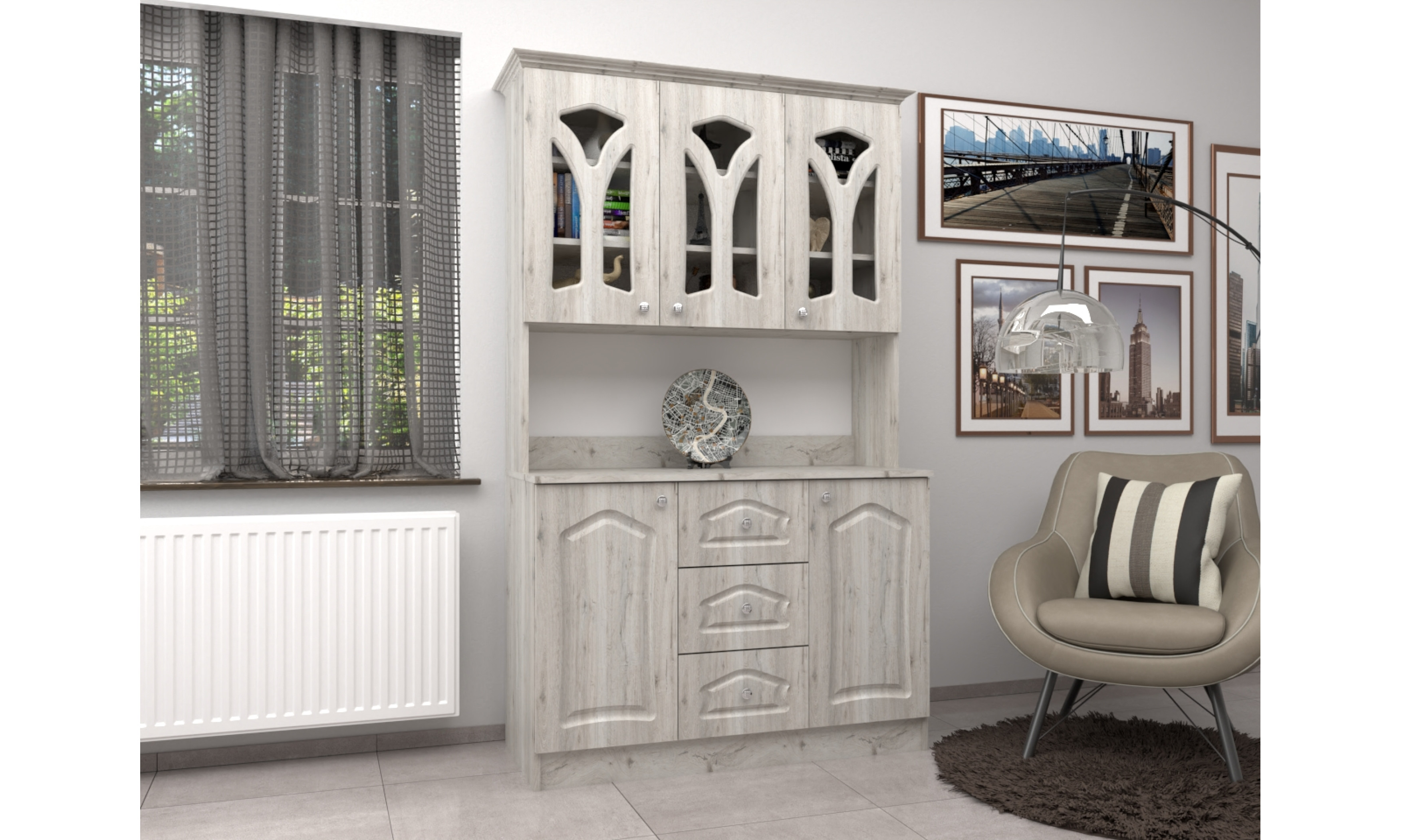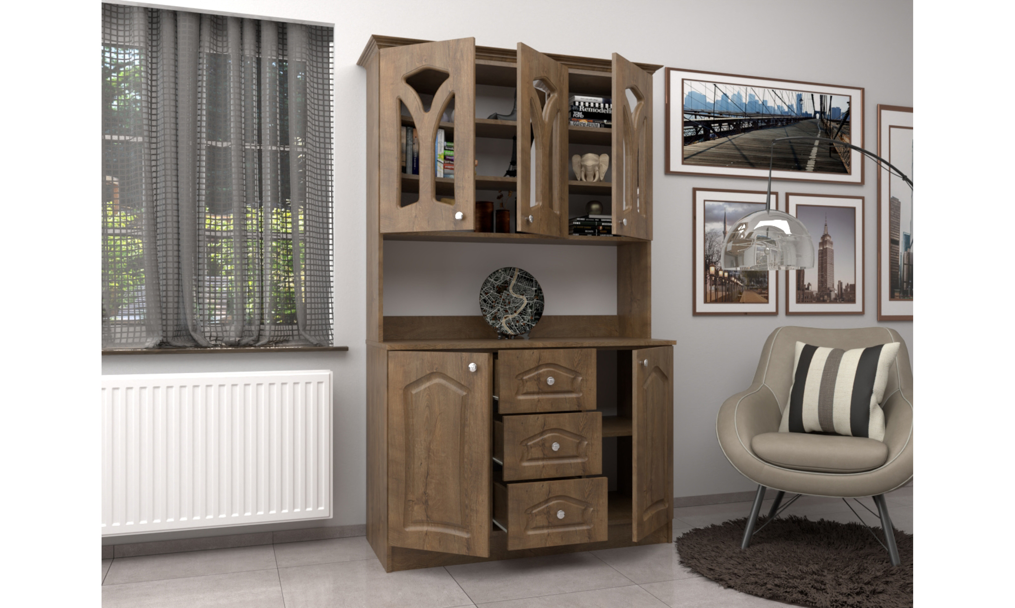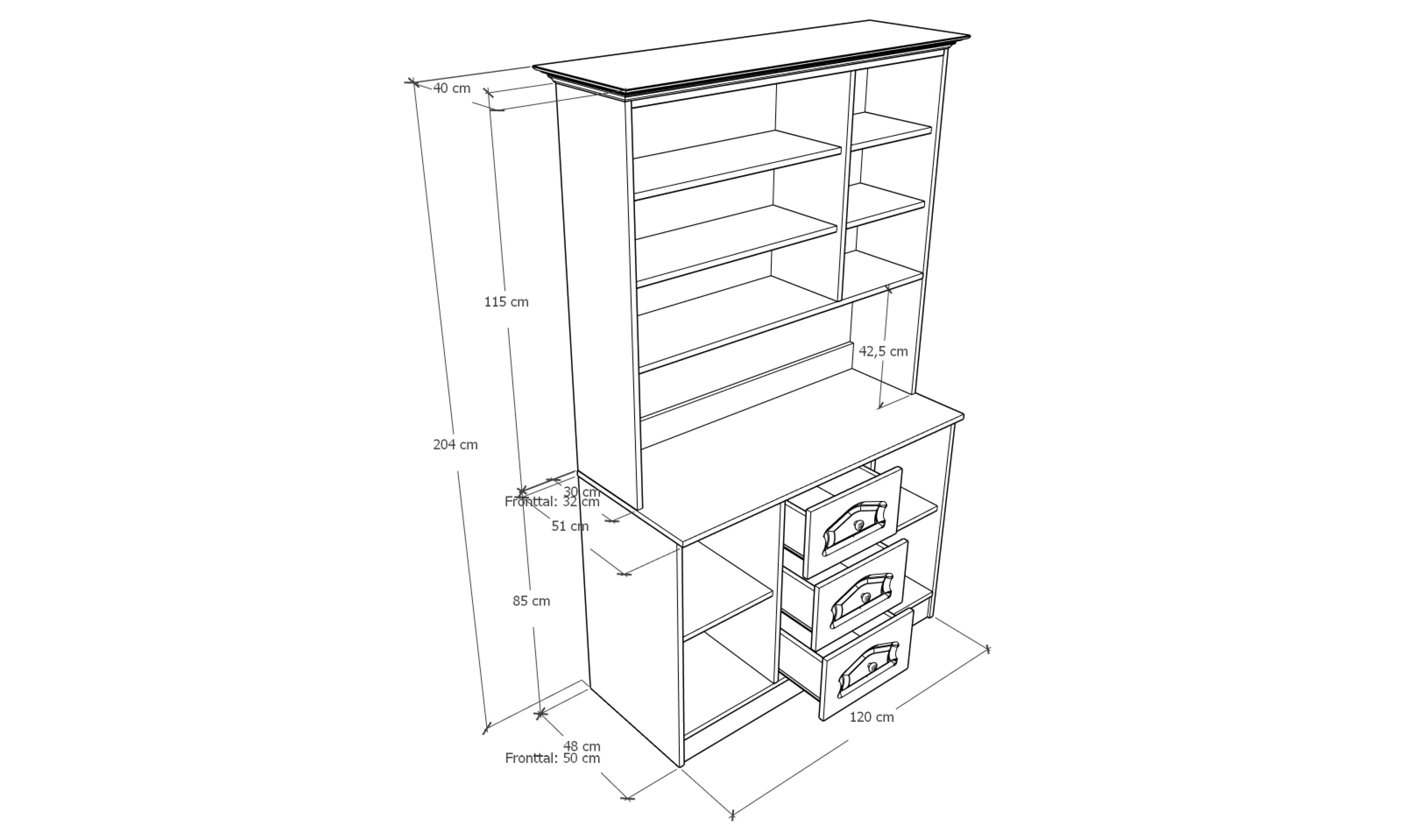 A tálalószekrény teljes szélessége 120 cm, magassága 205 cm, az alsó szekrény teljes mélysége 51 cm. A tálalószekrény 18 mm-es laminált bútorlapból ABS élzárással és köldökcsapozással készül. A hátfal a zárt és nyitott részeken fehér 2,5 mm-es HDF lemez, mely tűzőkapoccsal van rögzítve. A fiók fém fiókcsúszóval készül. A tálalószekrény átlátszó üveggel készül. Az ajtók 16 mm-es, belső oldalt fehérrel laminált, frontoldalt 3D bemarással 0,4 mm vastag vákumfóliázott MDF-ből készül választható színekből.