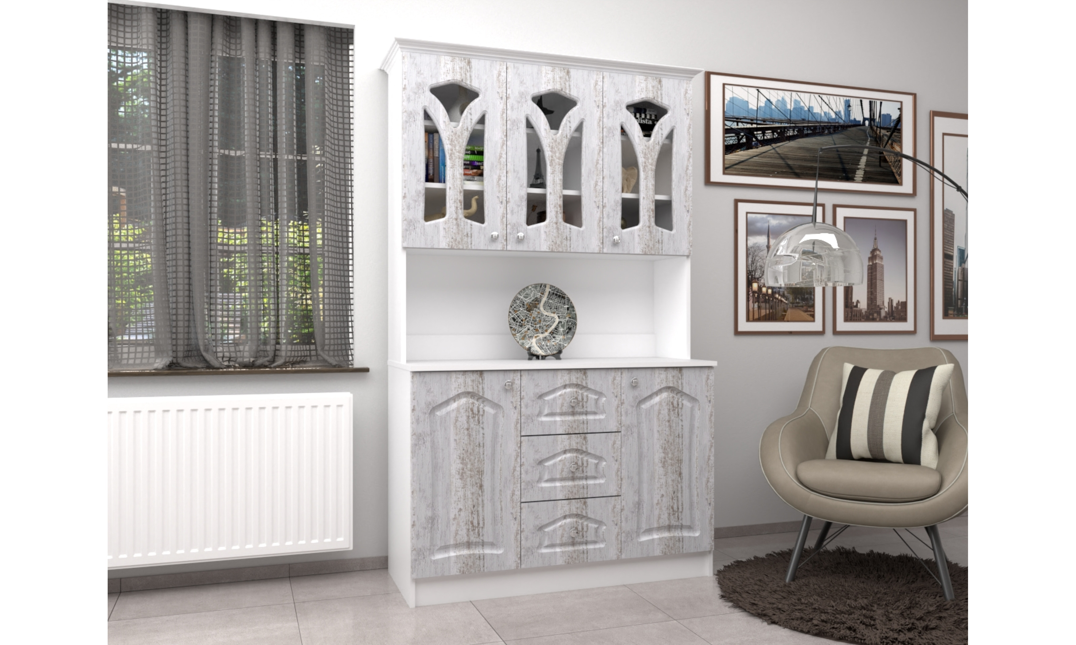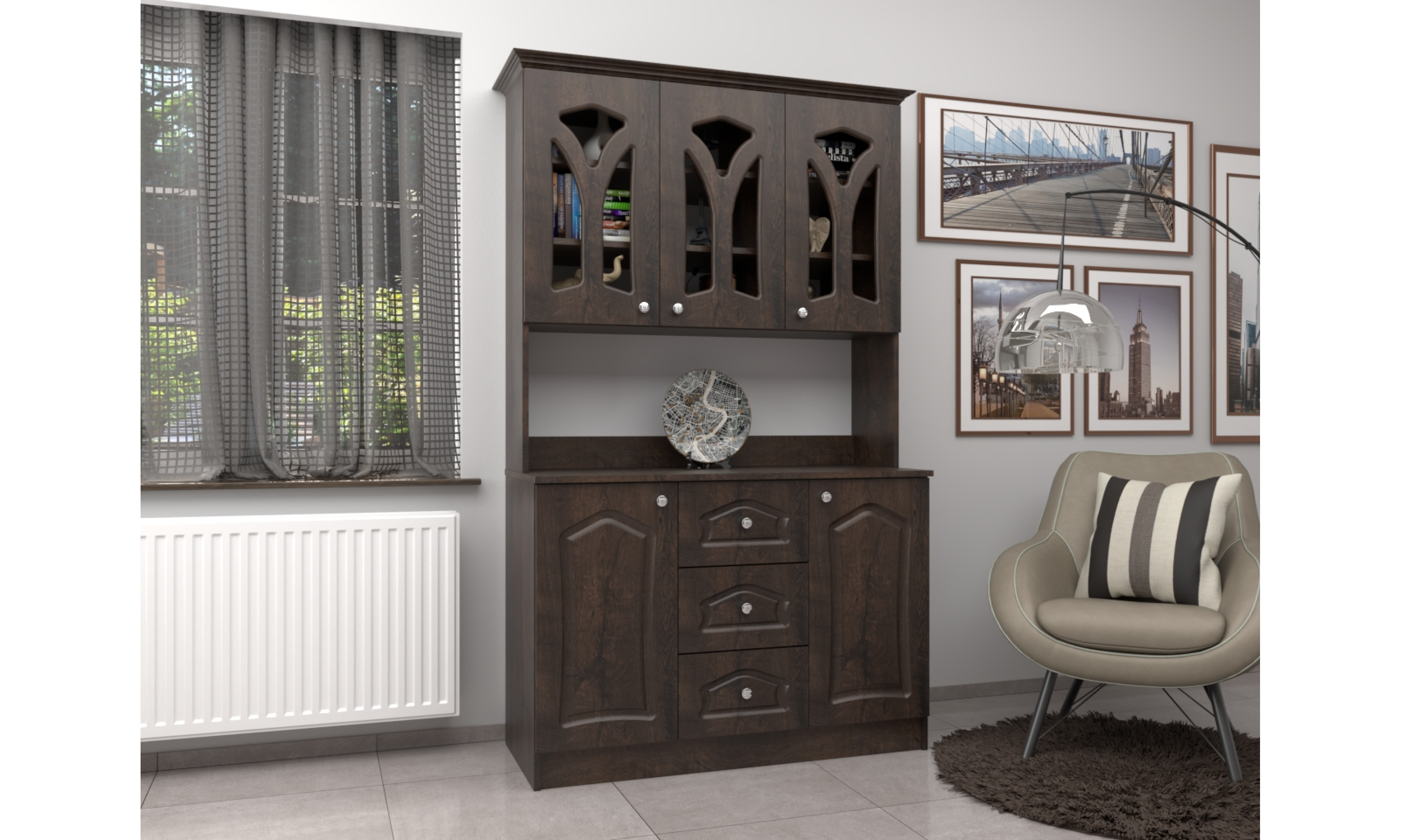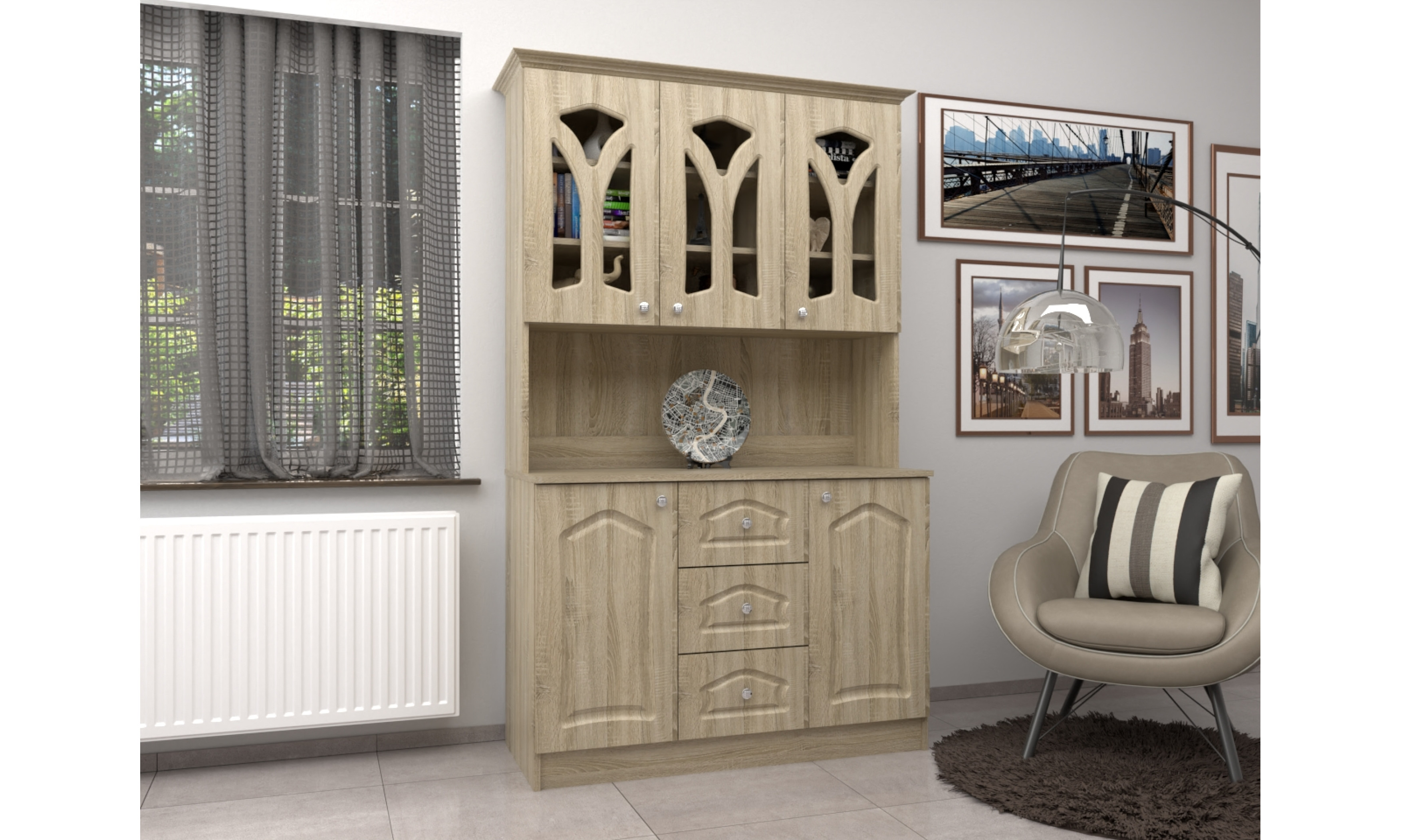 A tálalószekrény teljes szélessége 120 cm, magassága 205 cm, az alsó szekrény teljes mélysége 51 cm. A tálalószekrény 18 mm-es laminált bútorlapból ABS élzárással és köldökcsapozással készül. A hátfal a zárt és nyitott részeken fehér 2,5 mm-es HDF lemez, mely tűzőkapoccsal van rögzítve. A fiók fém fiókcsúszóval készül. A tálalószekrény átlátszó üveggel készül. Az ajtók 16 mm-es, belső oldalt fehérrel laminált, frontoldalt 3D bemarással 0,4 mm vastag vákumfóliázott MDF-ből készül választható színekből.