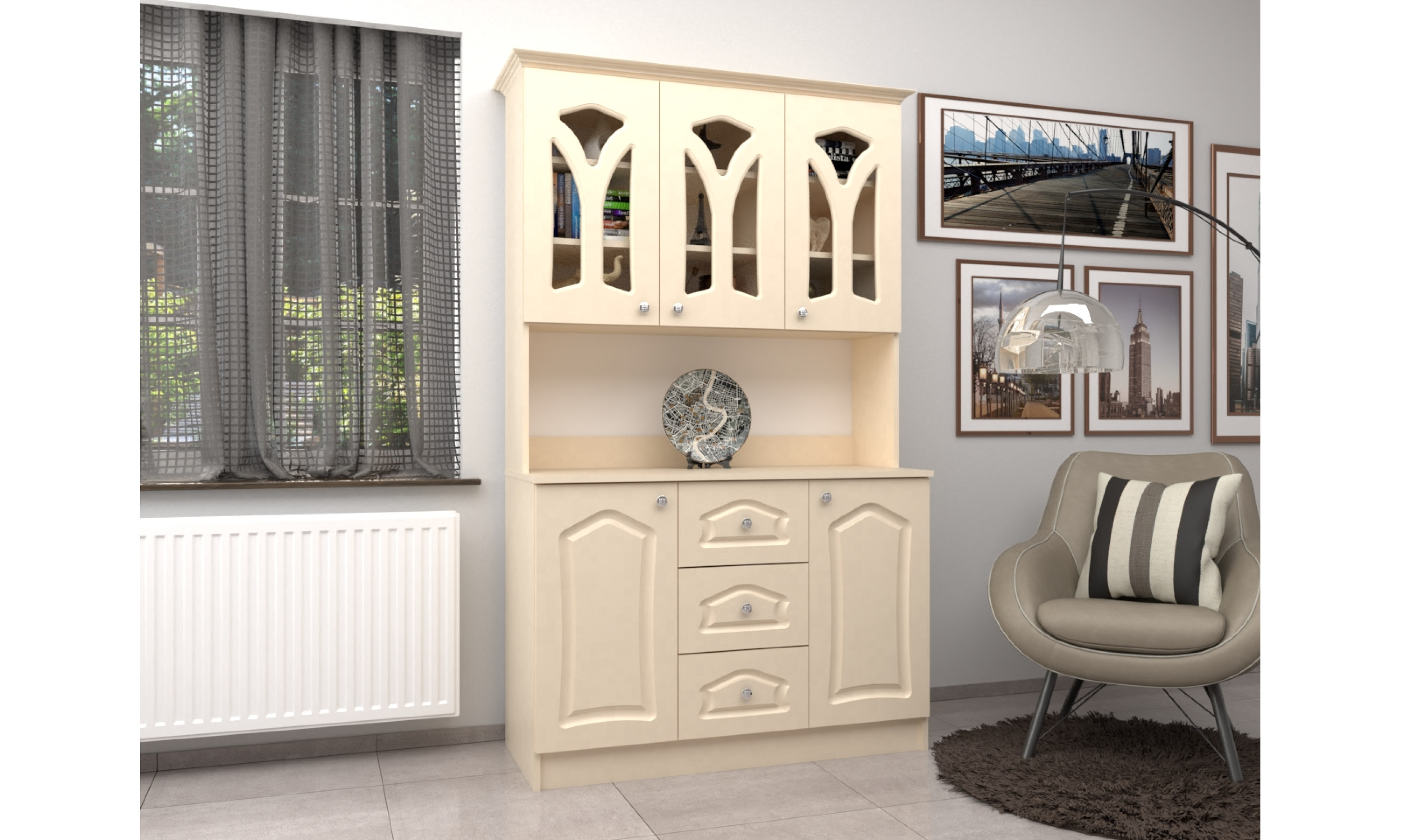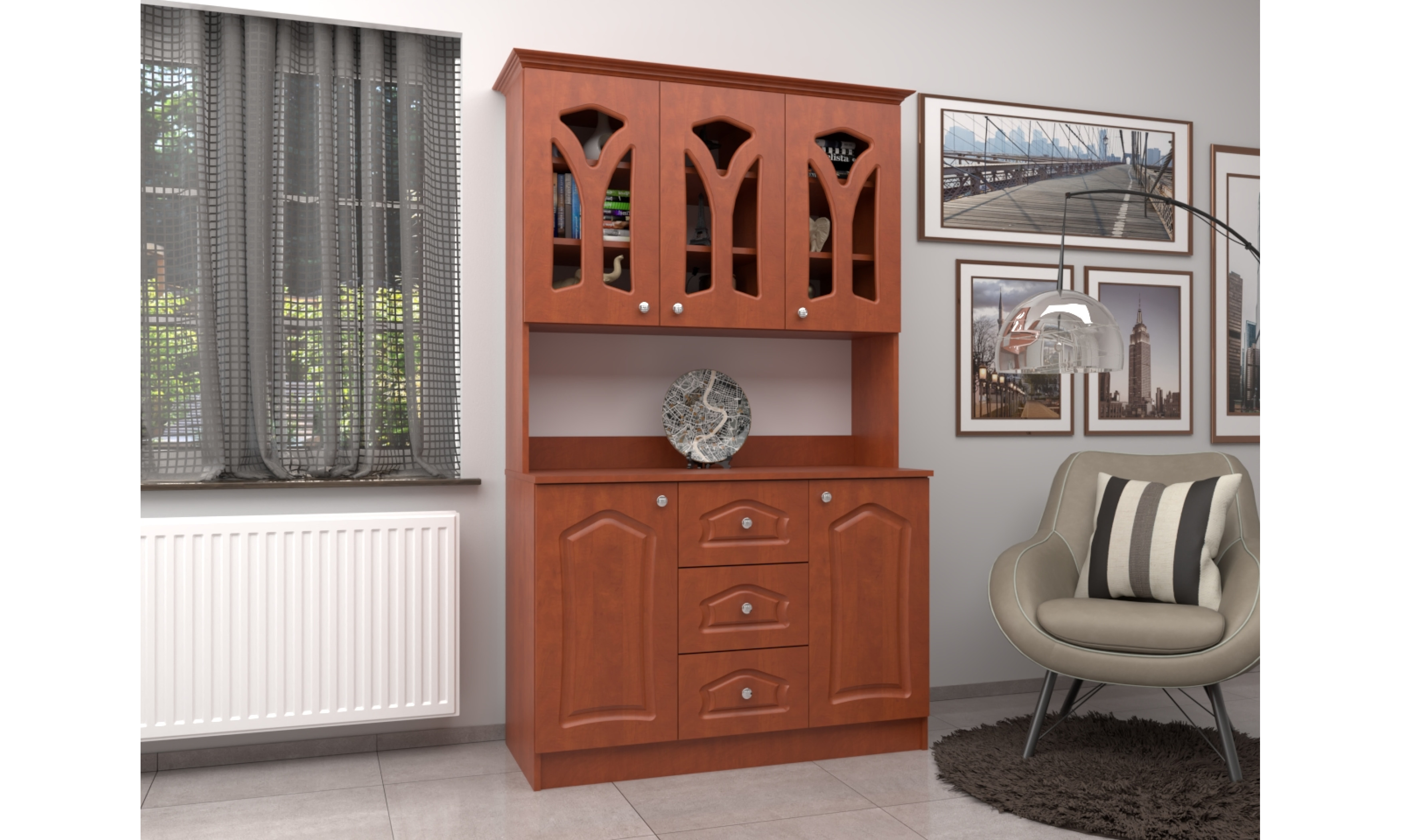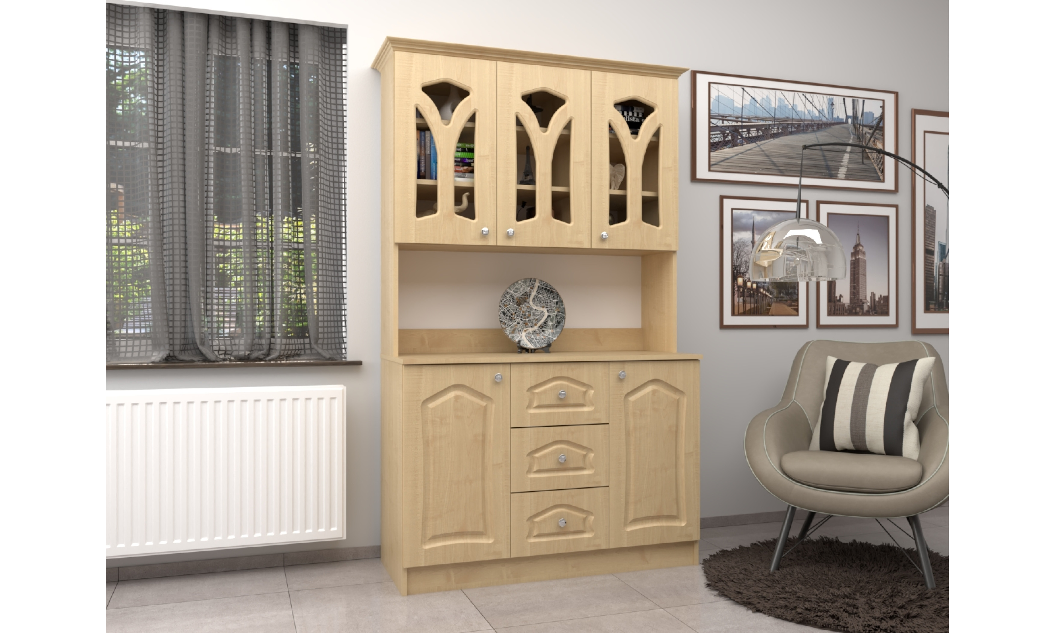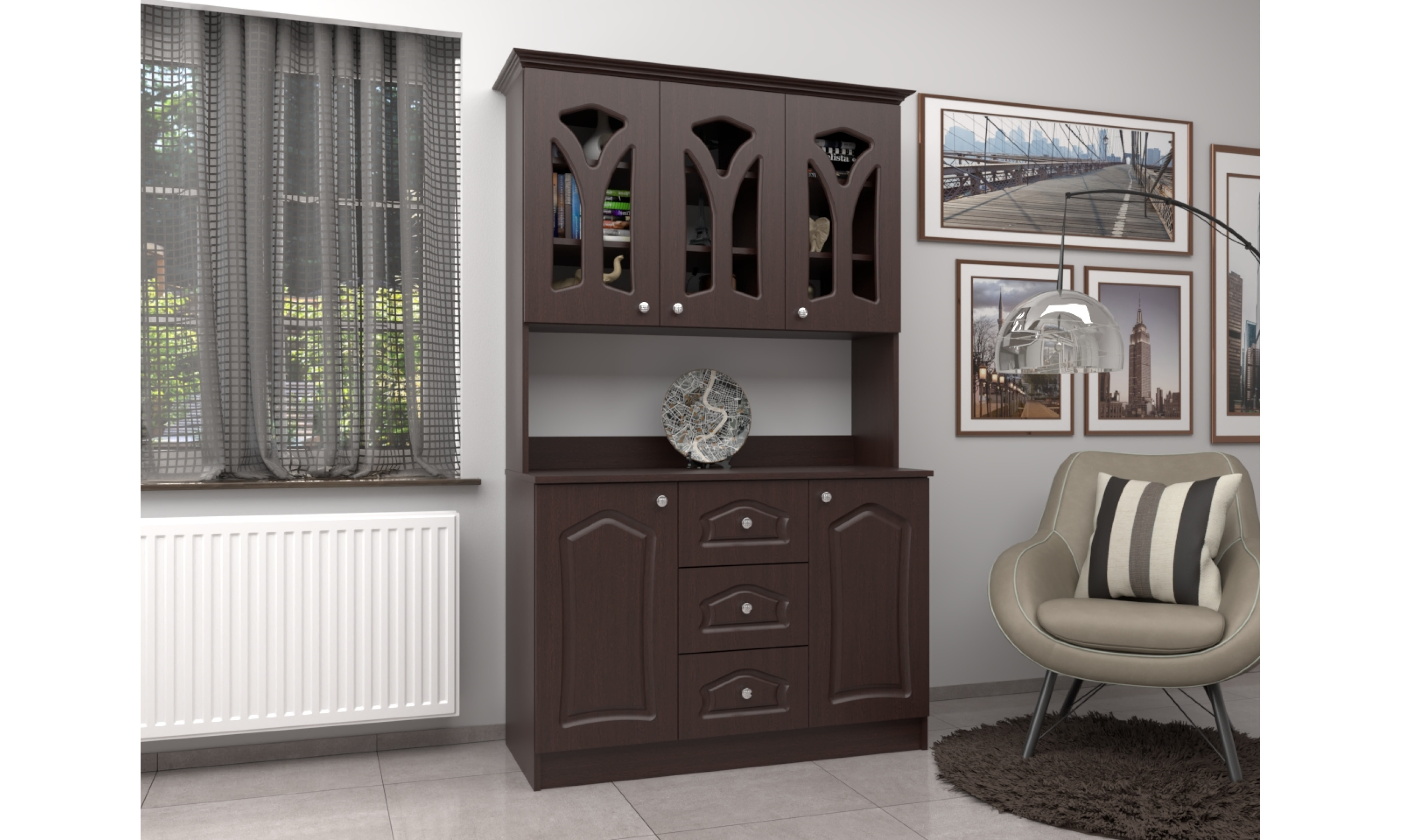 A tálalószekrény teljes szélessége 120 cm, magassága 205 cm, az alsó szekrény teljes mélysége 51 cm. A tálalószekrény 18 mm-es laminált bútorlapból ABS élzárással és köldökcsapozással készül. A hátfal a zárt és nyitott részeken fehér 2,5 mm-es HDF lemez, mely tűzőkapoccsal van rögzítve. A fiók fém fiókcsúszóval készül. A tálalószekrény átlátszó üveggel készül. Az ajtók 16 mm-es, belső oldalt fehérrel laminált, frontoldalt 3D bemarással 0,4 mm vastag vákumfóliázott MDF-ből készül választható színekből.