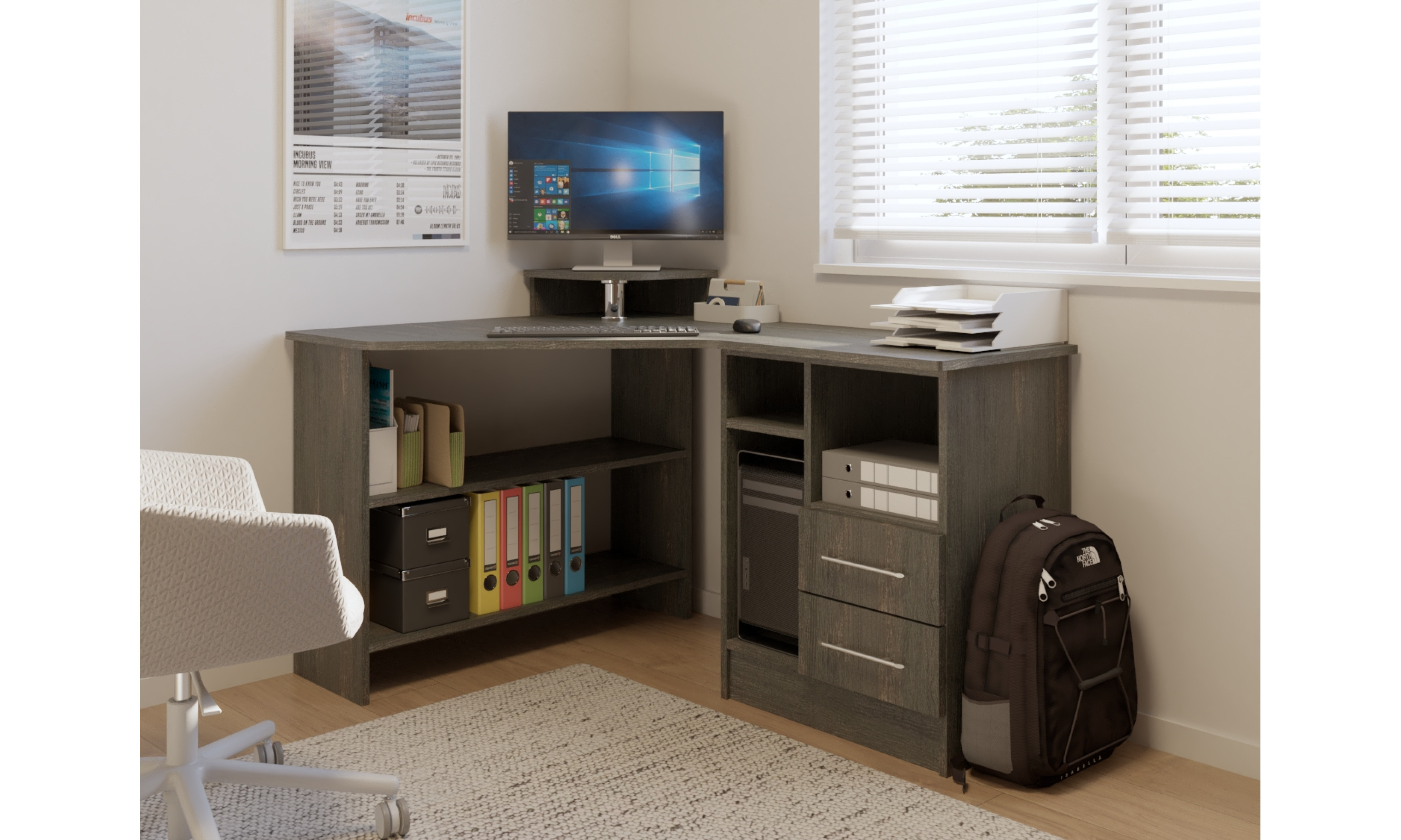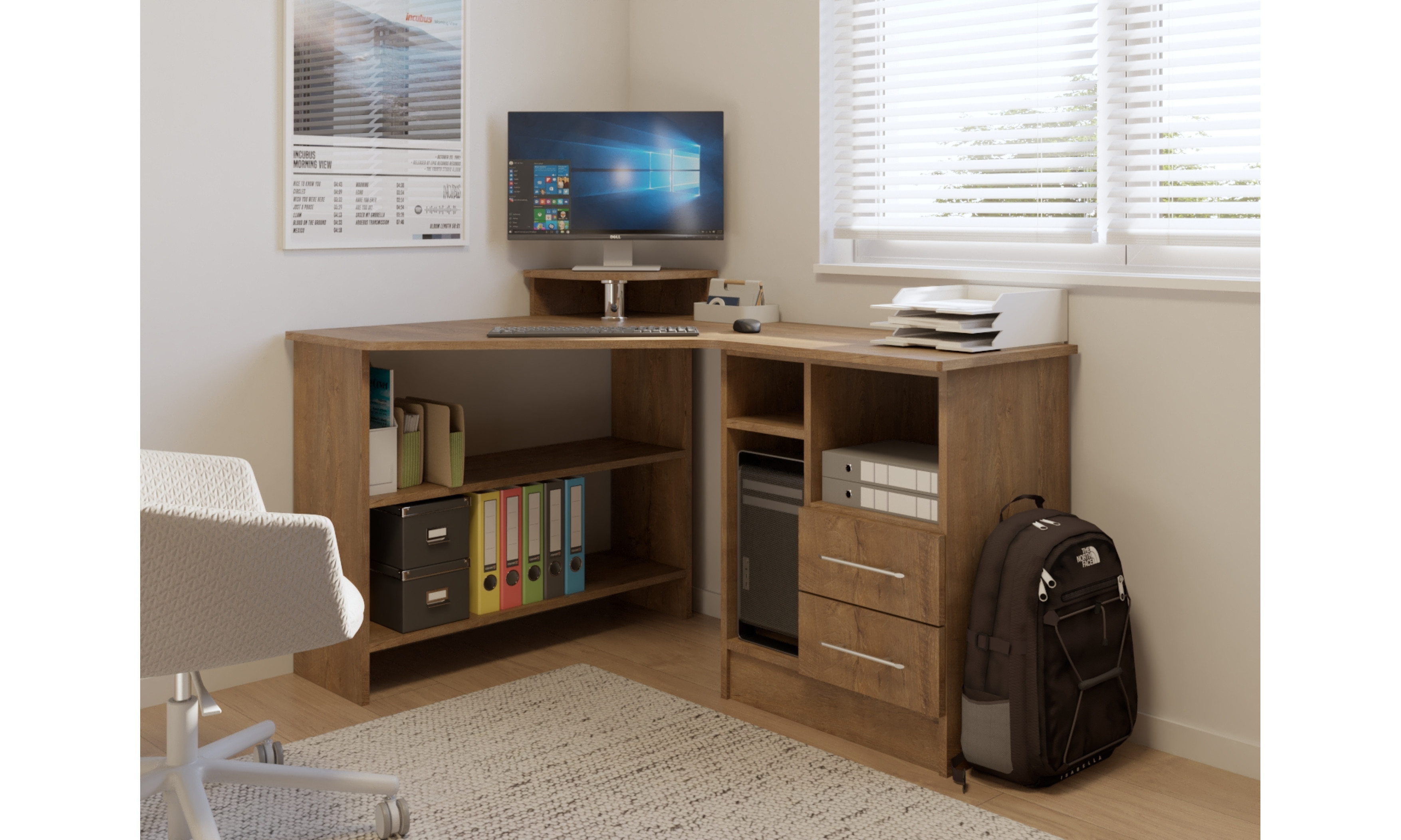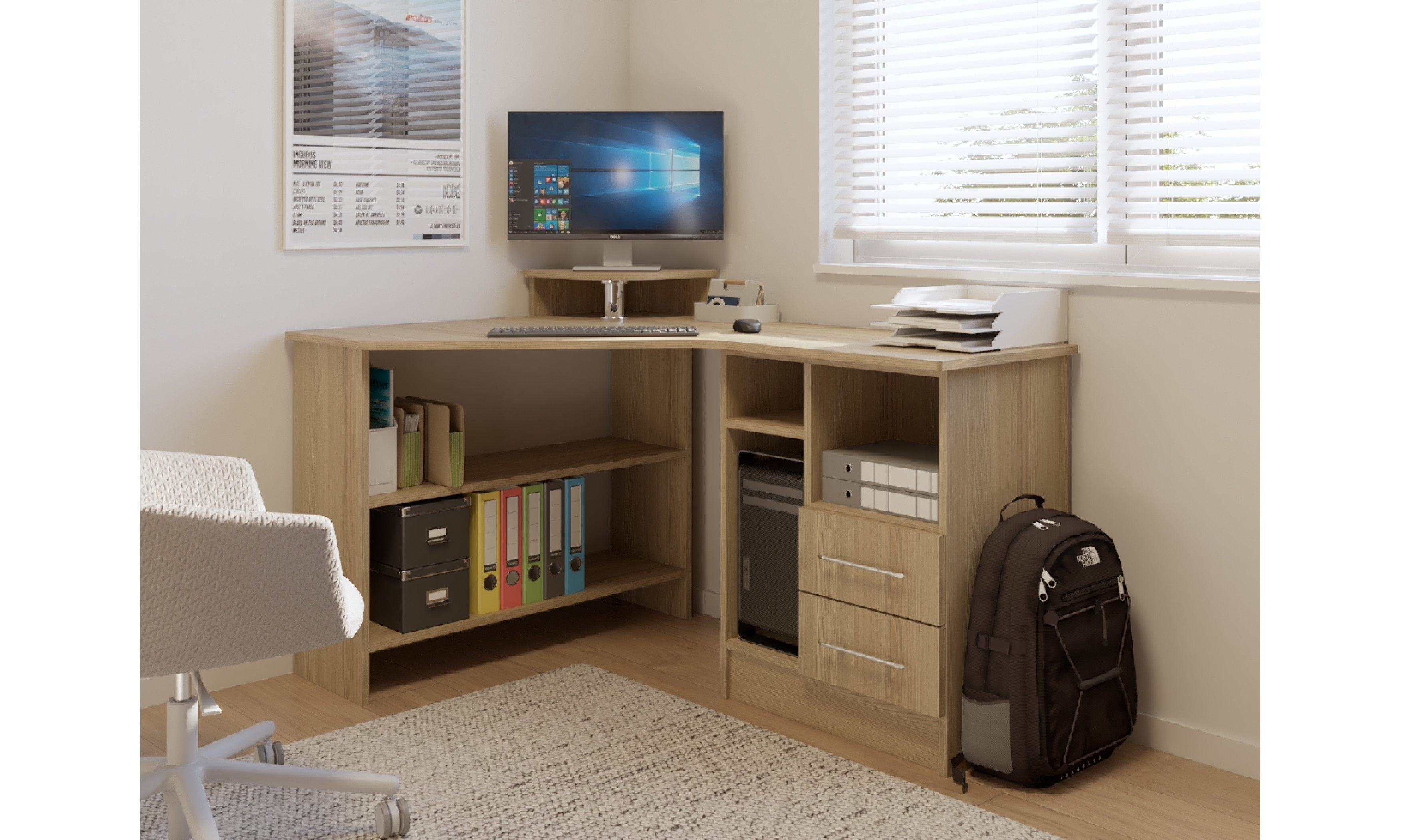 Az íróasztal mérete 100 x 140 cm, magassága 89 cm. Az íróasztal 18 mm-es laminált bútorlapból ABS élzárással és köldökcsapozással készül. (Az élzárás ABS élfóliával történik, kivéve az íves felületek, melyek technikailag papírfóliával vannak élzárva, melynek színe eltérhet az ABS színétől.) Az íróasztal hátfal nélkül készül. A fiók fém fiókcsúszóval készül. A fiókelő szintén 18 mm-es bútorlapból készül.