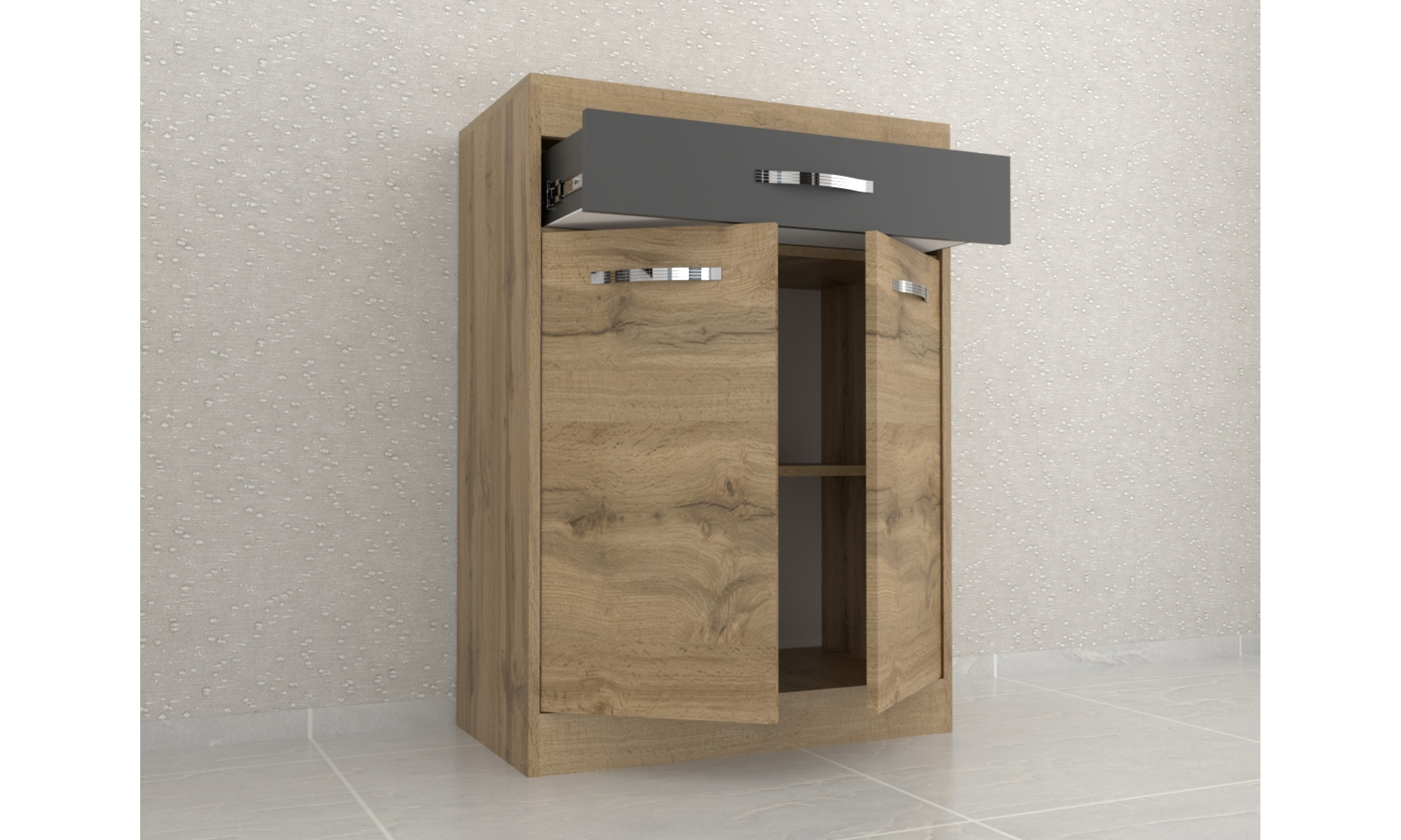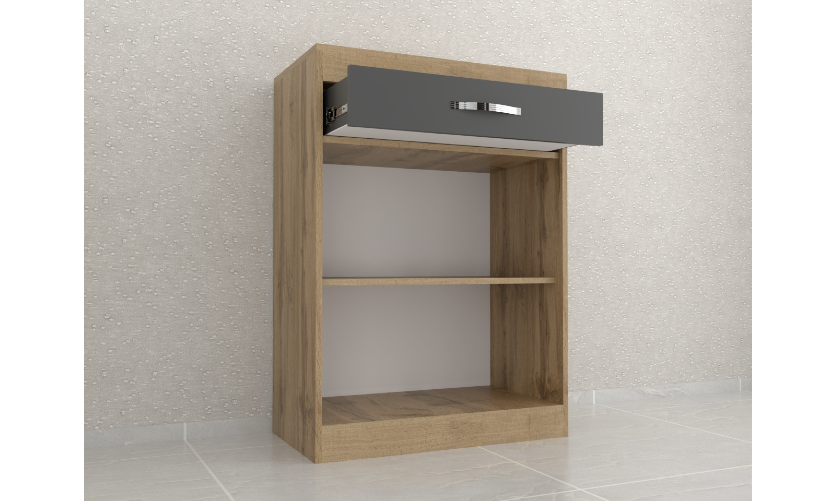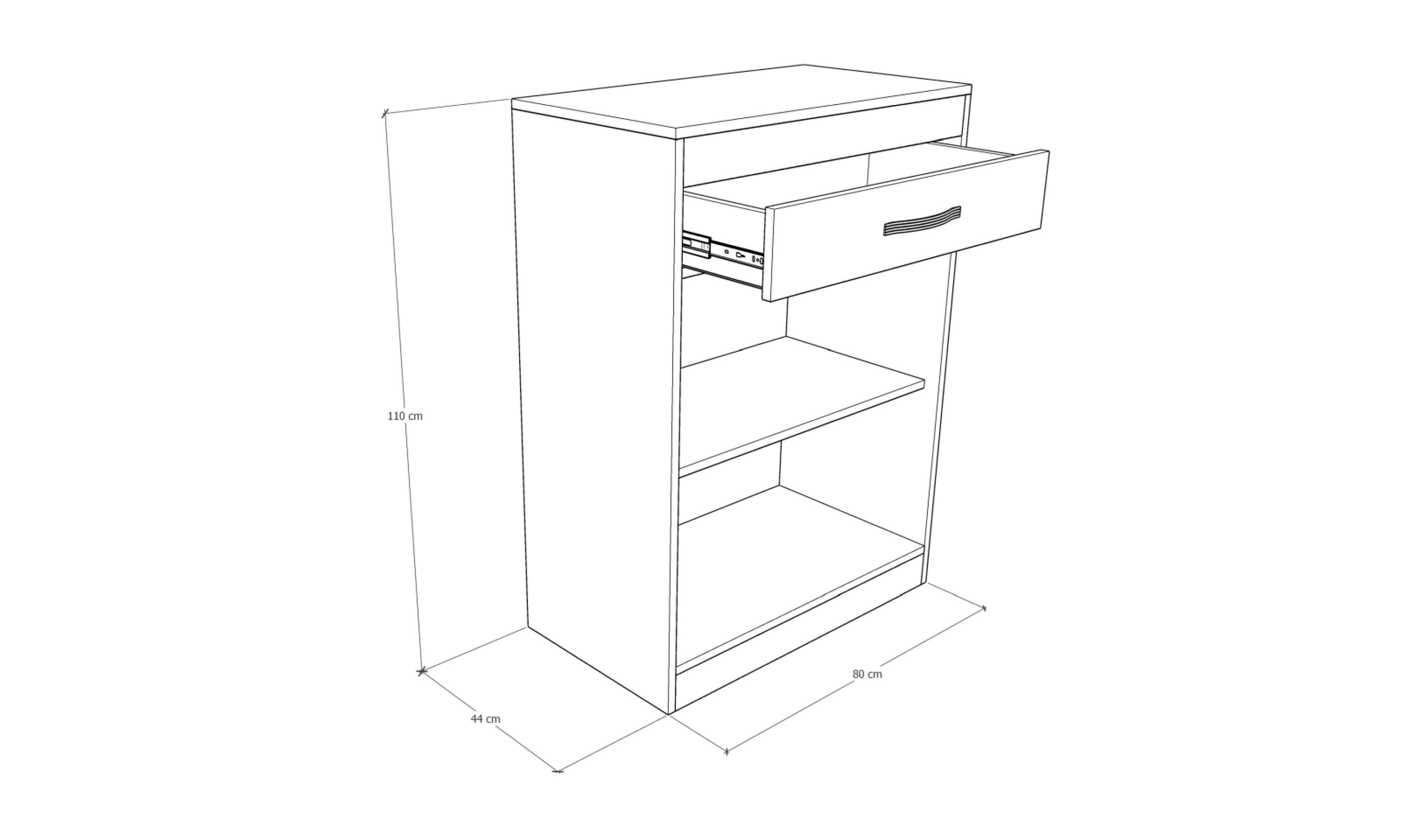 A szekrénysor 18 mm-es laminált bútorlapból ABS élzárással és köldökcsapozással készül. A hátfal a zárt részeken fehér, a nyitott részeken színes /de színben és árnyalatban eltérhet a korpusz színétől/ 2,5 mm-es HDF lemez, mely tűzőkapoccsal van rögzítve. A fiók csapágyas fióksínnel készül. Az ajtó szintén 18 mm-es bútorlapból készül.
